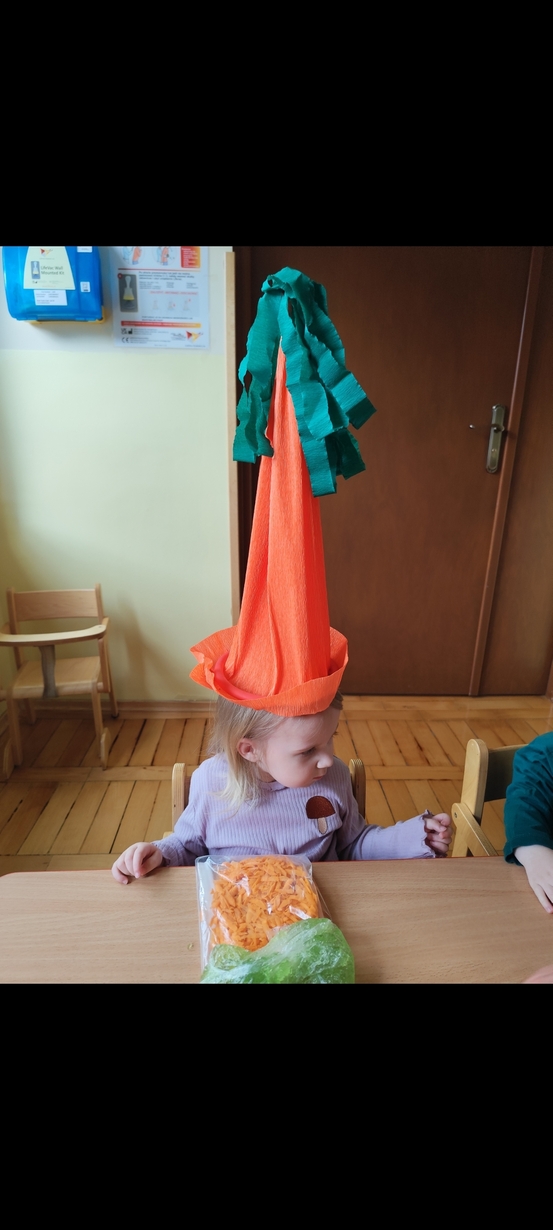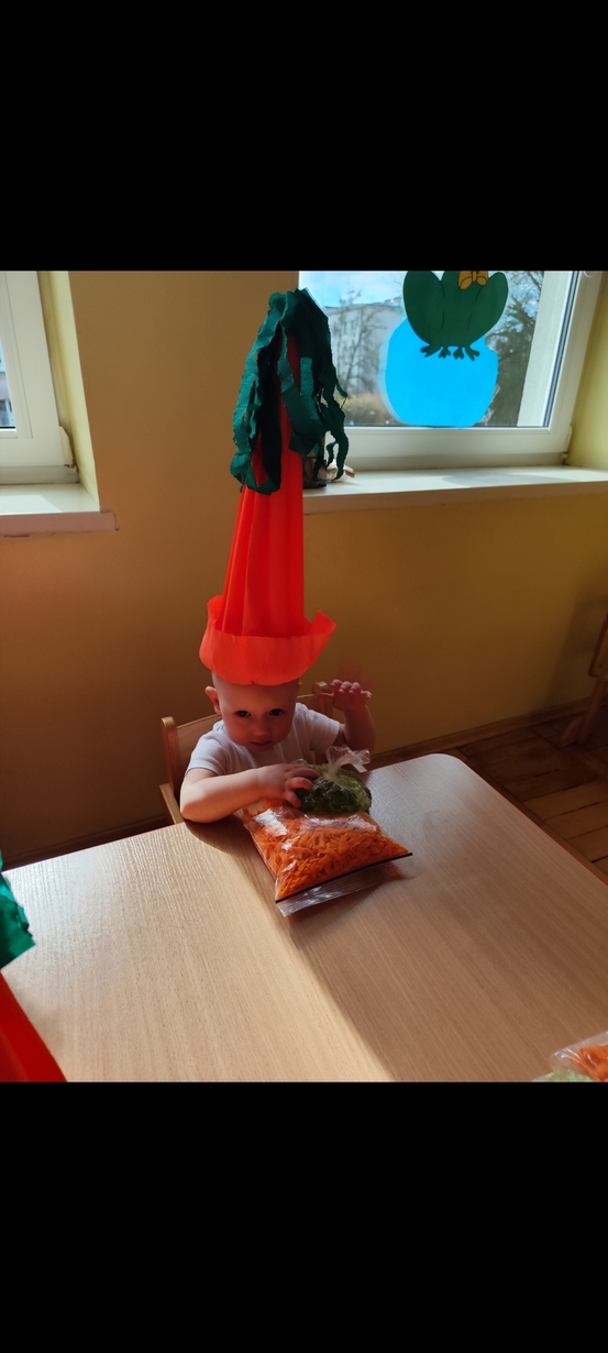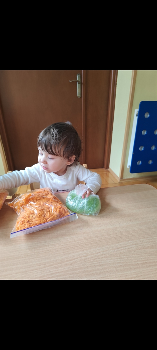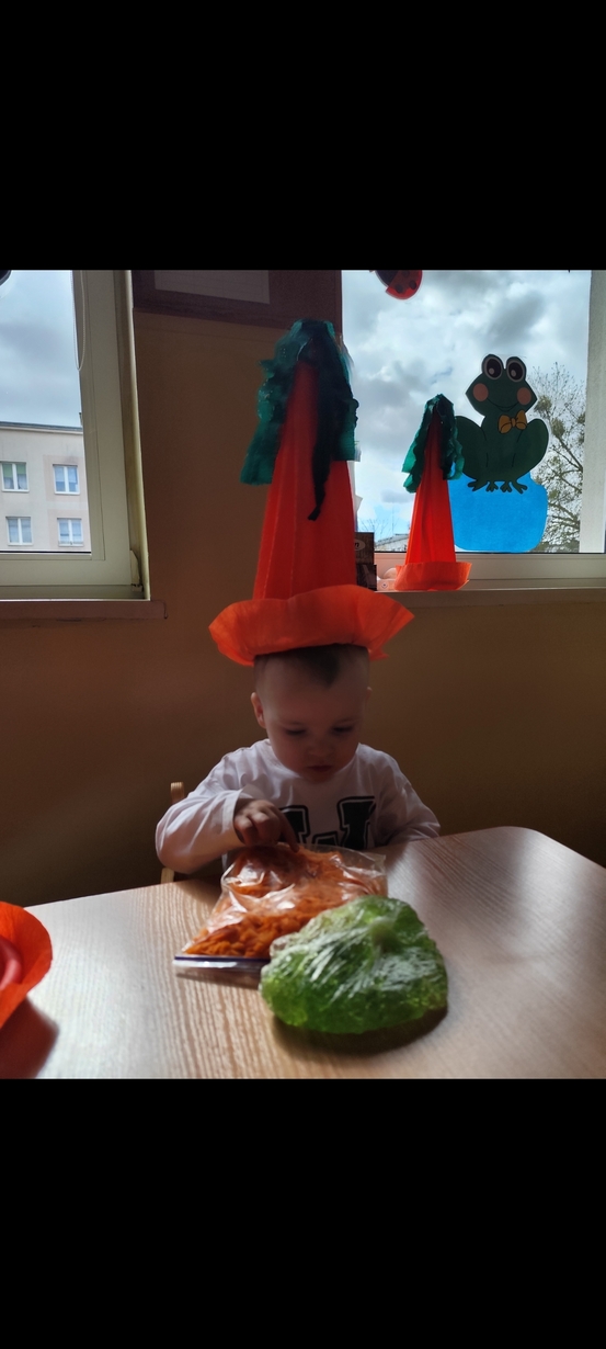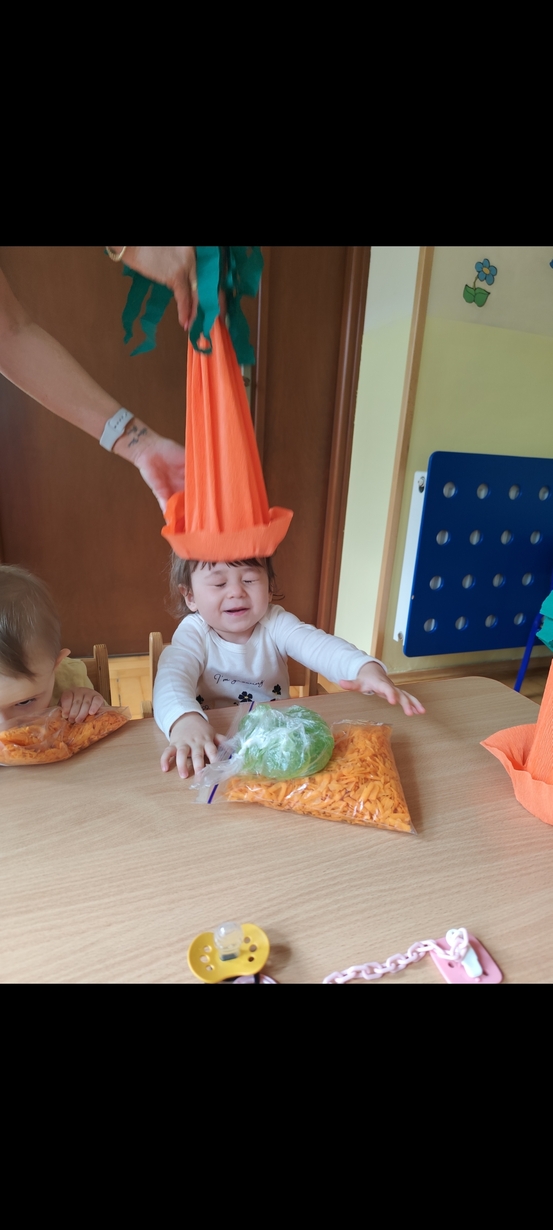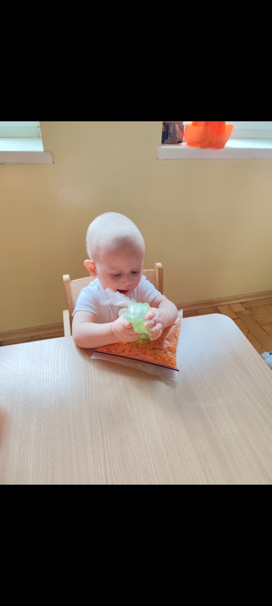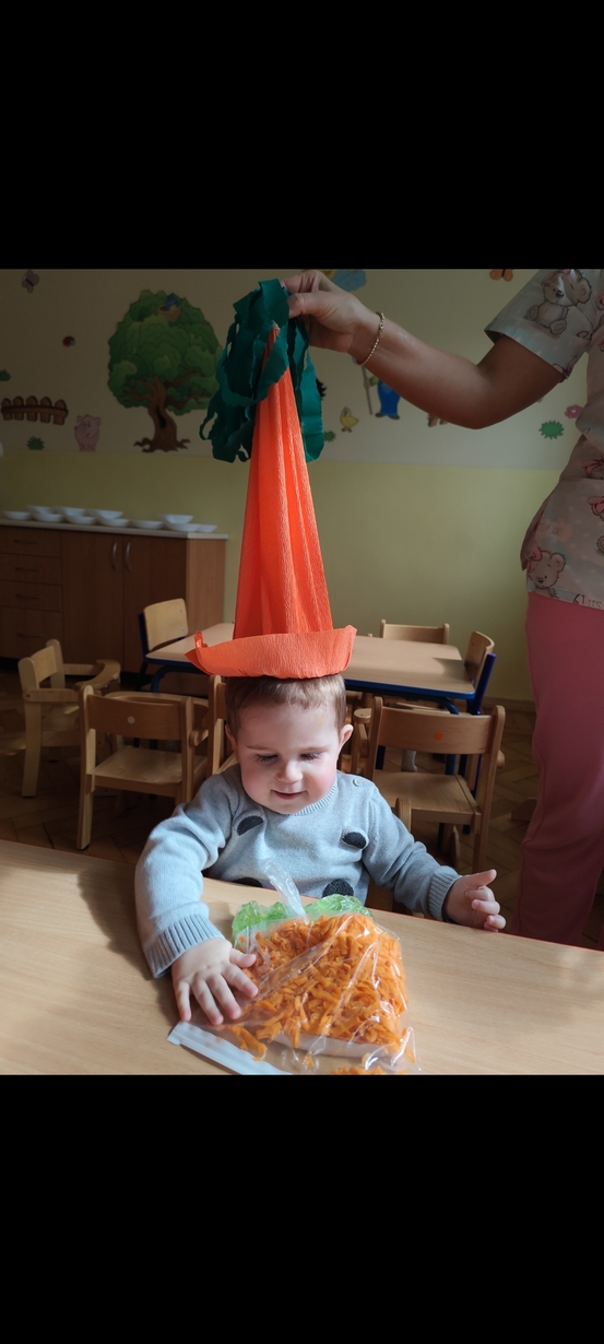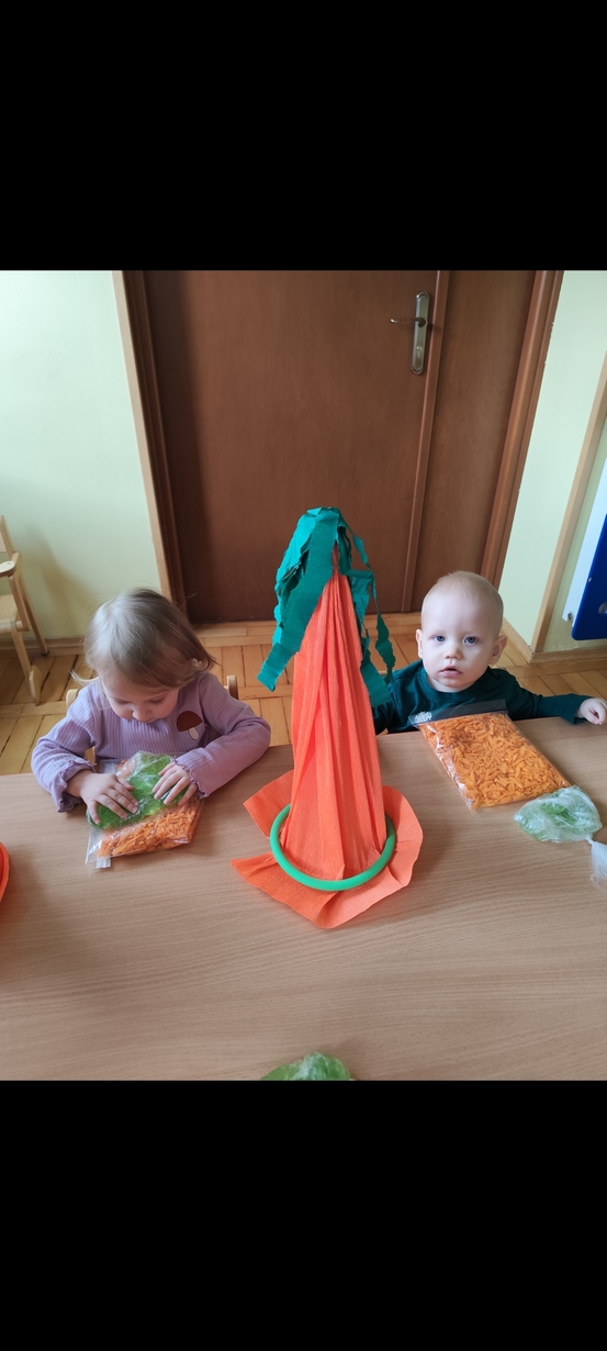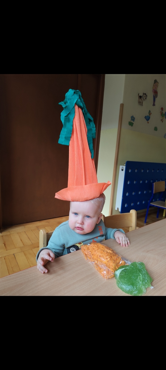 Dzisiaj nasze dzieciaczki ćwiczyły motorykę duzą. Za pomocą różnych struktur wykonanych z tartej marchewki i zielonej galaretki próbowały formować kształt marchewki.