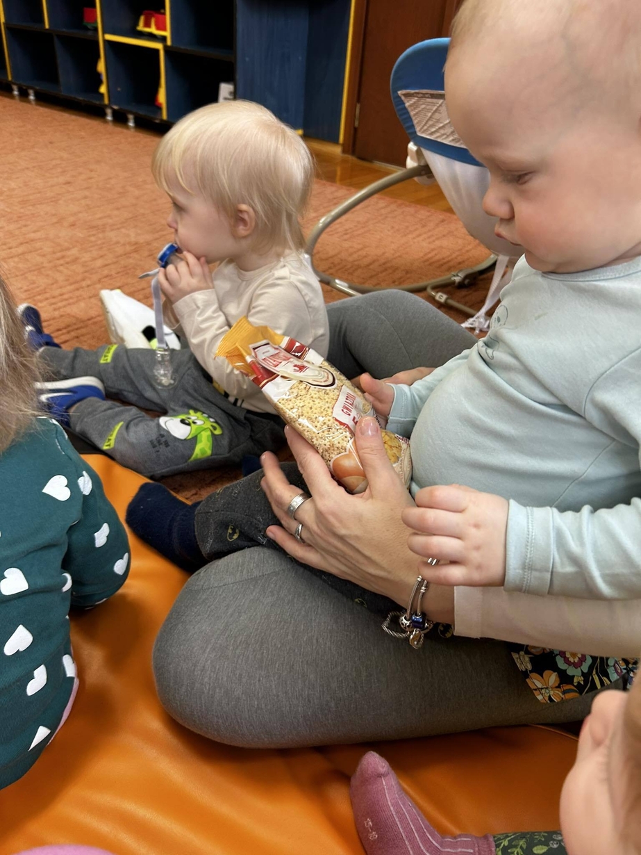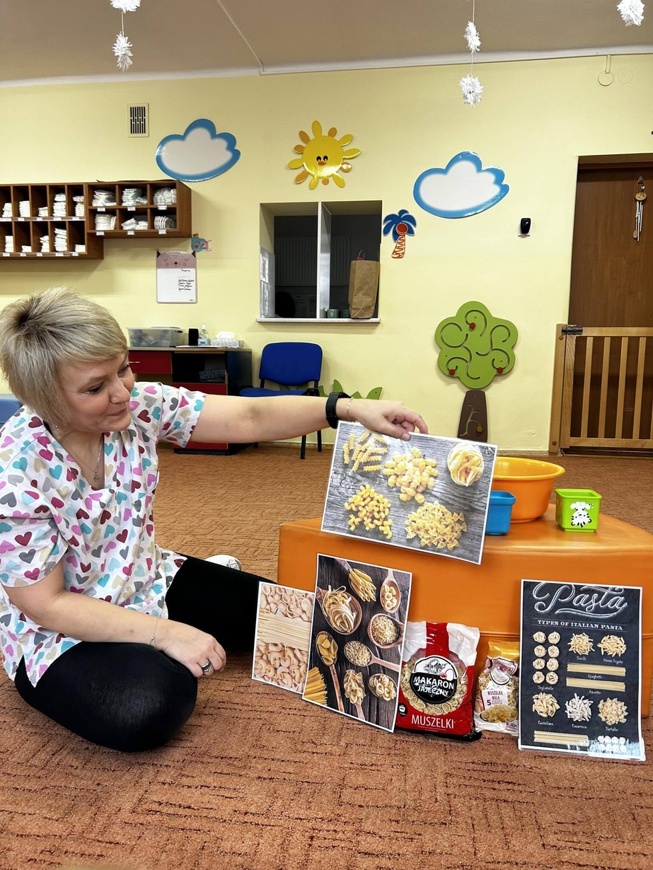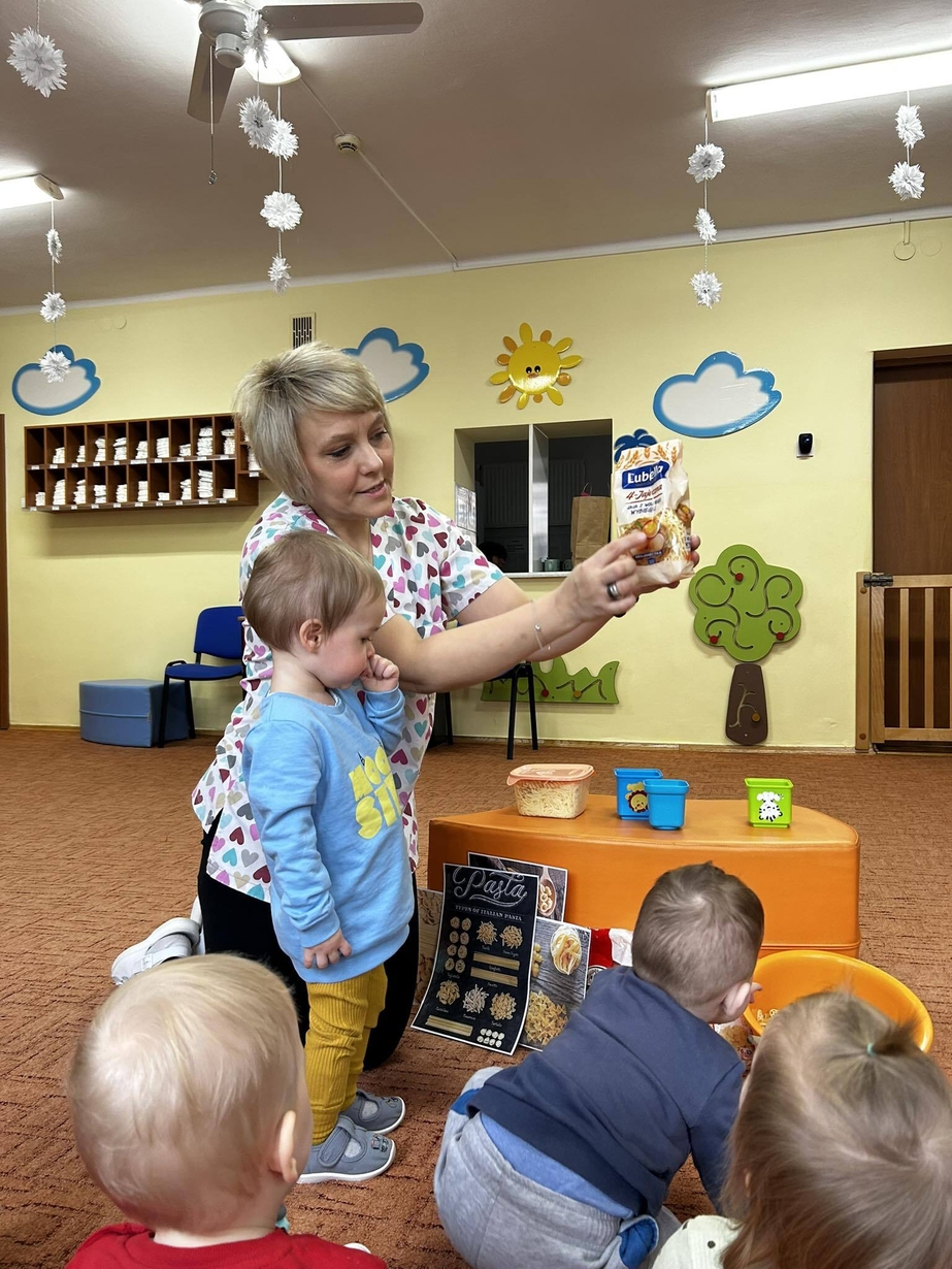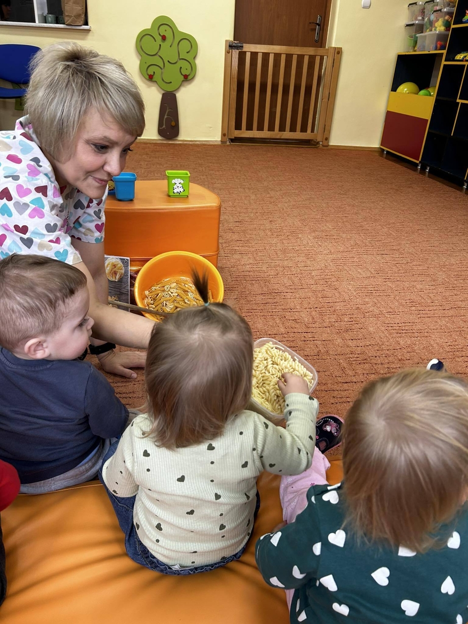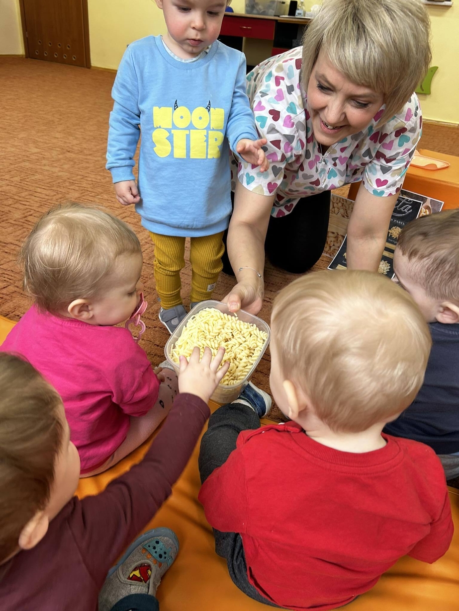 Na piedestale i jako danie główne były makarony, maluszki mogły zamieszać makaron, dotknąć nawet ugotowany makaron.