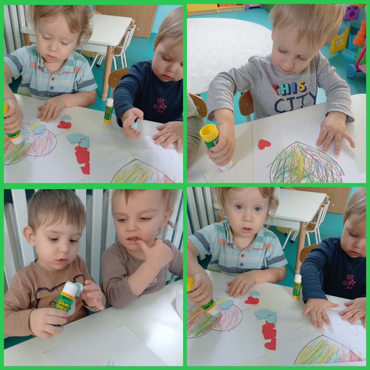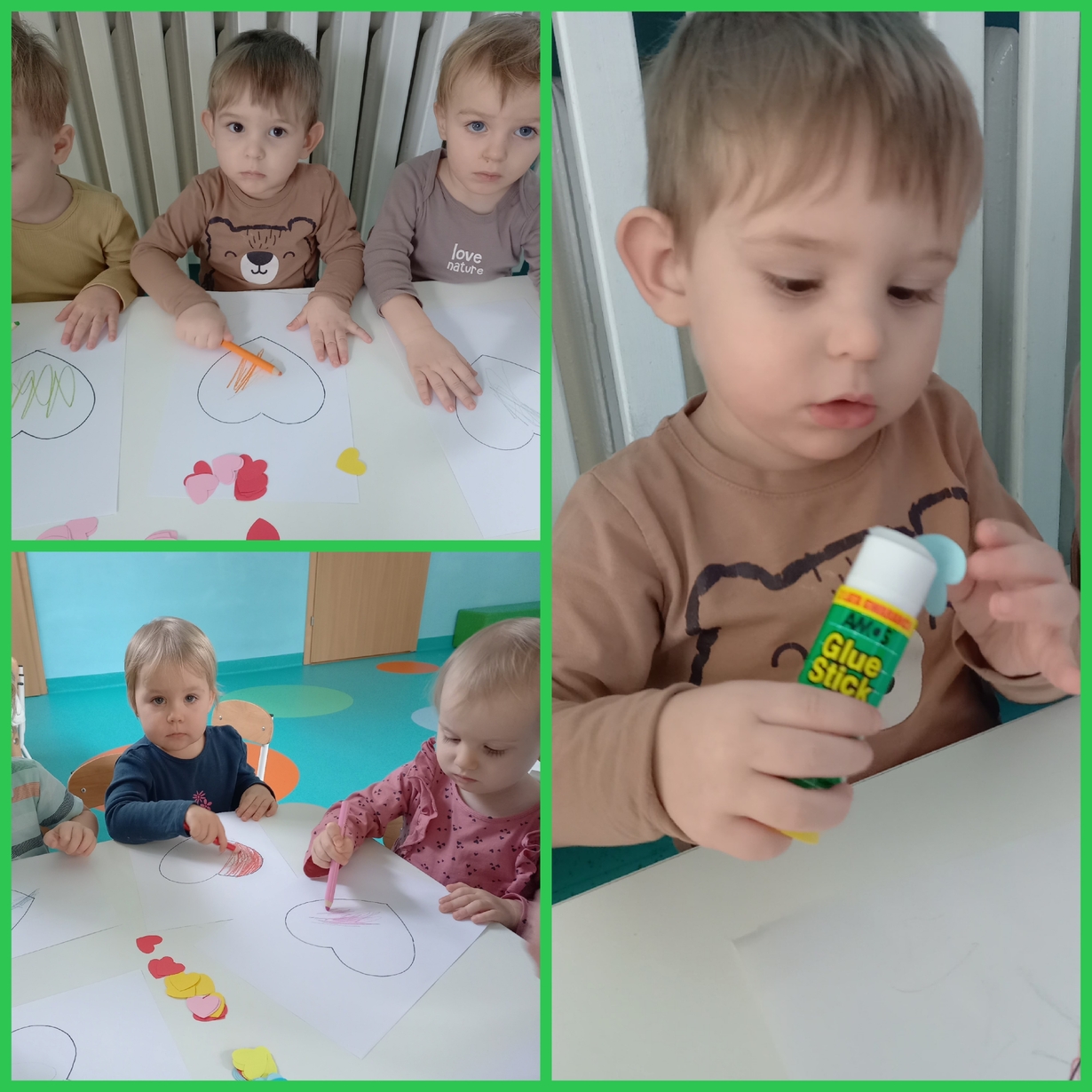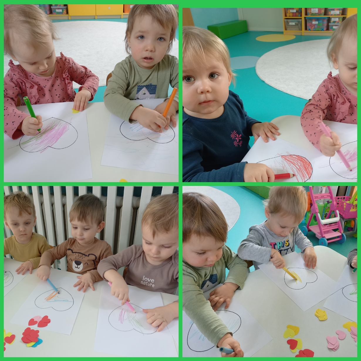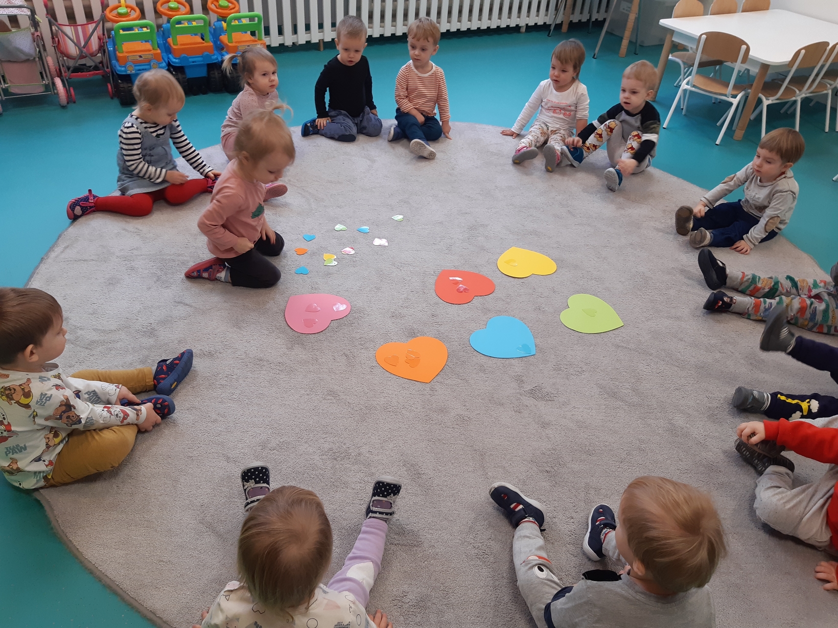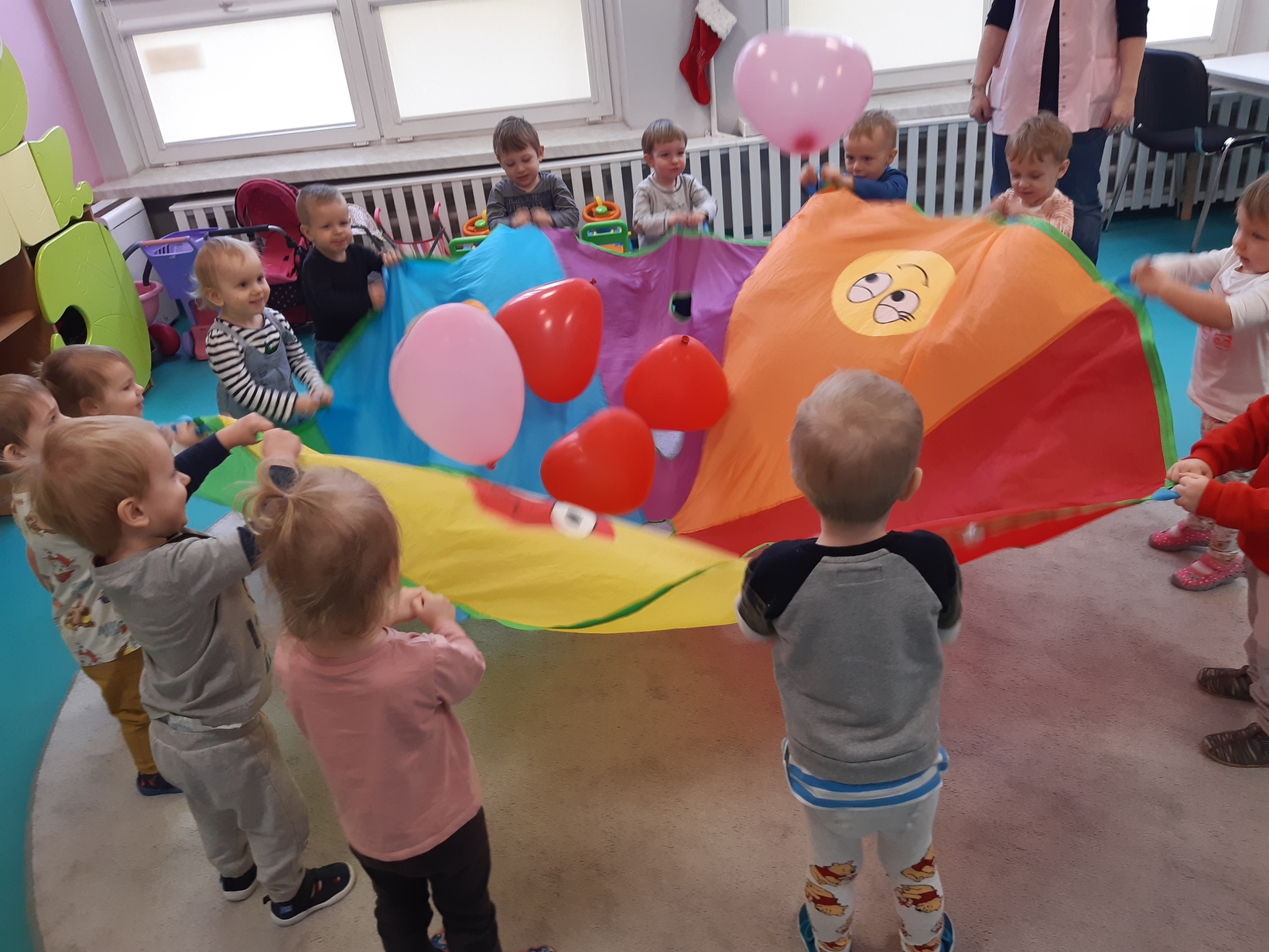 Dziś 14 lutego na grupie Żabki obchodziliśmy Walentynki. Tuż po śniadaniu w ramach pogadanki dzieci poznały tradycje walentynkowe oraz dowiedziały się jak ważne jest okazywanie uczuć przyjażni i sympatii. Później nadszedł czas na przypomnienie sobie podstawowych kolorów poprzez dopasowywanie malutkich serduszek do odpowiadających im kolorów. Nasze Żabki wykonały także pracę plastyczną związaną z tematyką tego święta a mianowicie kolorowały kredkami oraz przyklejały kolorowe serduszka. Po zajęciach nadszedł czas na wspólną zabawę z chustą animacyjną oraz tańce przy piosenkach,,Walentynki, walentynki..", ,,Mała Ulijanko..." oraz pamiątkowe zdjęcia.