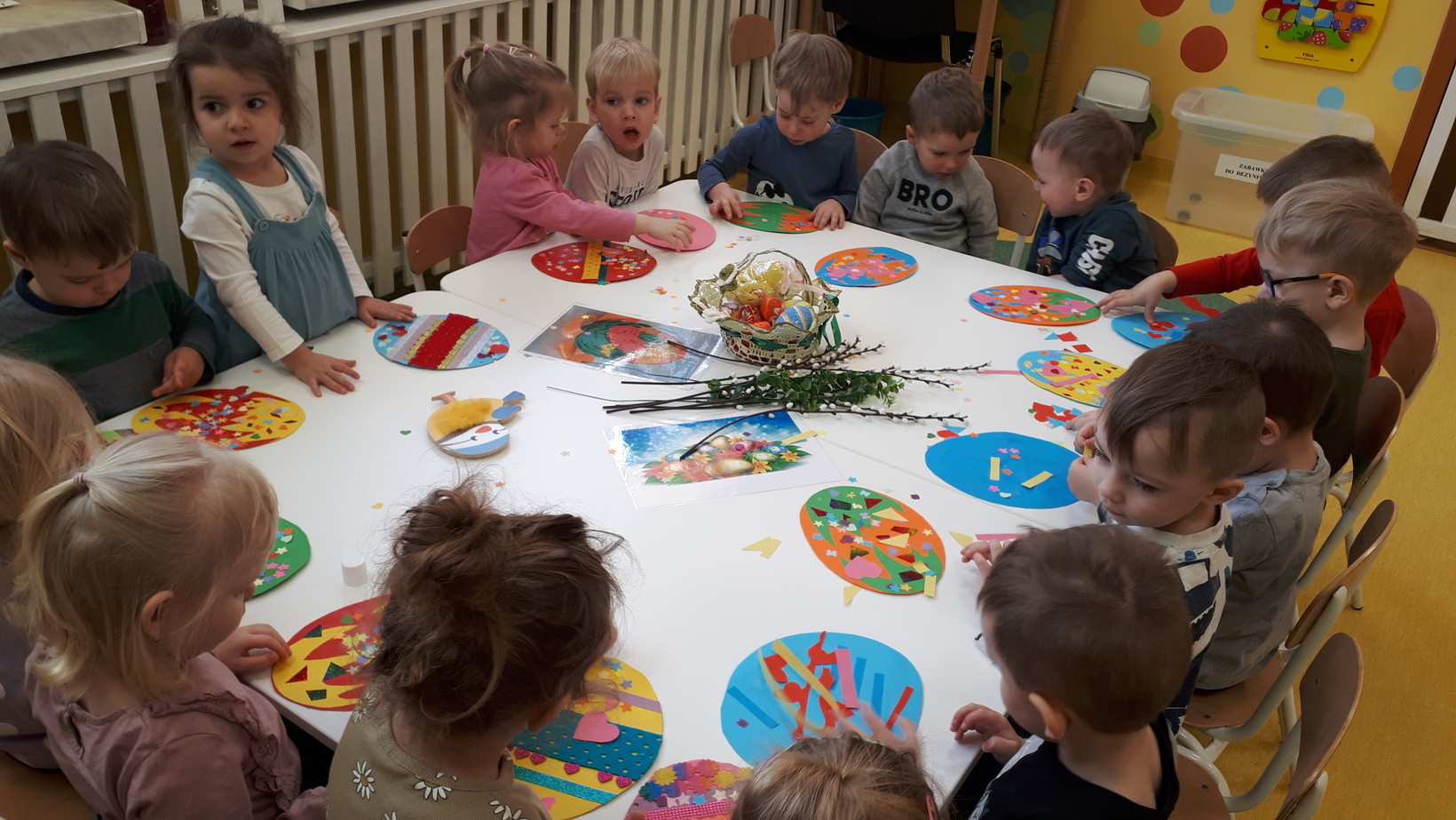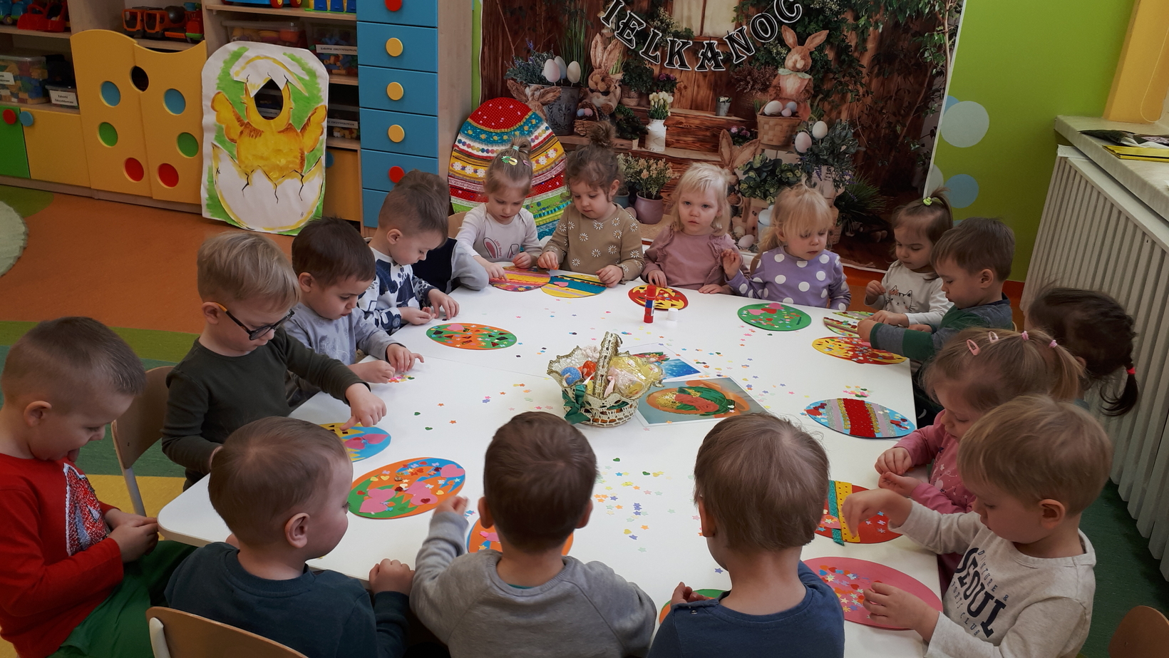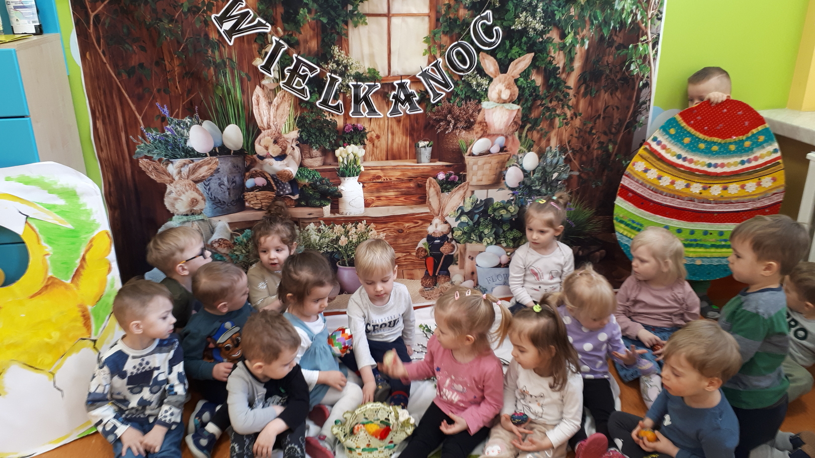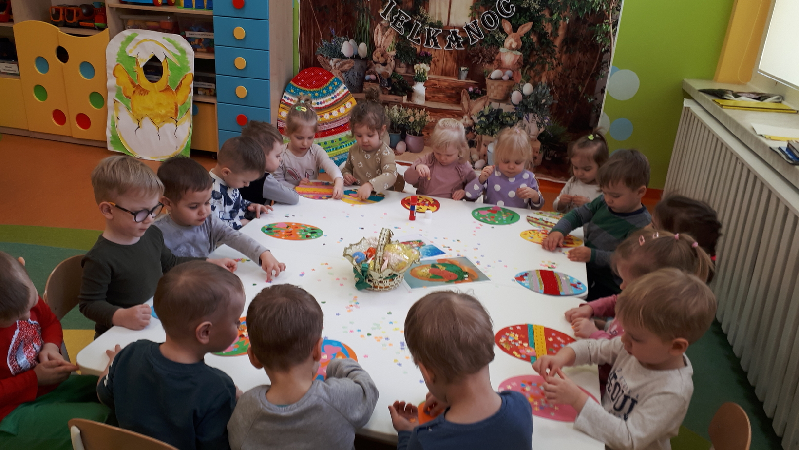 Wielkanoc to święto pełne tradycji i obyczajów. Tradycje sprawiają, że to święto staje się wyjątkowe, a świąteczne dni są bardziej radosne. W grupie naszych starszaków to właśnie dzisiaj dzieci miały okazję poznać zwyczaje i tradycje wielkanocne. Oglądały kolorowe pisanki, bazie, baranki a także zrobiliśmy zdjęcie z kurczaczkiem. Każde dziecko udekorowało swoją pisankę. Wiele radości sprawiła zabawa dydaktyczna pt.,, Wielkanocny koszyk", która pokazała dzieciom co powinno znaleźć się w koszyczku niesionym do święcenia. Dzień ten sprawił dzieciom wiele radości i uśmiechu.