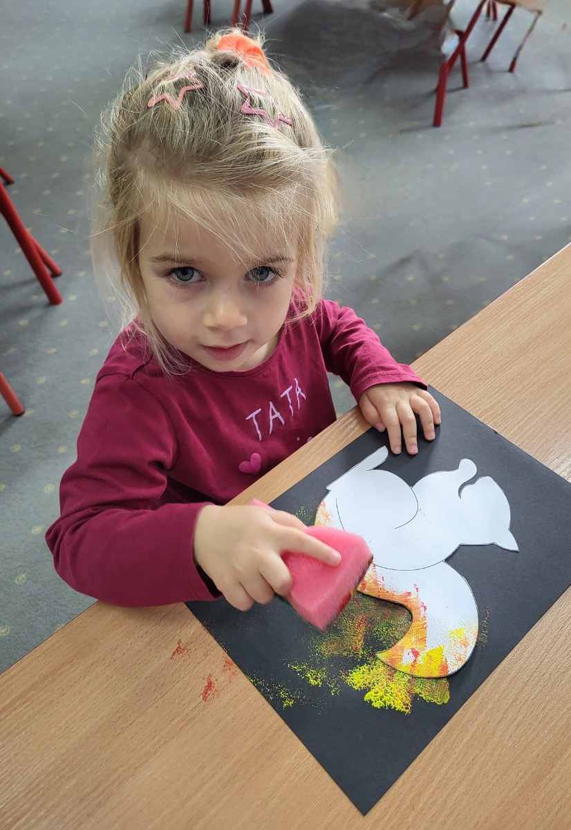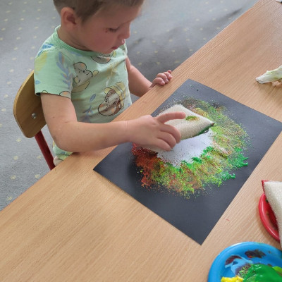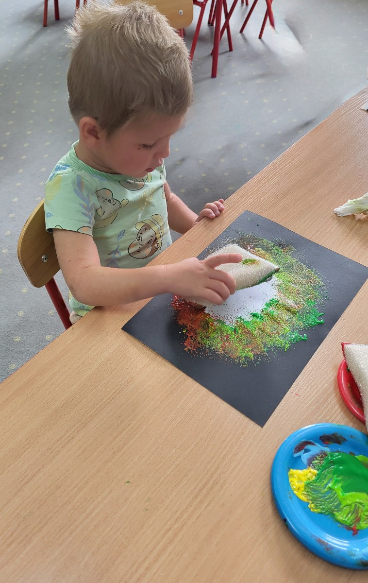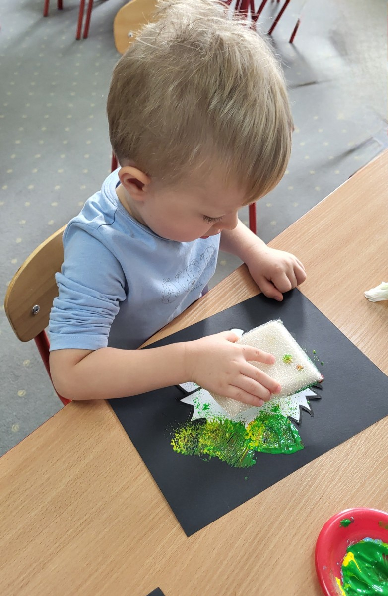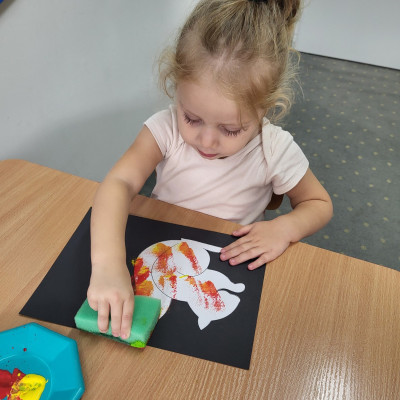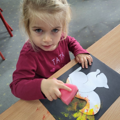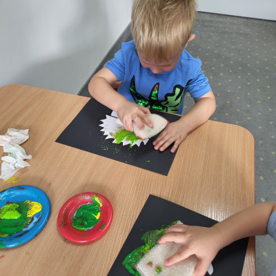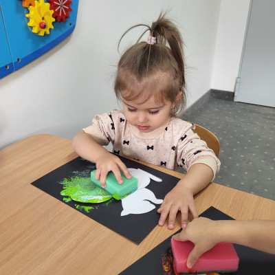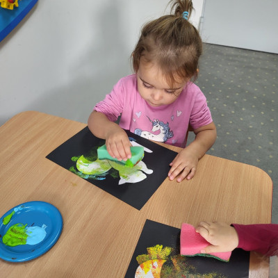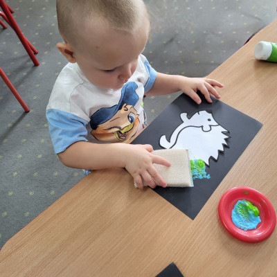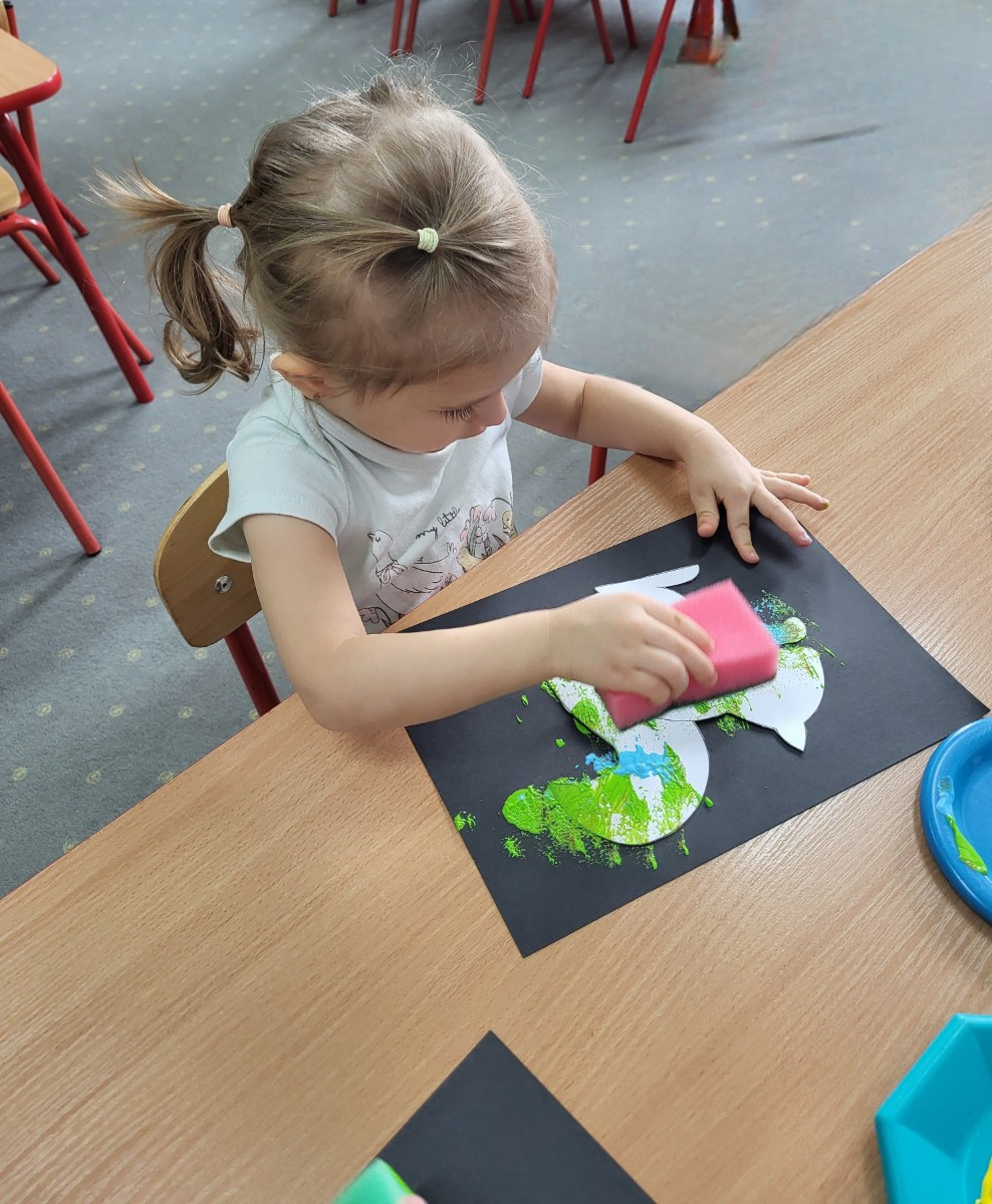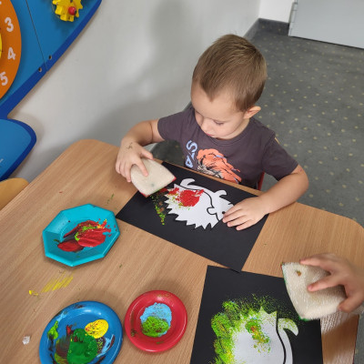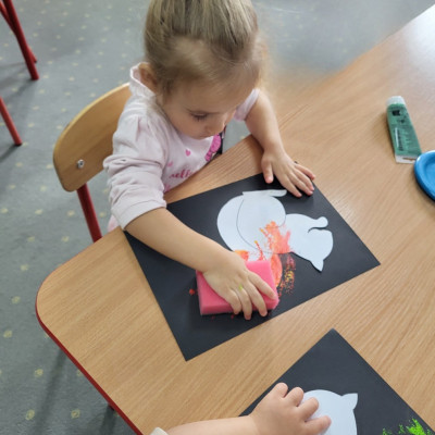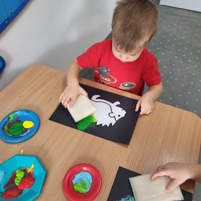 Dzieci z użyciem gąbki oraz kolorowych farbek wykonały super cienie zwierzątek.