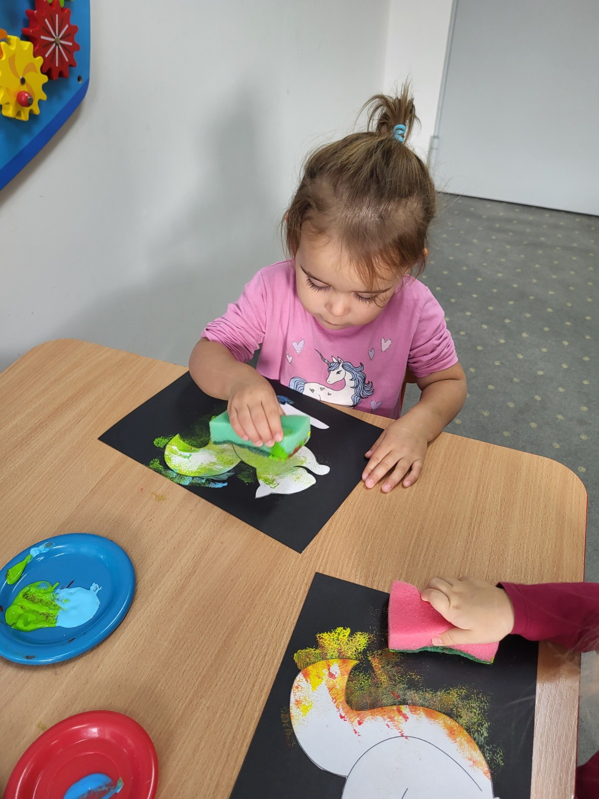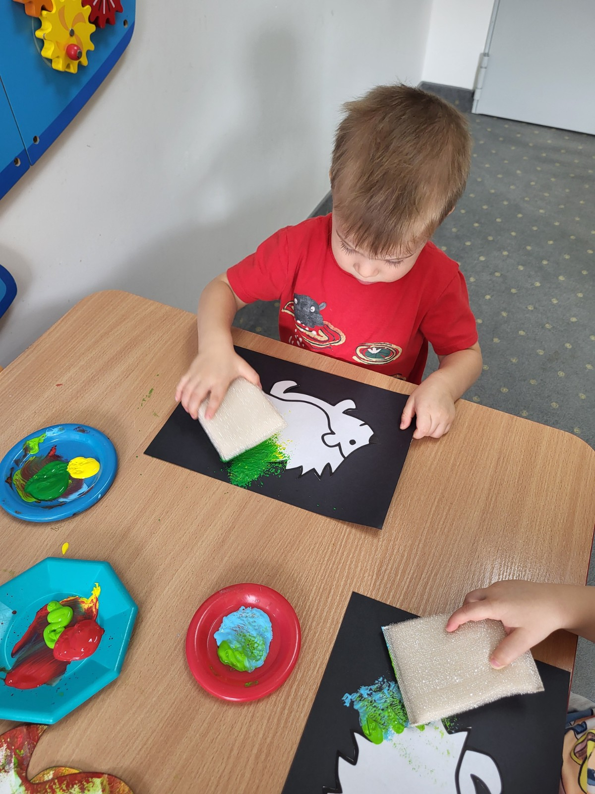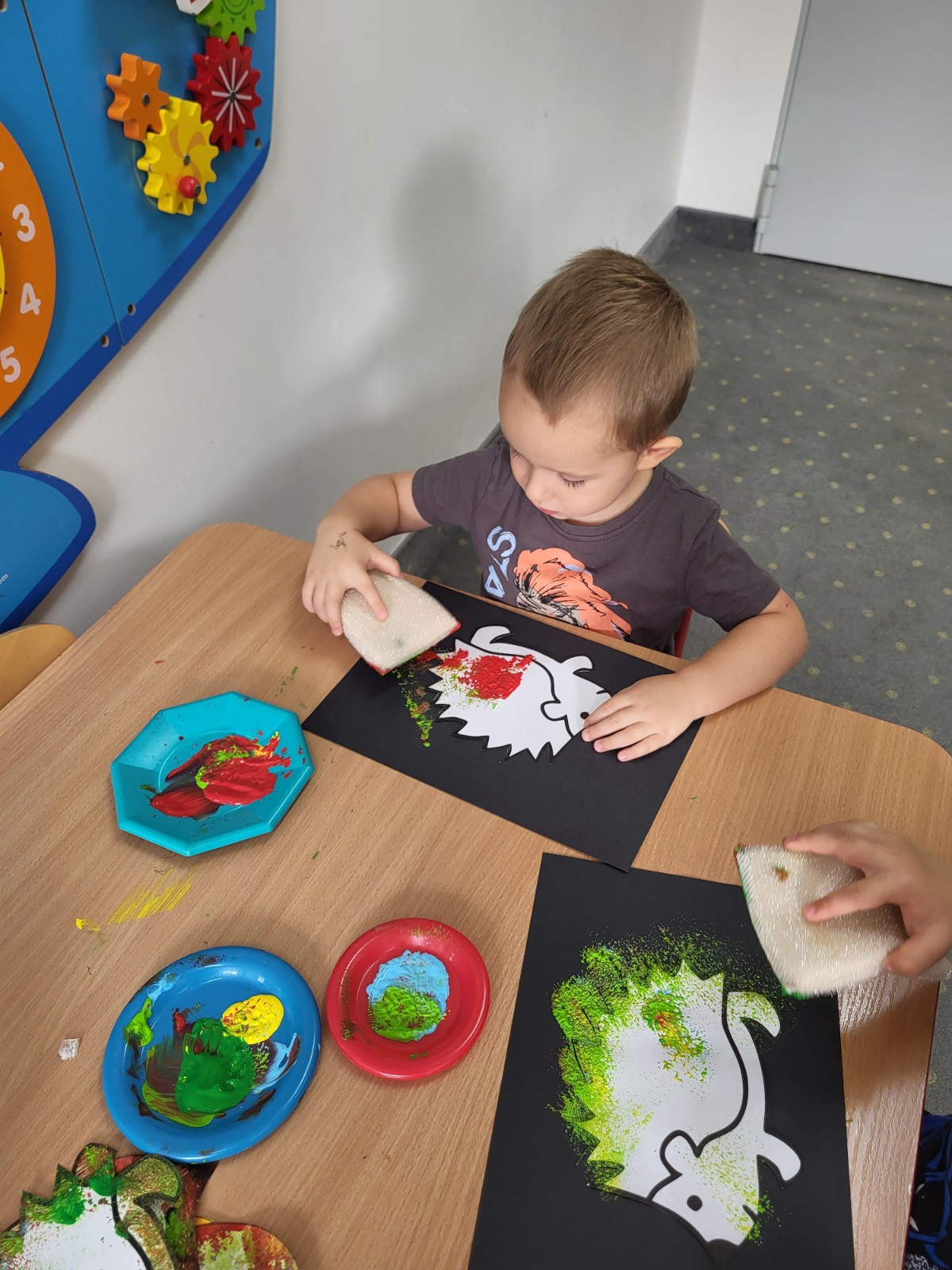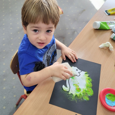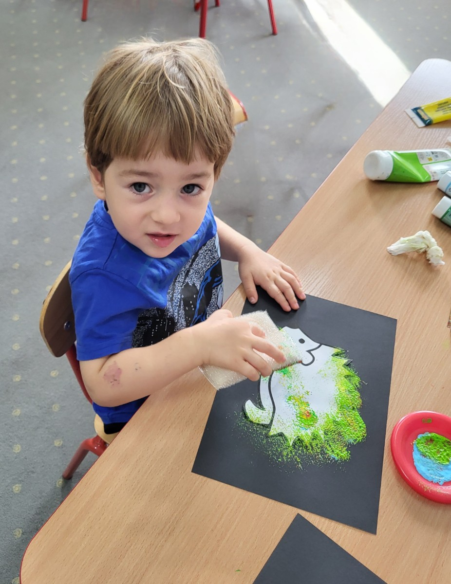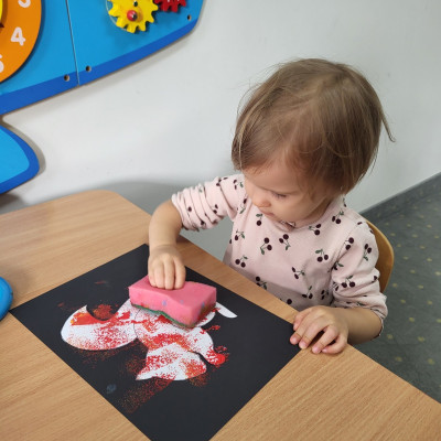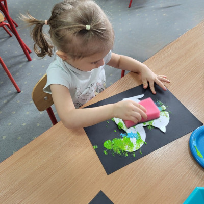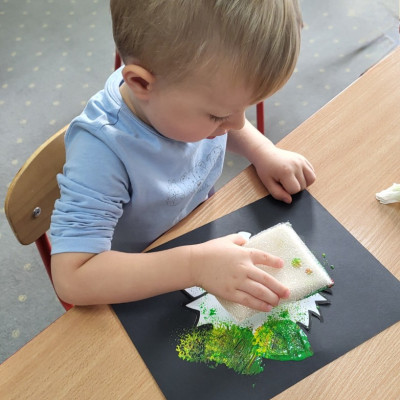 Dzieci z użyciem gąbki oraz kolorowych farbek wykonały super cienie zwierzątek.