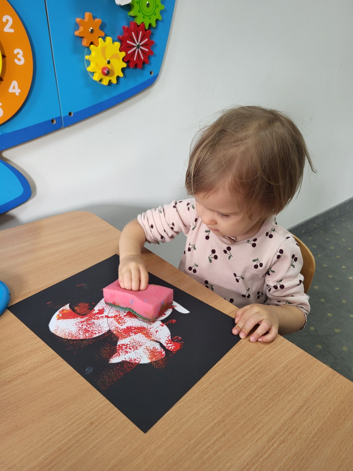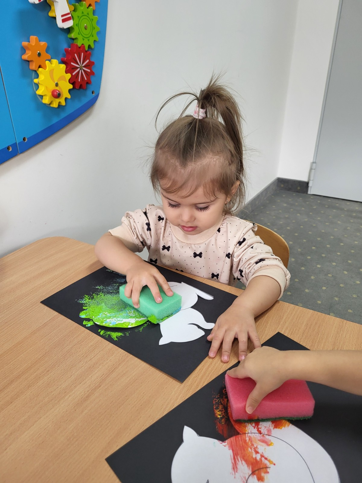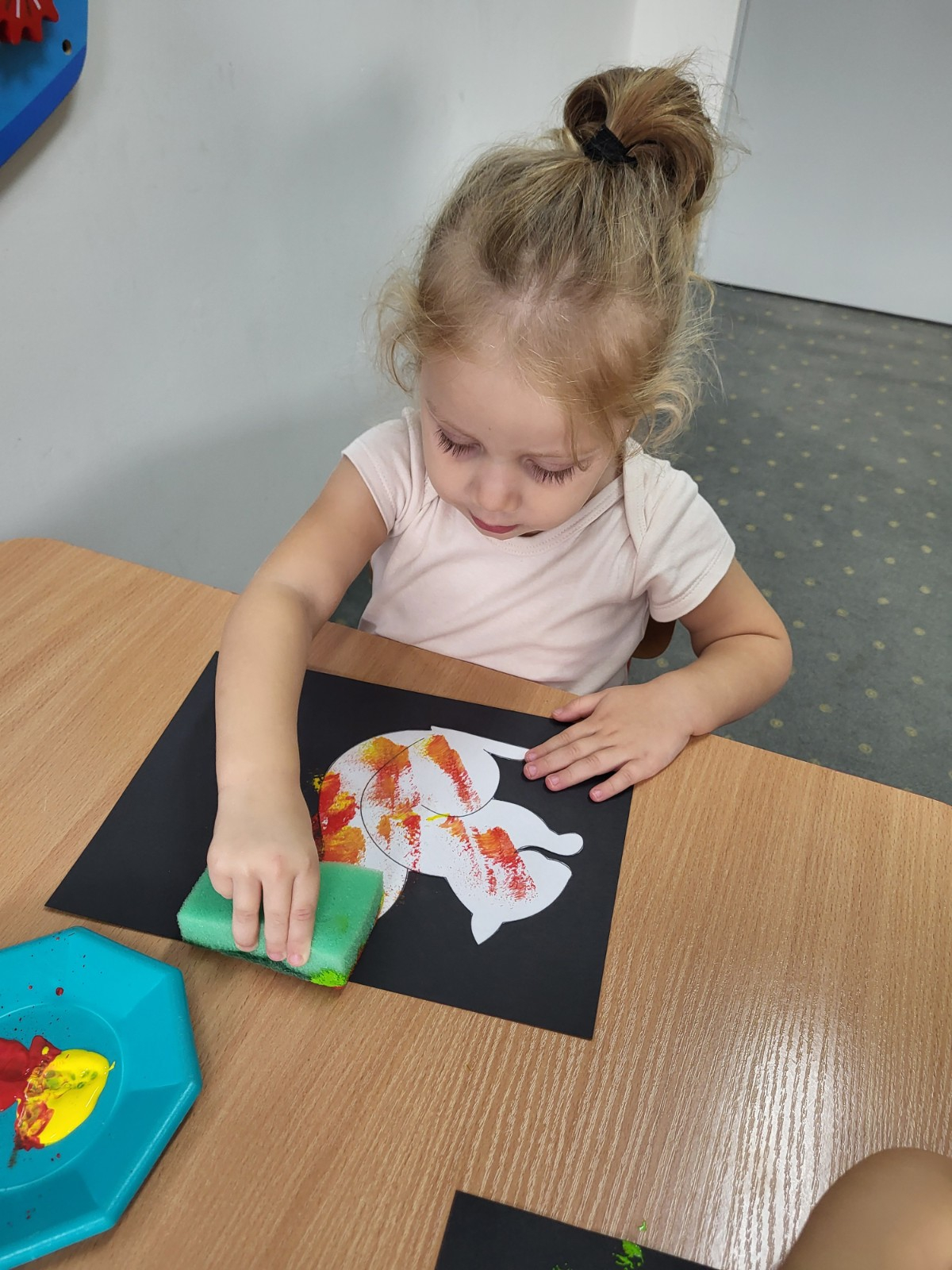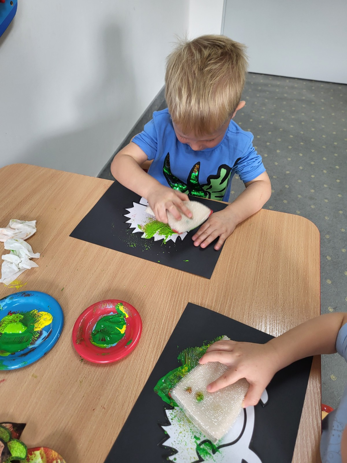 Dzieci z użyciem gąbki oraz kolorowych farbek wykonały super cienie zwierzątek.