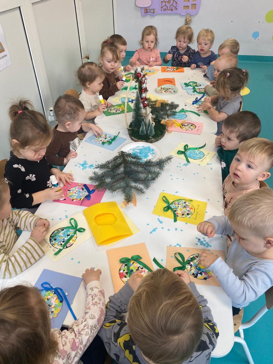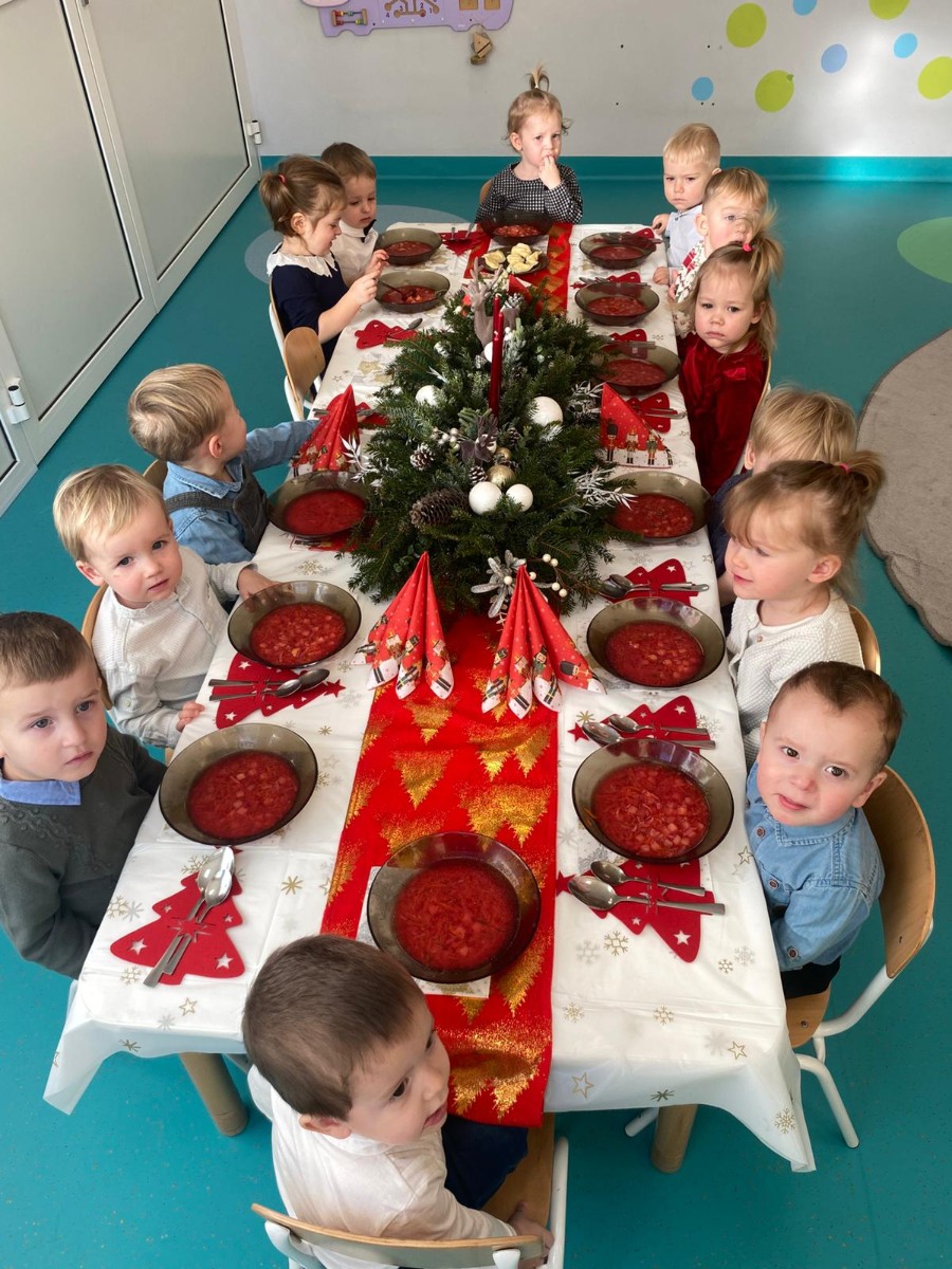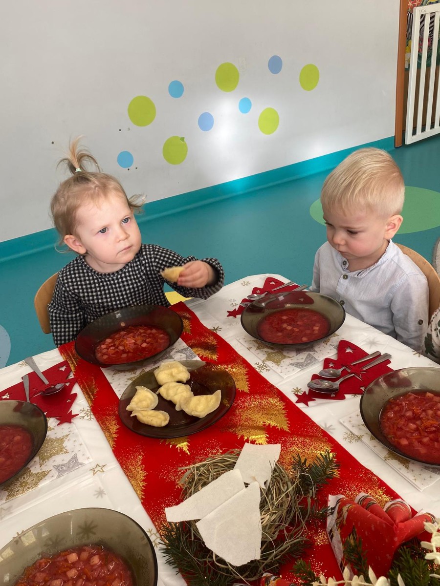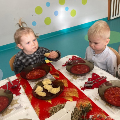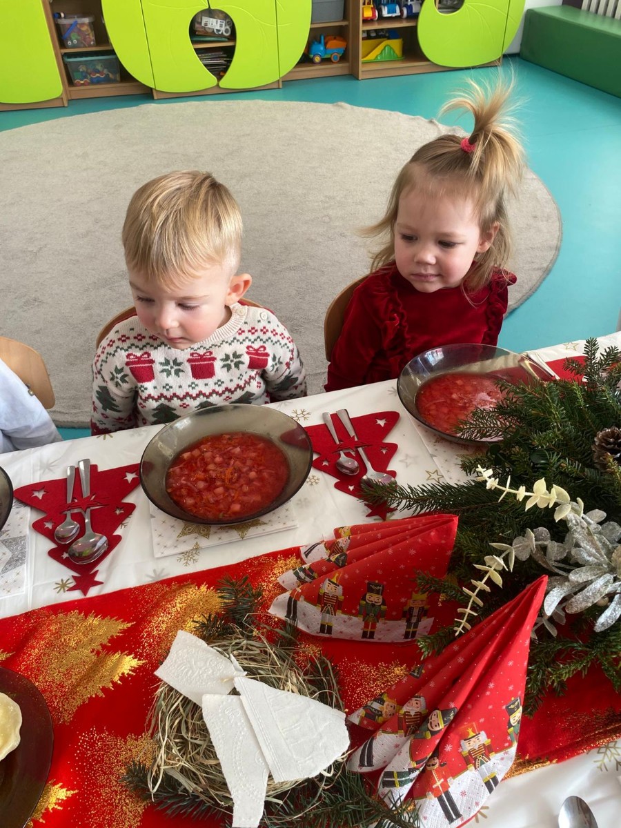 Święta Bożego Narodzenia to magiczny czas. Dla wielu z nas jest to dzień niezwykle radosny ,spędzony w gronie najbliższych.W dniu 19.12.2025r. w grupie Żabek odbyła się Wigilia . Dzieci wspólnie śpiewały kolędy ,składały sobie życzenia oraz dzieliły się opłatkiem. Panowała radosna i świąteczna atmosfera.Spotkanie miało na celu kultywowanie tradycji Bożonarodzeniowych oraz integrację dzieci w grupie.