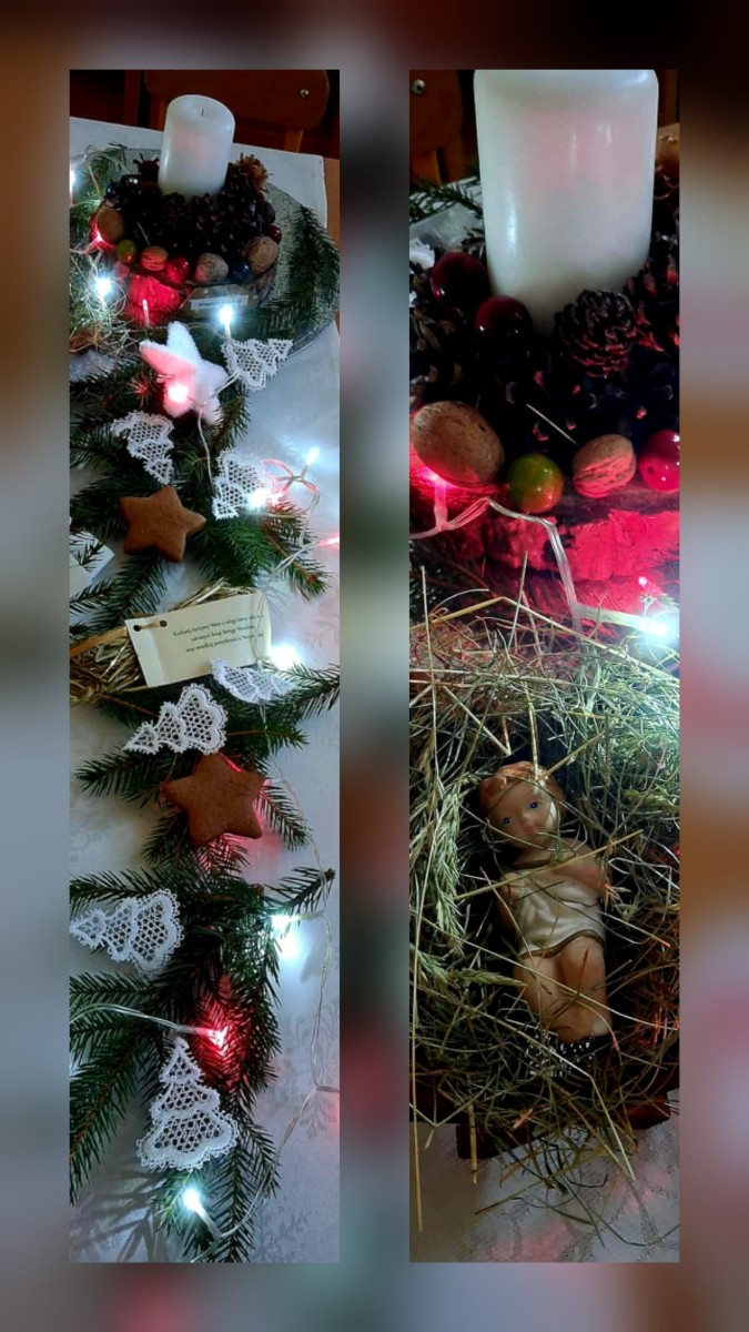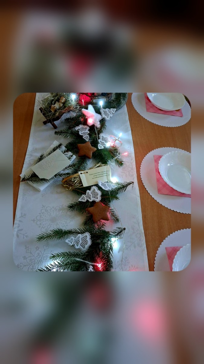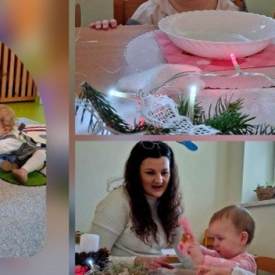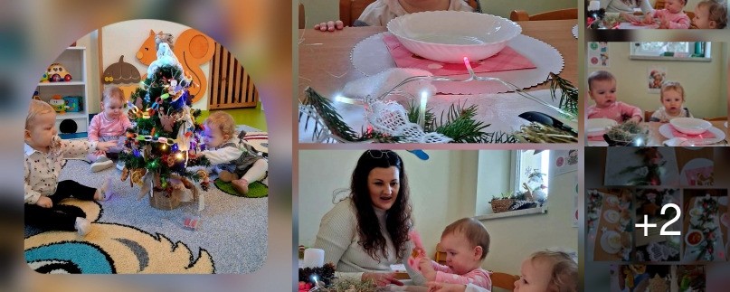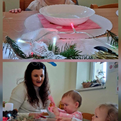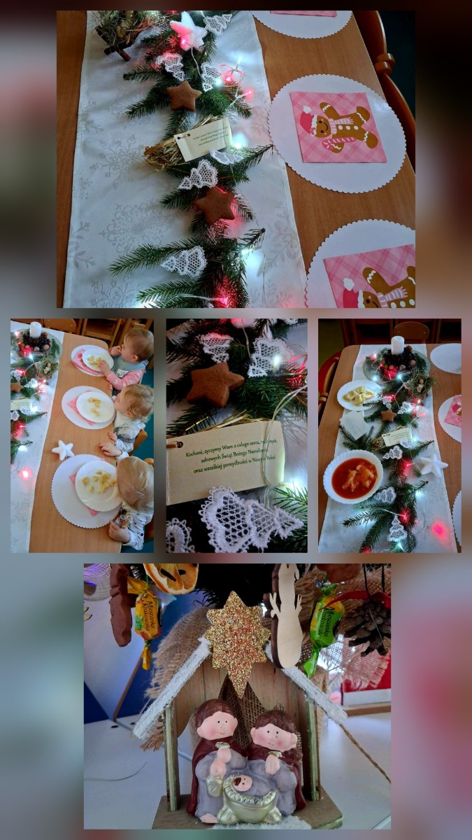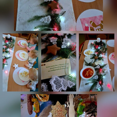 Maluszki poznawaly tradycje Świąt. Ciocie przygotowaly stół z białym obrusem, były pierogi i pyszny czerwony barszczyk.