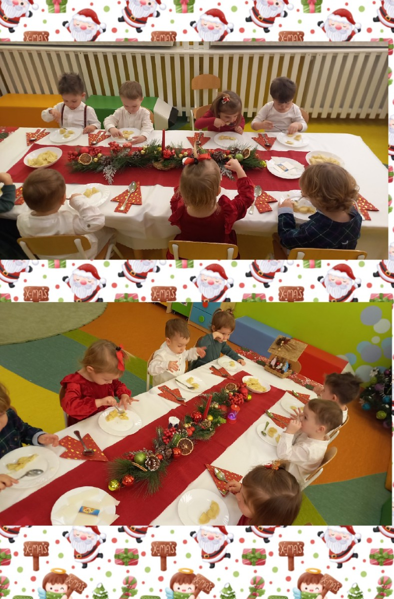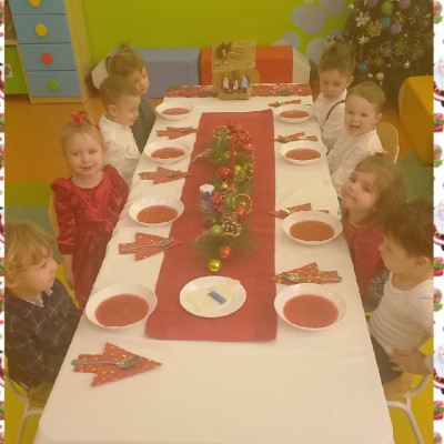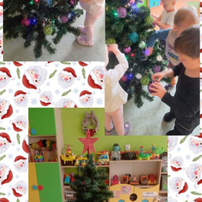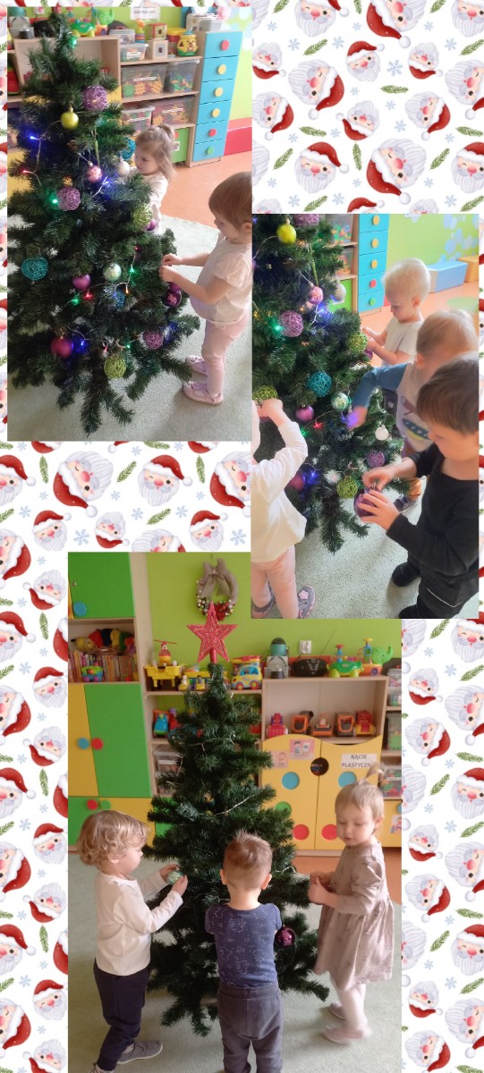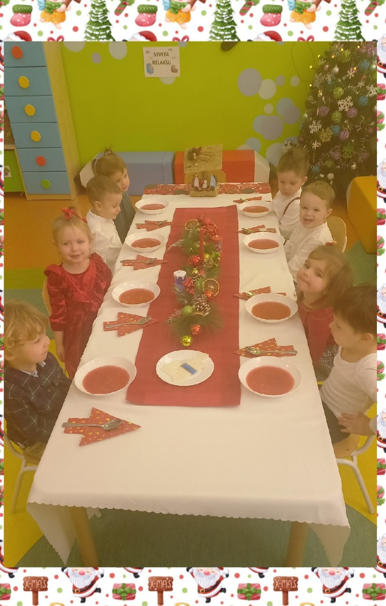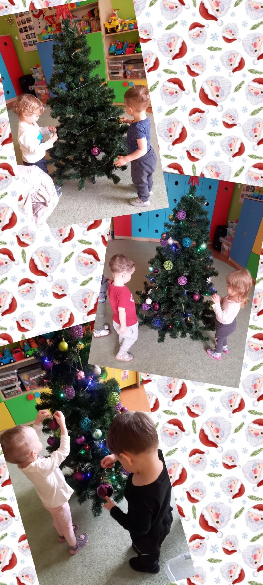 Z wielką radością dzieci wspólnie ubierały choinkę, zawieszając kolorowe bombki i różnorodne błyskotki. Następnie z zaangażowaniem pomagały w nakrywaniu do stołu, przygotowując wszystko do wigilijnego posiłku. Po tych przygotowaniach, wszyscy razem zasiedli do posiłku, ciesząc się wspólnym jedzeniem. Na koniec, w pięknej, świątecznej atmosferze, radośnie zaśpiewały ulubione kolędy.
