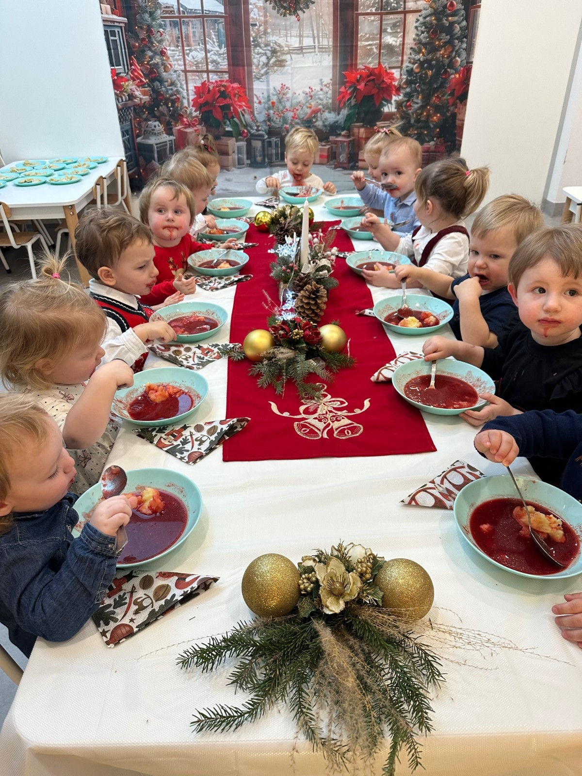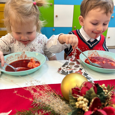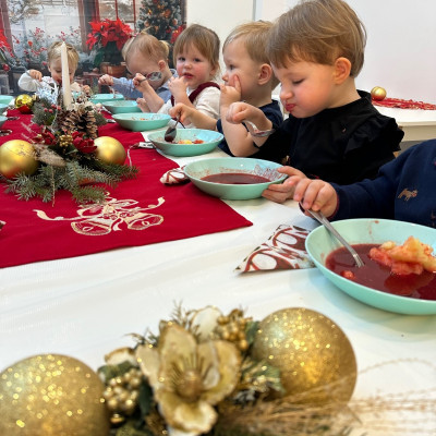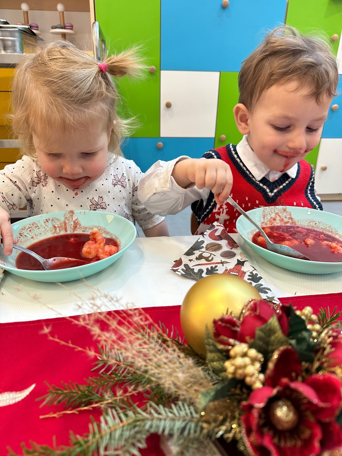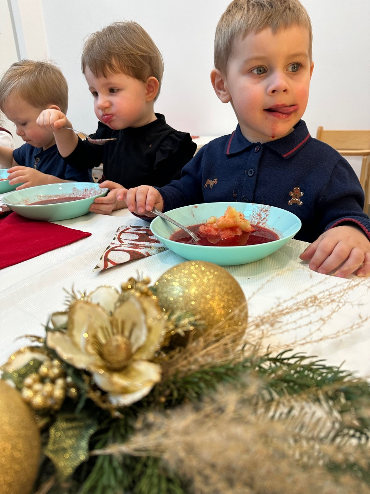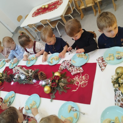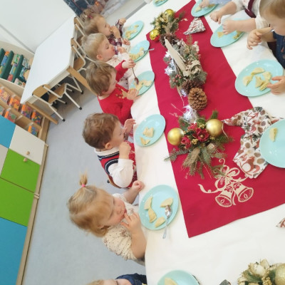 19 grudnia w grupie Tygryski odbyła się wigilia. Tego dnia dzieci przyszły pięknie wystrojone. Cały ranek panowała świąteczna atmosfera oczekiwania, a w tle słychać było kolędy. Dzieci pomogły ciociom nakryć i przystroić wigilijny stół. A gdy nadszedł czas Tygryski zasiadły do stołu, gdzie pojawił się tradycyjny barszczyk czerwony i pierogi, które dzieci zjadły ze smakiem.