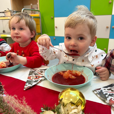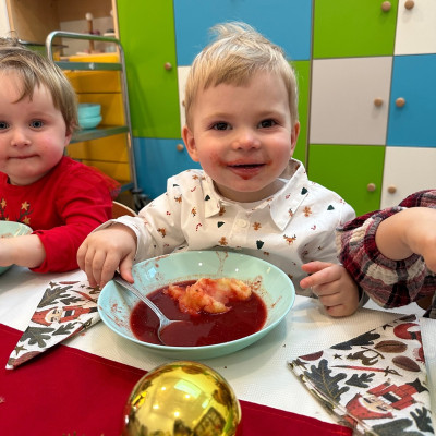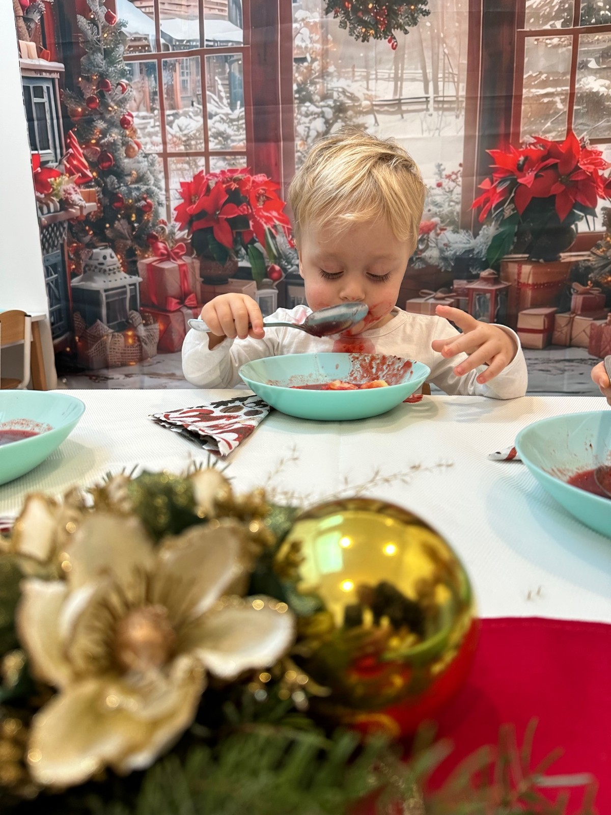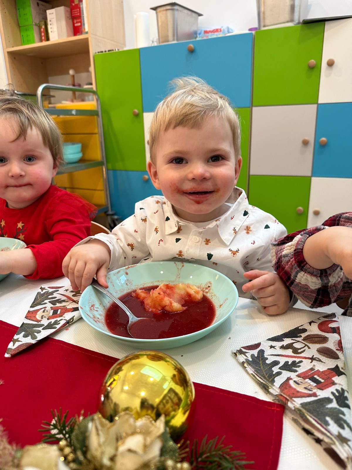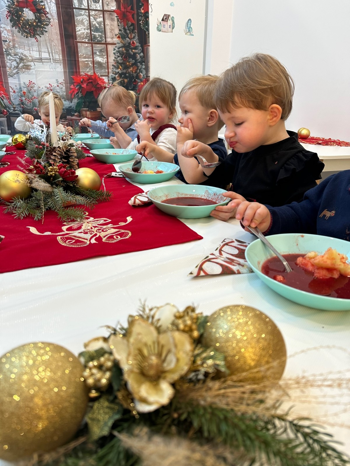 19 grudnia w grupie Tygryski odbyła się wigilia. Tego dnia dzieci przyszły pięknie wystrojone. Cały ranek panowała świąteczna atmosfera oczekiwania, a w tle słychać było kolędy. Dzieci pomogły ciociom nakryć i przystroić wigilijny stół. A gdy nadszedł czas Tygryski zasiadły do stołu, gdzie pojawił się tradycyjny barszczyk czerwony i pierogi, które dzieci zjadły ze smakiem.