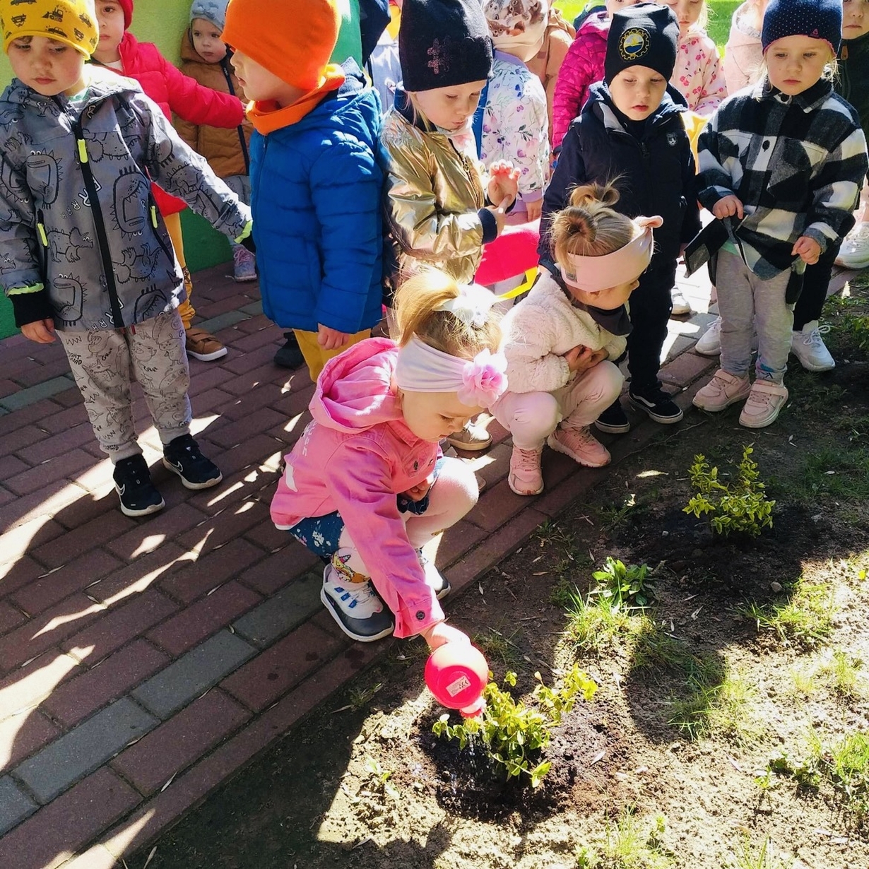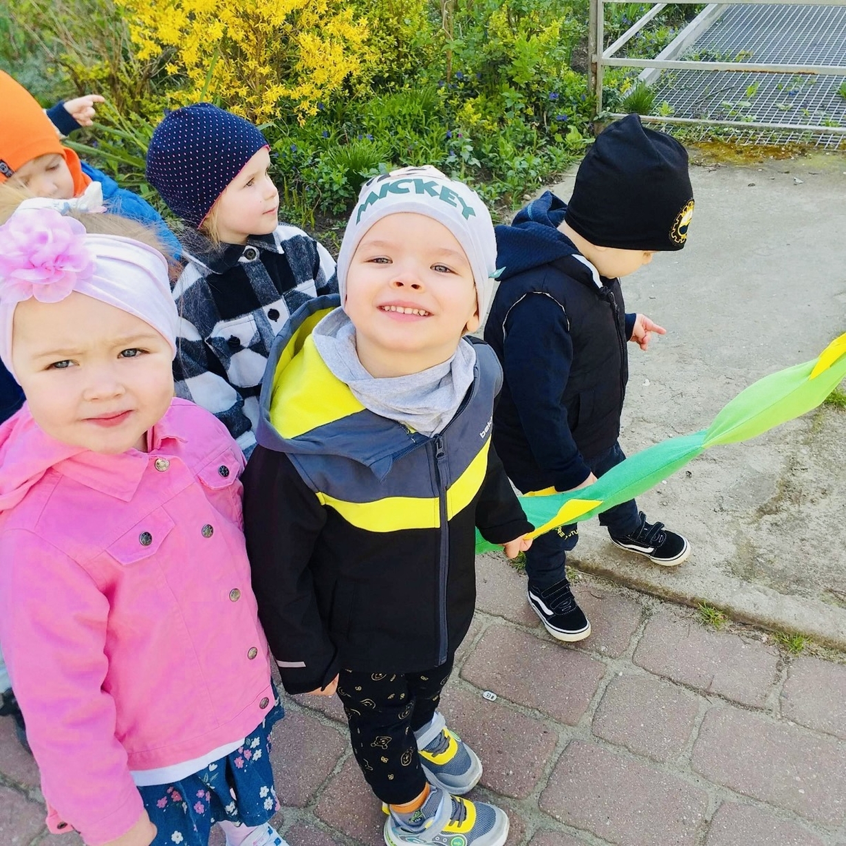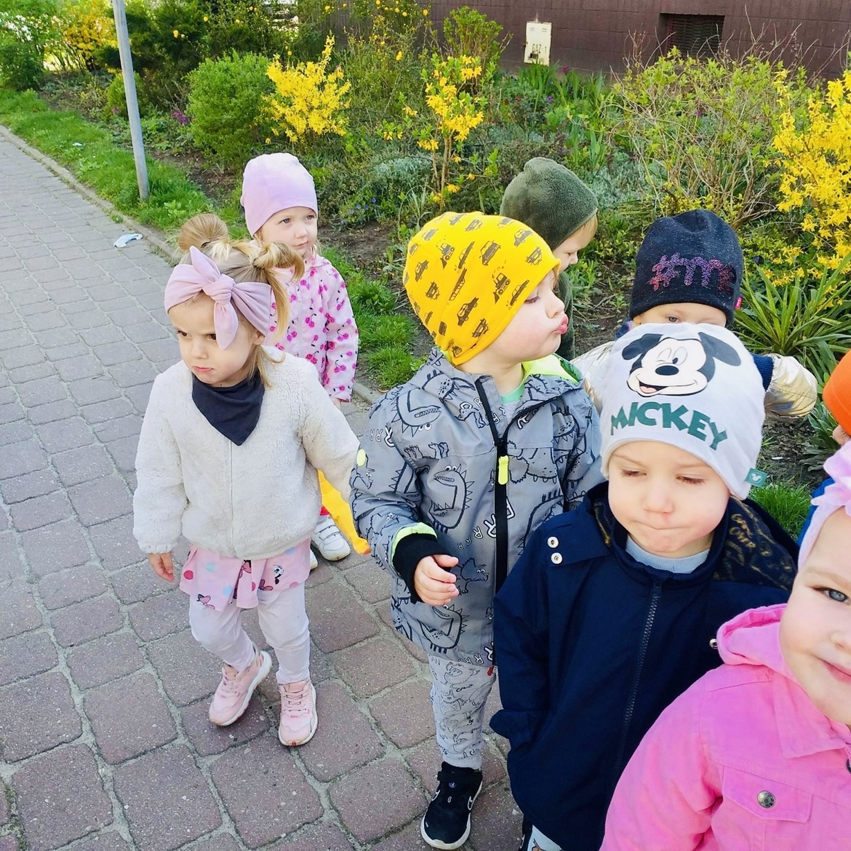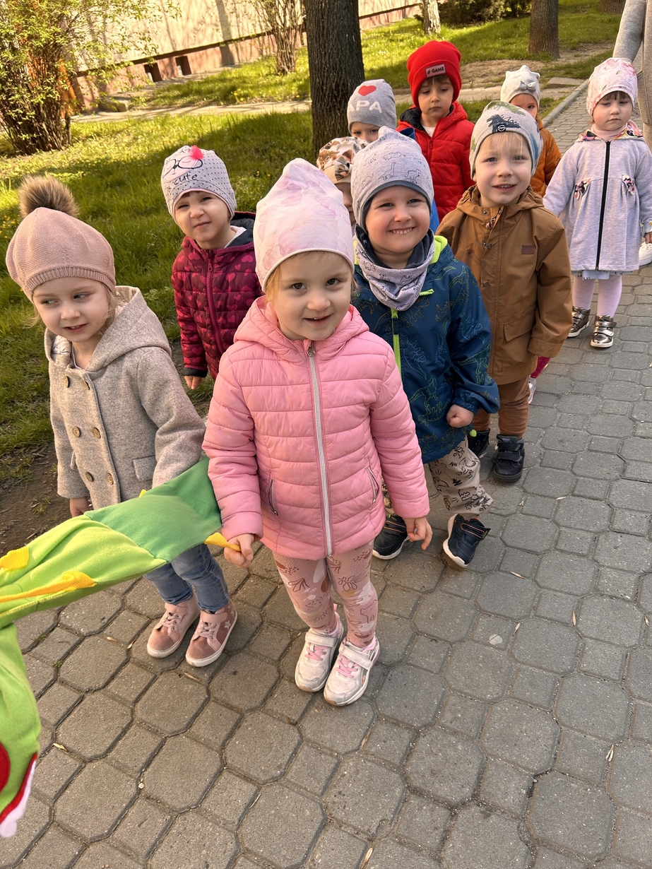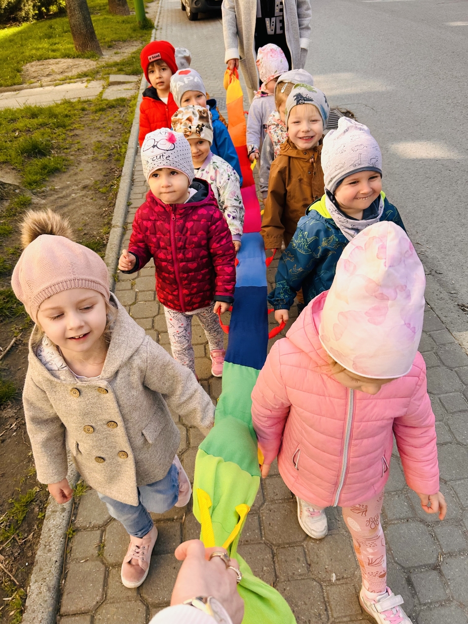Korzystając z pięknej pogody Motylki ?wyruszyły na spacer w poszukiwaniu wiosny . Dzieciaczki w towarzystwie węża dzielnie wędrowały . Pełni energii i w radosnym nastroju wrócili na pyszny obiad do żłobka .