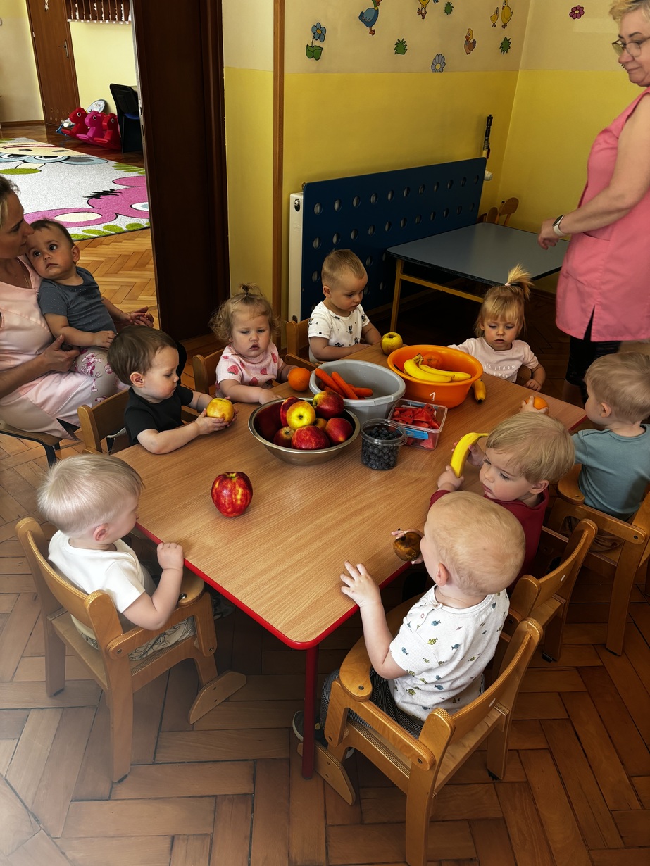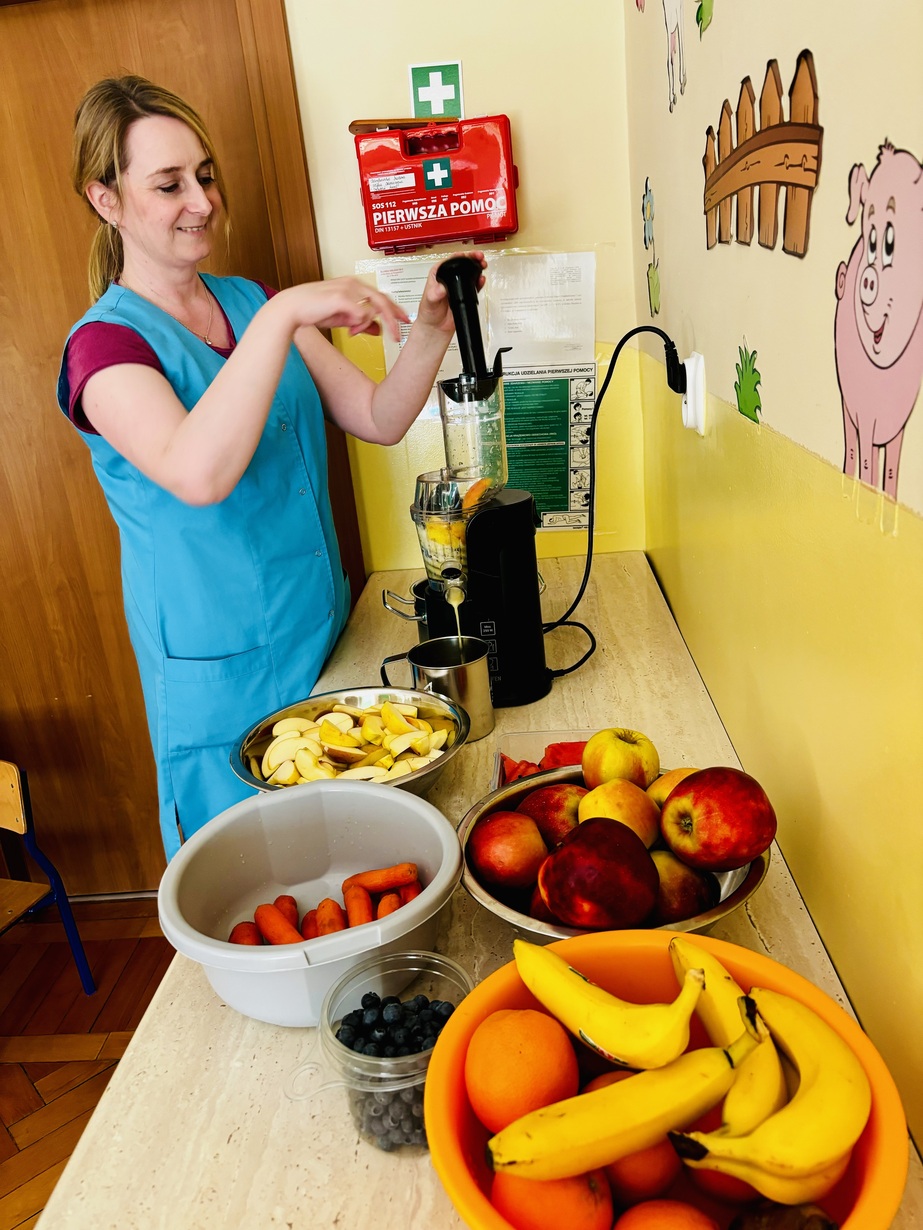 Soki robione samodzielnie to bogate źródło witamin i cennych składników . Dzieci zapoznały się z przygotowanymi warzywami i owocami a następnie z zainteresowaniem obserwowały jak powstaje pyszny sok .
