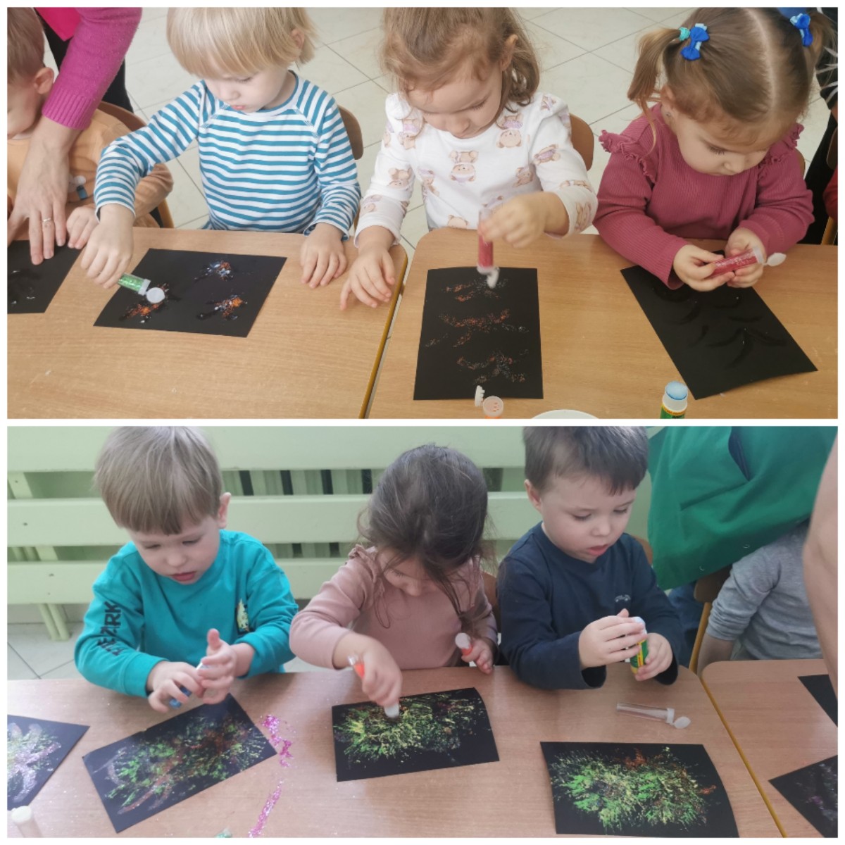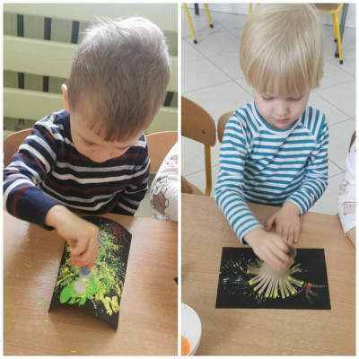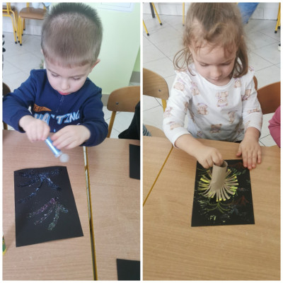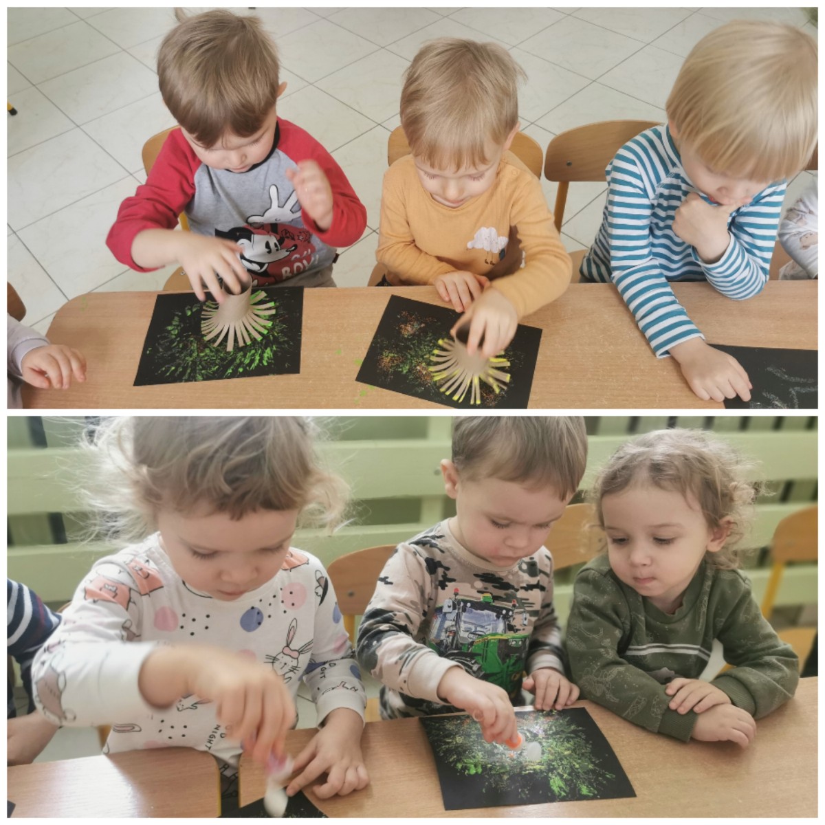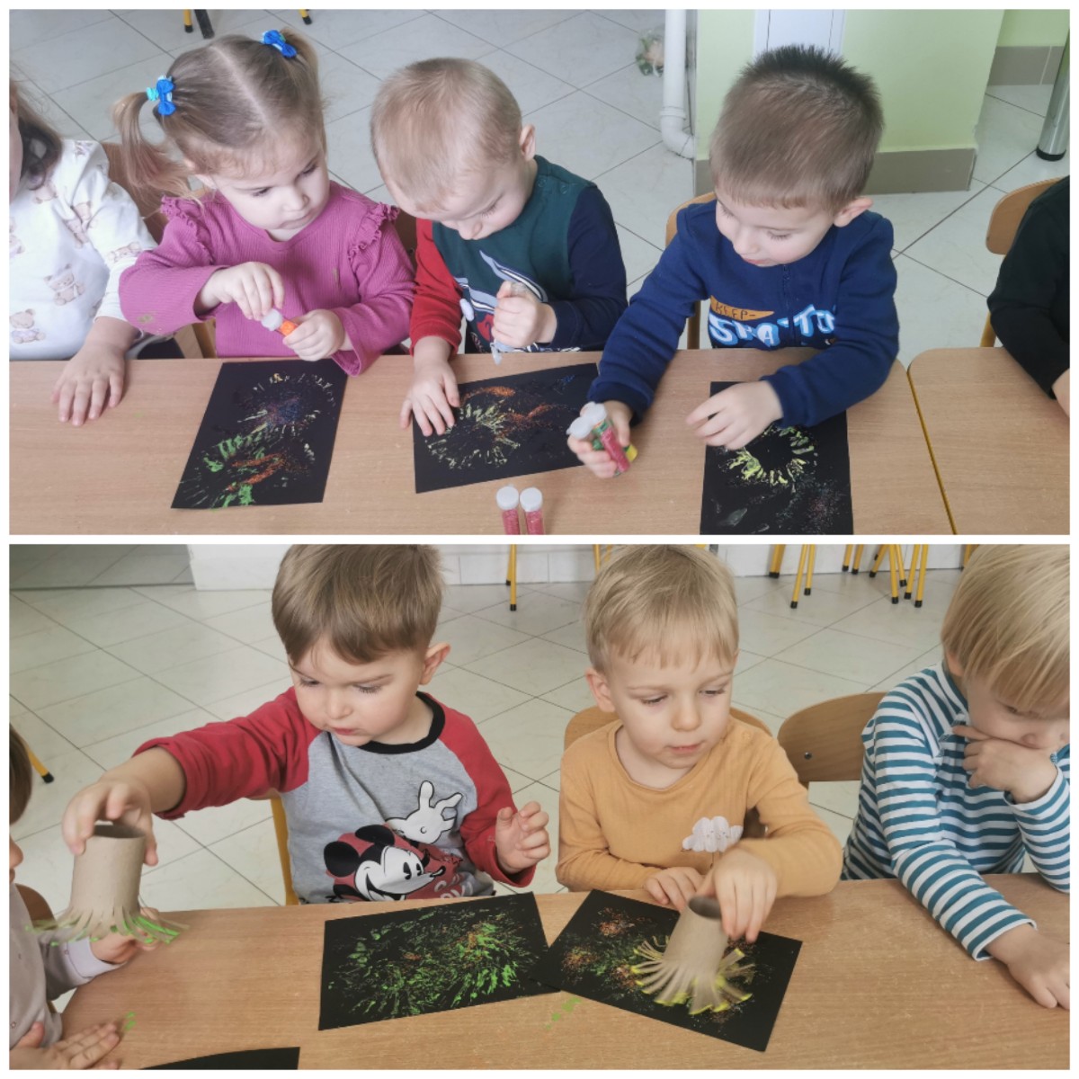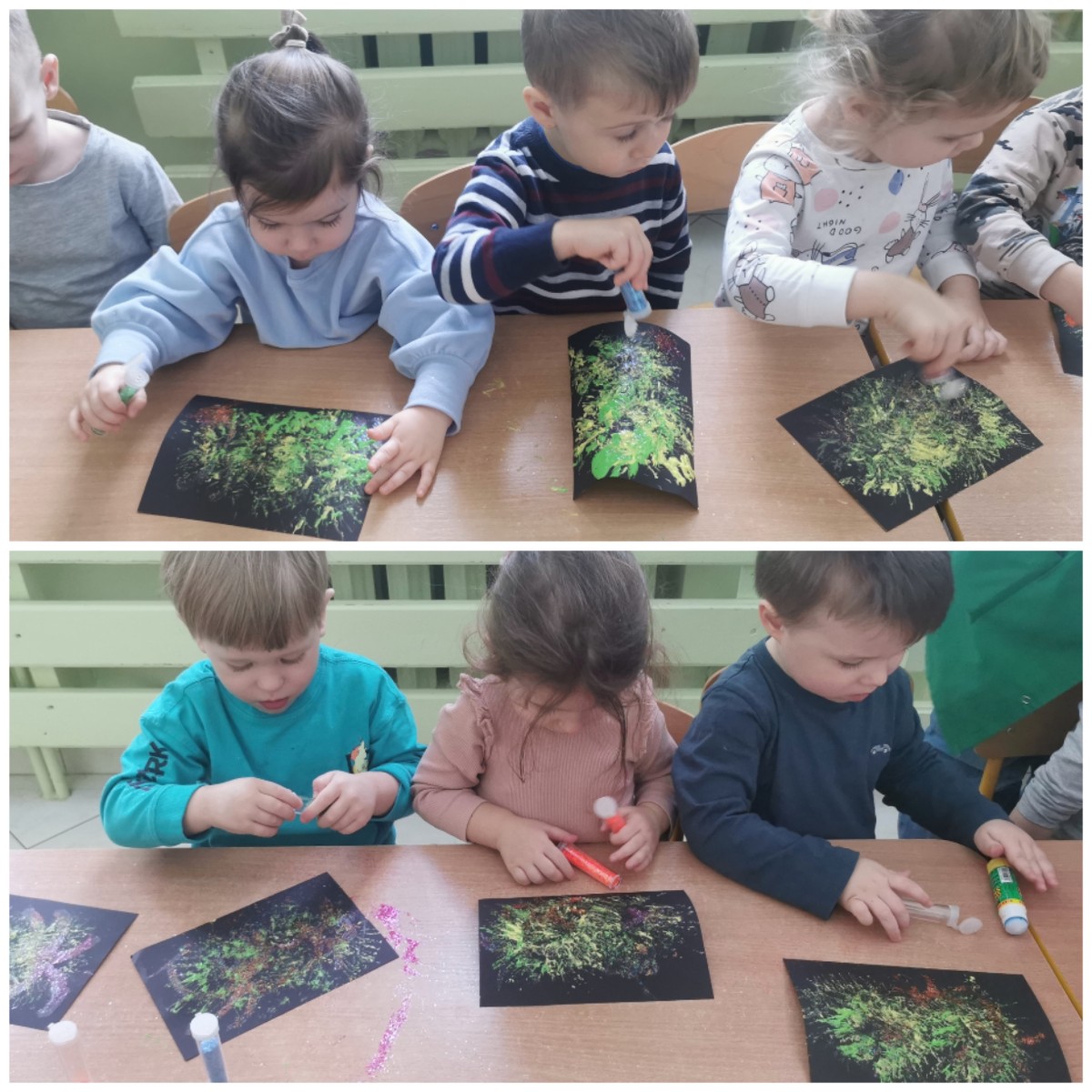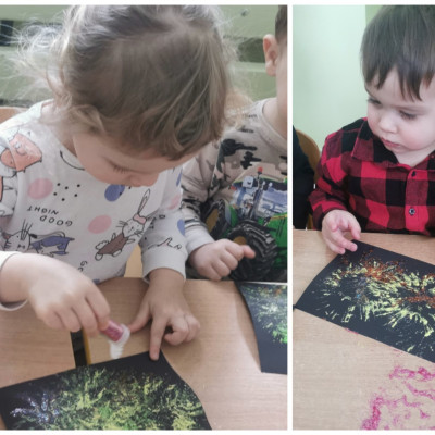 Dzisiaj Żabki trenowały swoje zdolności manualne i twórcze i wykonały zimowe prace plastyczne, których tematem było huczne powitanie Nowego Roku. Stworzyliśmy je z wykorzystaniem brokatu, kleju i kolorowych farb , które dzieci odbijały za pomocą rolek papieru na kartkach, co dało niesamowity efekt. Gotowe prace można podziwiać w galerii zdjęć oraz na korytarzu naszego żłobka. Życzymy wszystkim samych pomyślności w Nowym Roku!