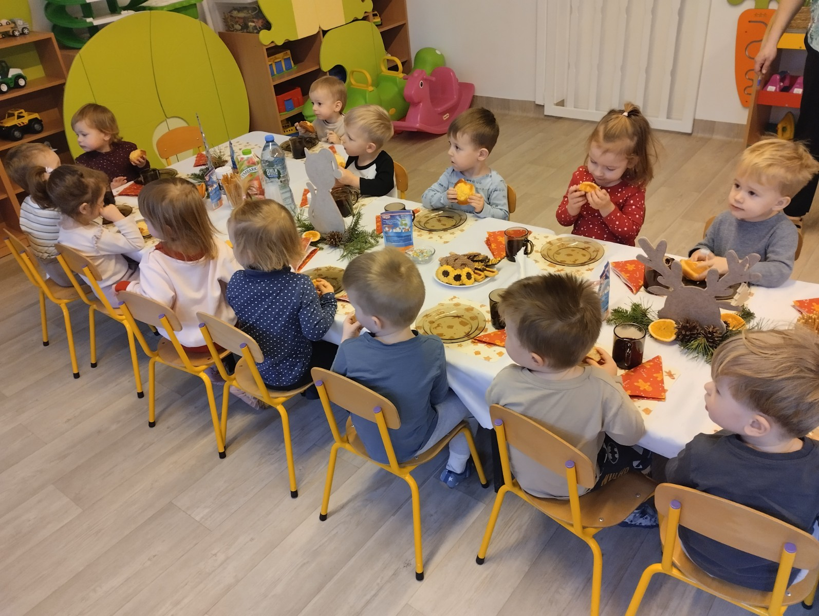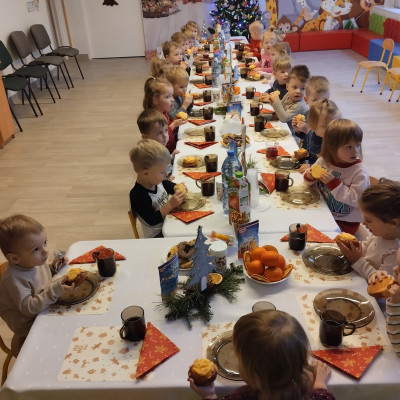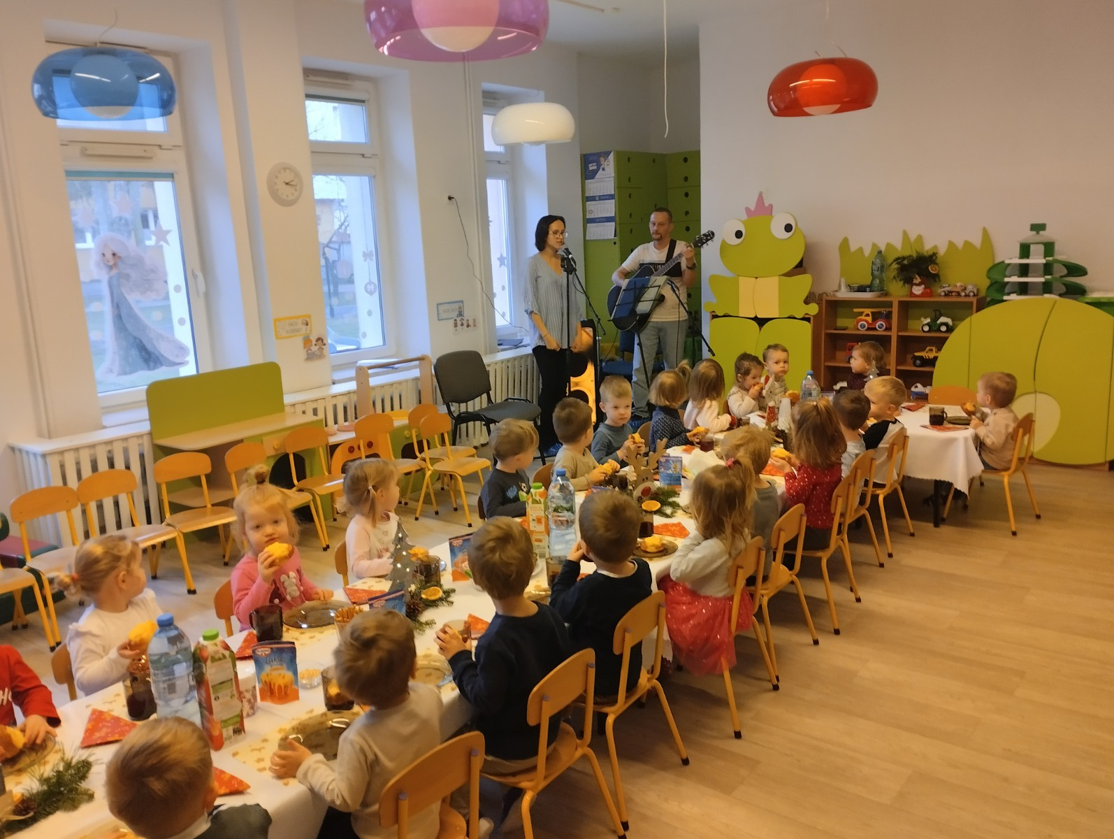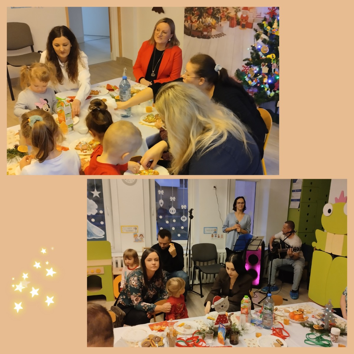 Następnie w żłobku odbyło się wspólne kolędowanie. Dzieci z radością śpiewały znane kolędy. We wspólnym kolędowaniu na gitarze akompaniował zaproszony Pan Łukasz z Panią Kornelią.