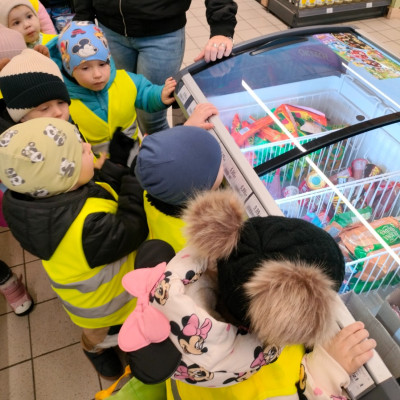Zdjęcia przedstawiają dzieci podczas wizyty w osiedlowym sklepie