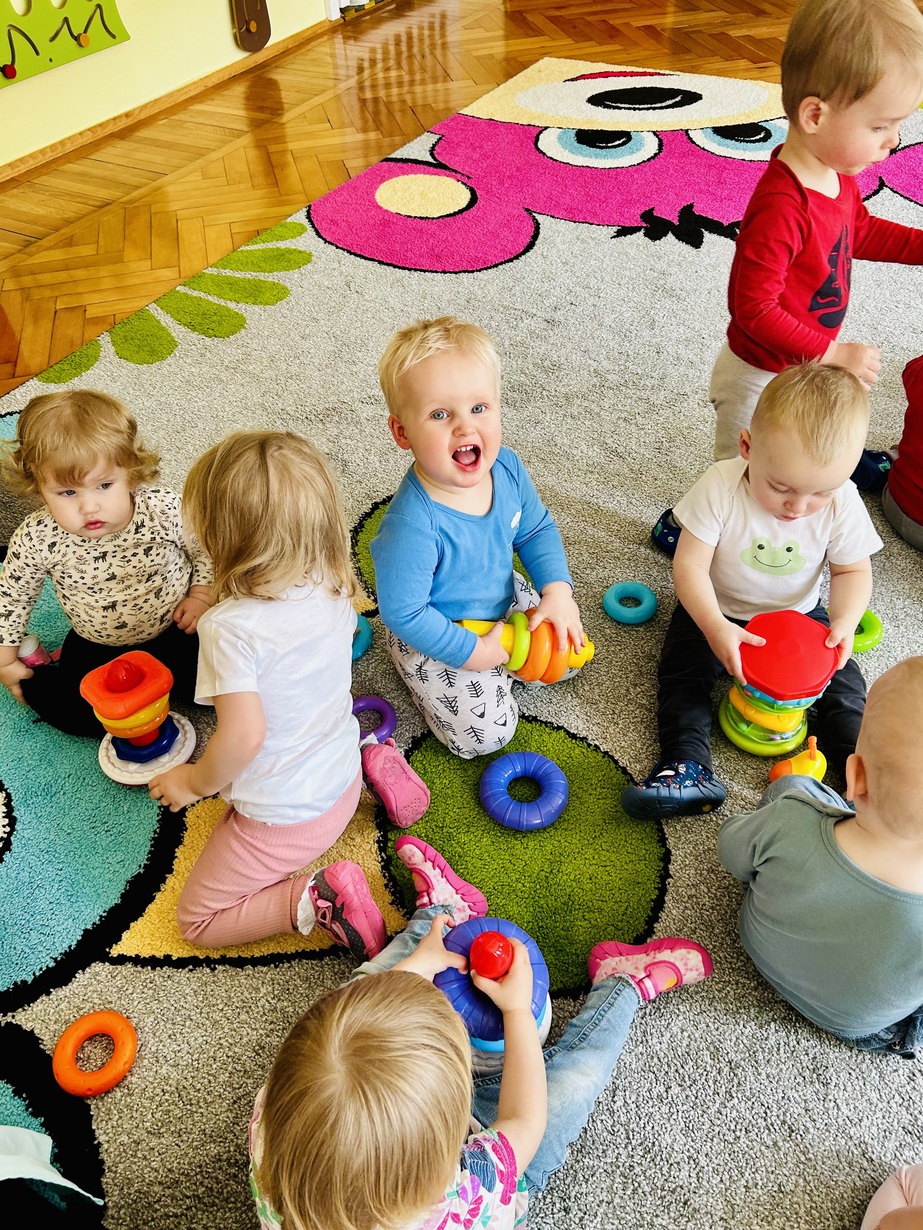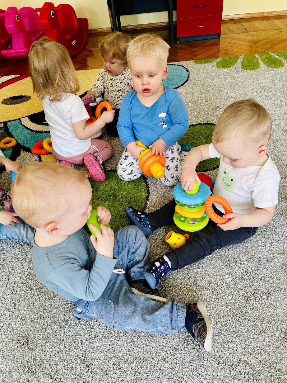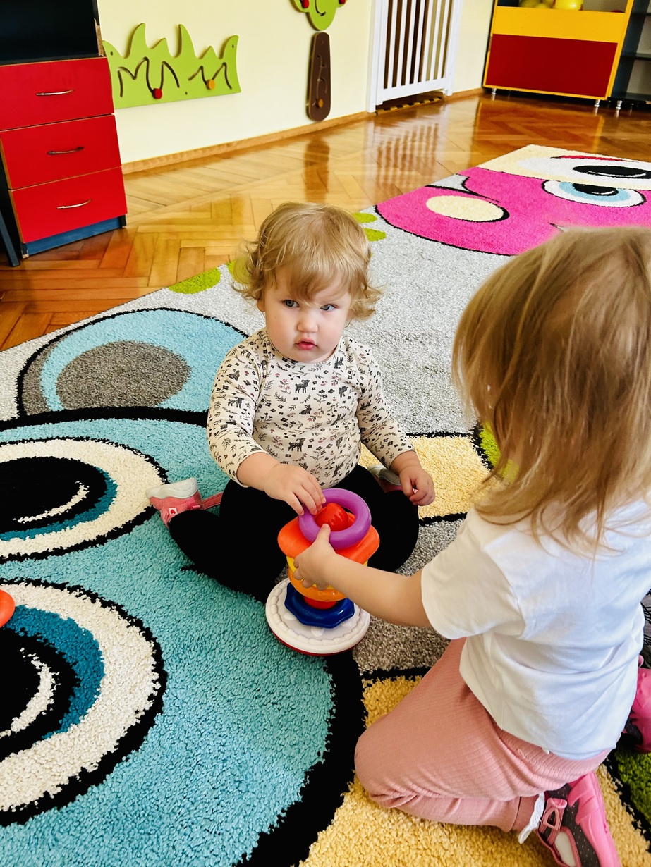 Zgodne zabawy dzieci piramidkami . Zabawa ta rozwija wyobraźnię, oraz wszechstronny rozwój dziecka .