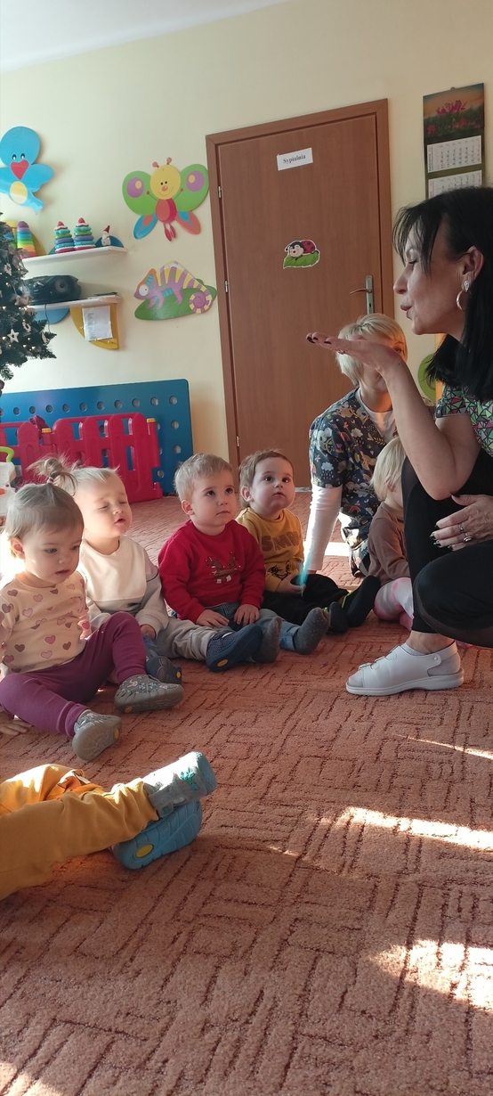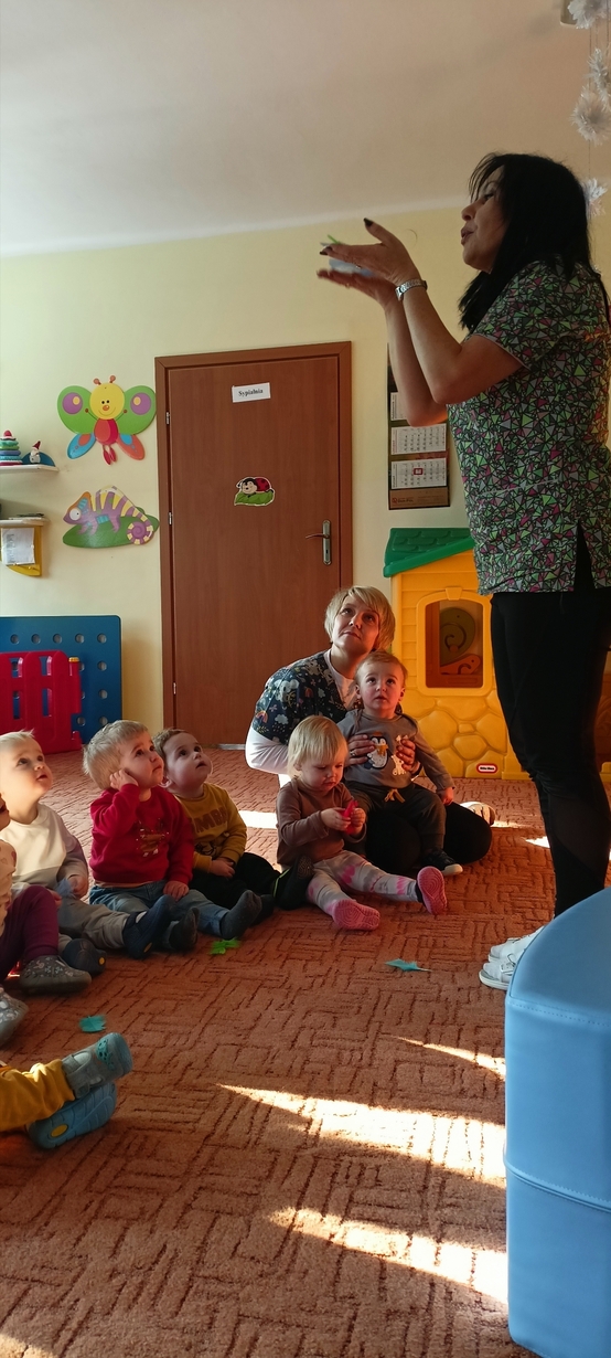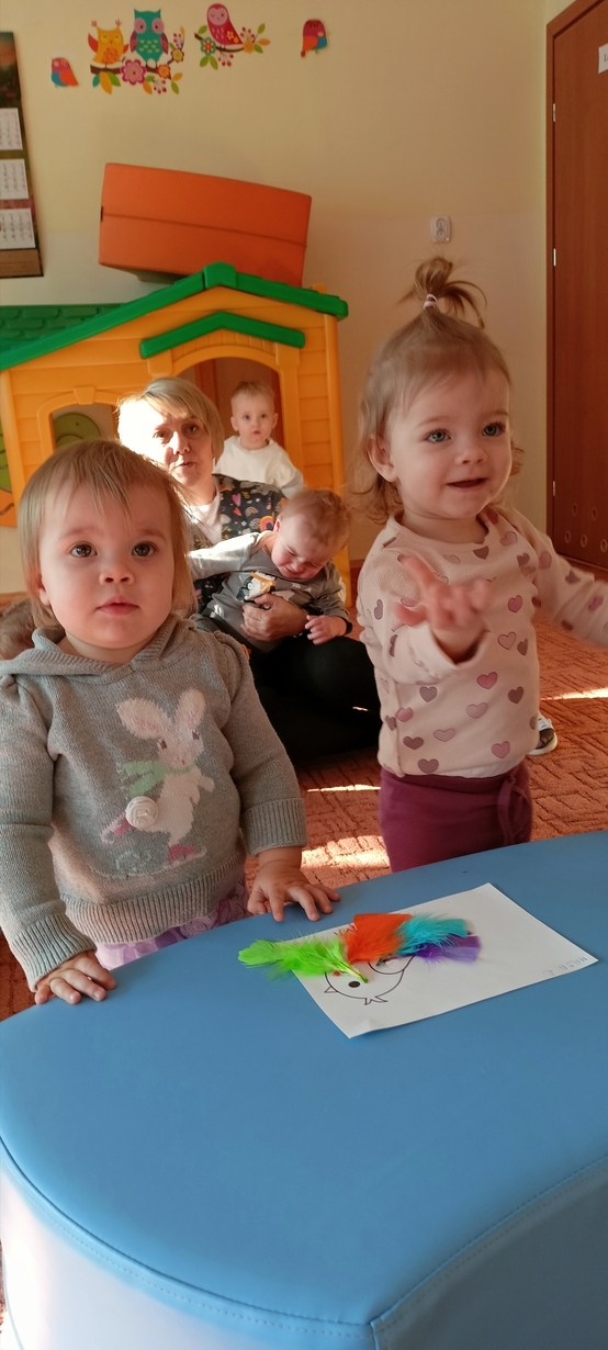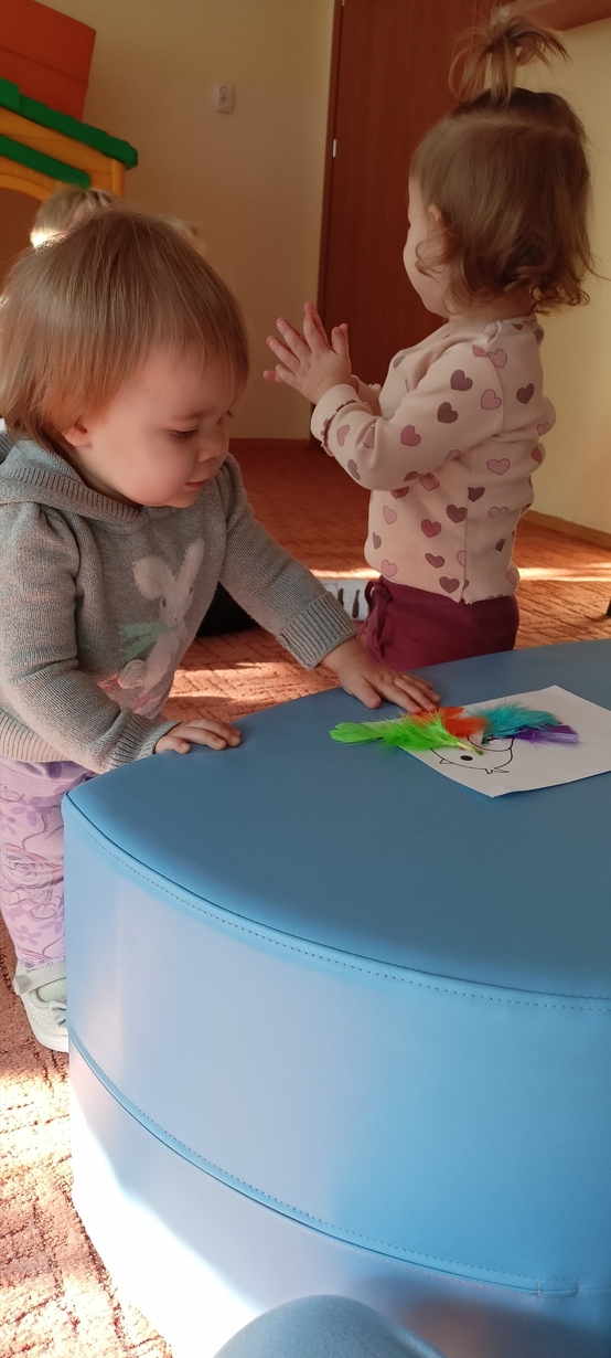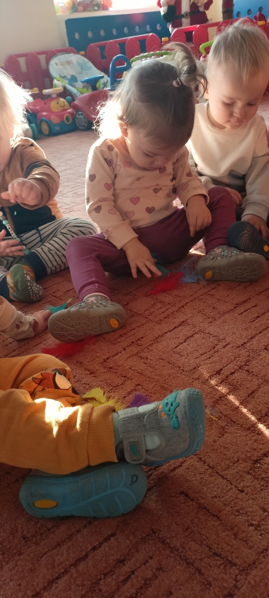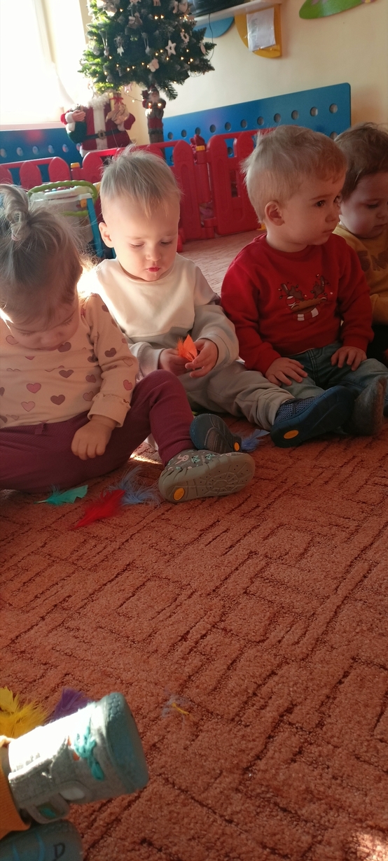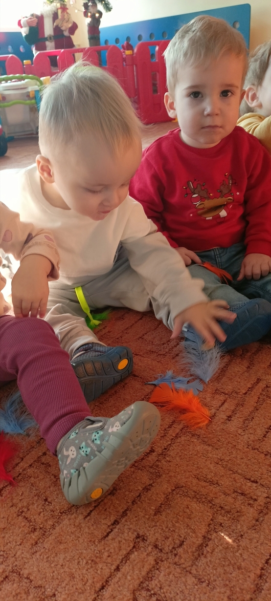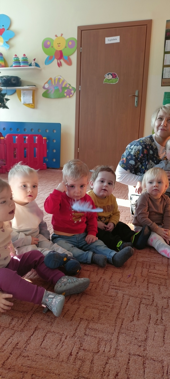 Jedną z nich jest zabawa z piórkiem. Naszym „ Biedroneczkom'' sprawiło dużo radości zdmuchiwania piórka z ręki,