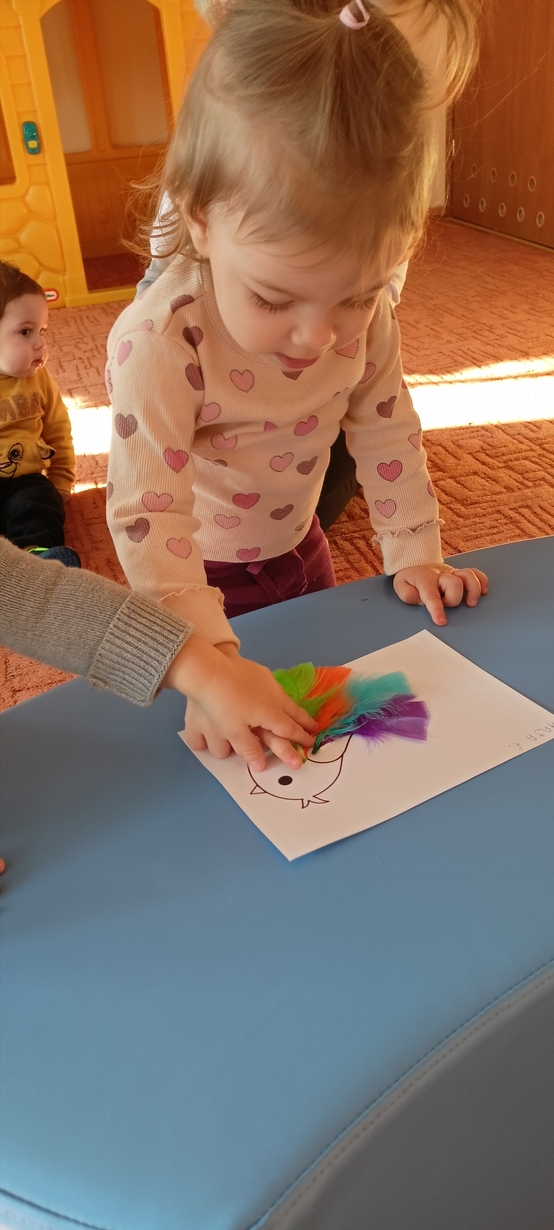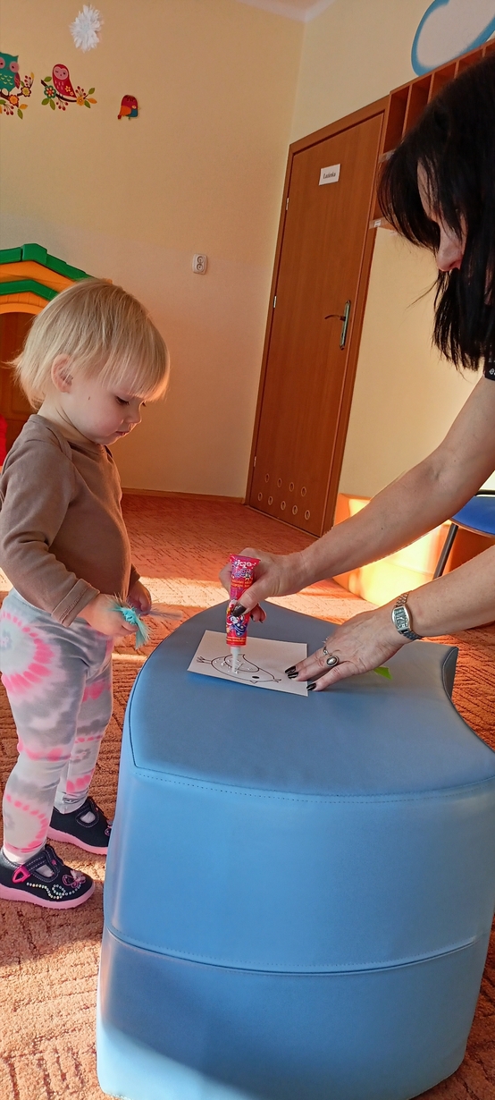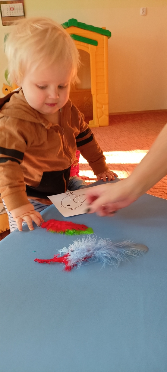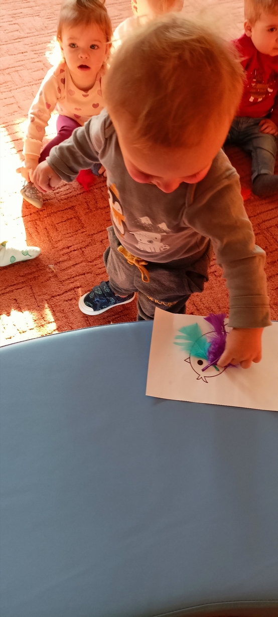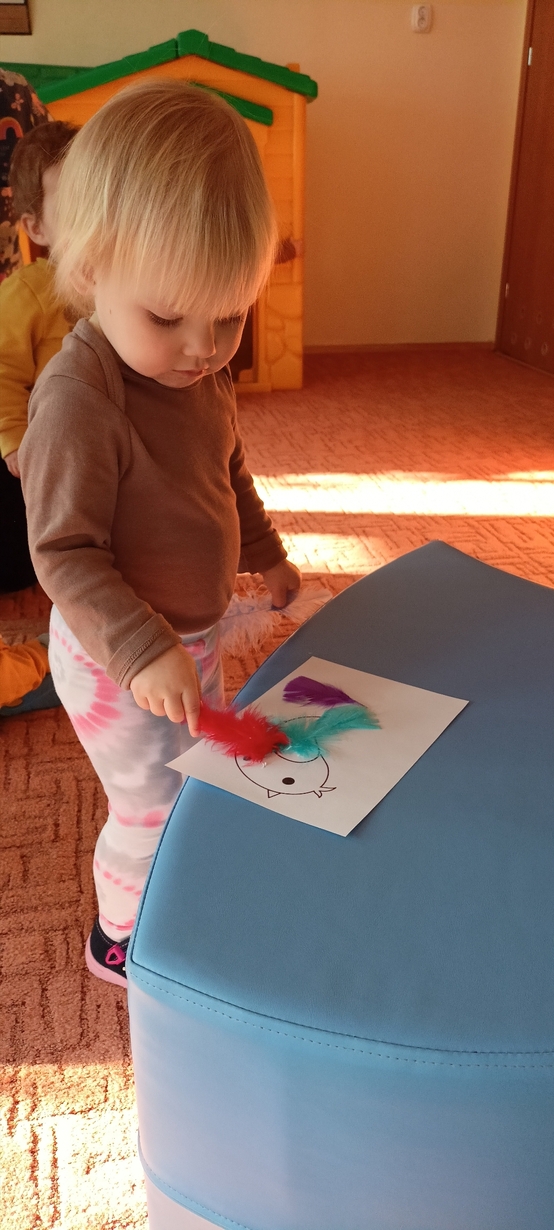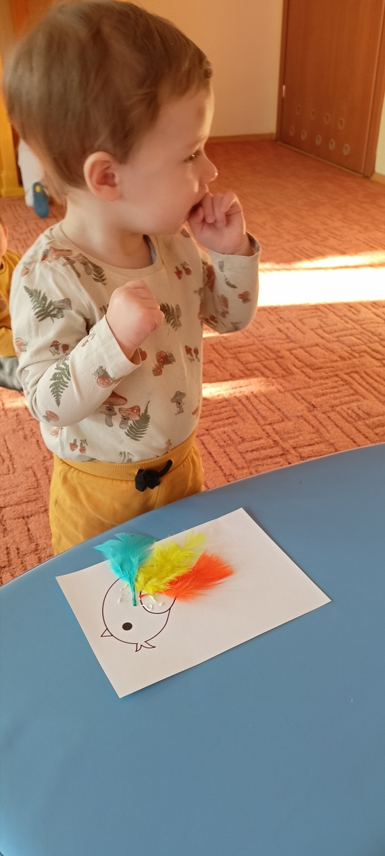 Super zabawą było również wykonywanie pracy plastycznej. Dzieciaczki przyklejały kolorowe piórka do ptaszka z papieru.