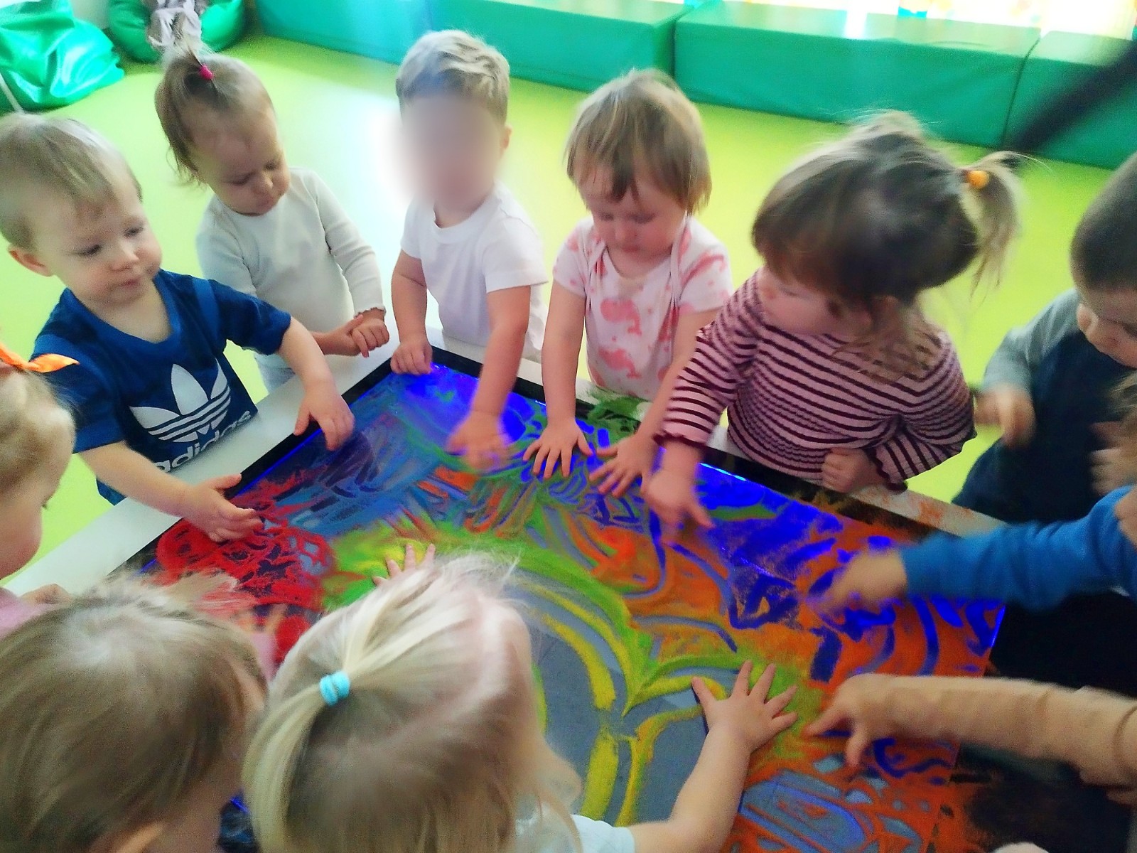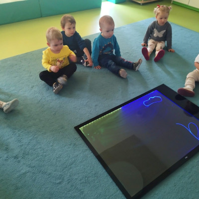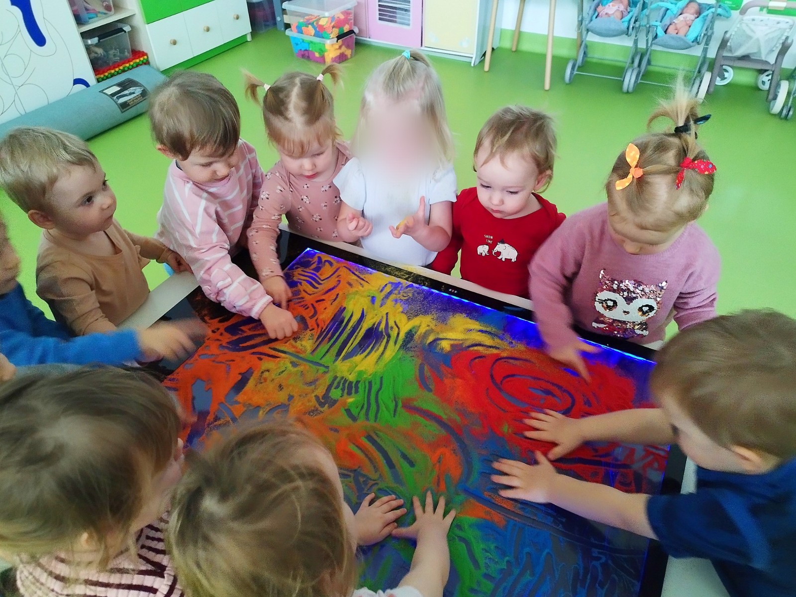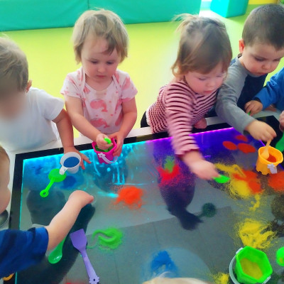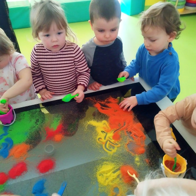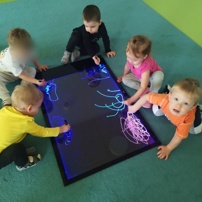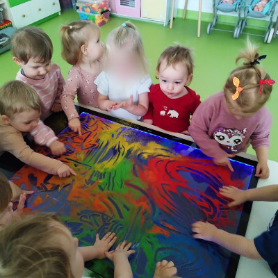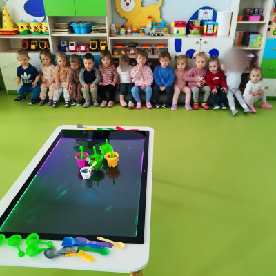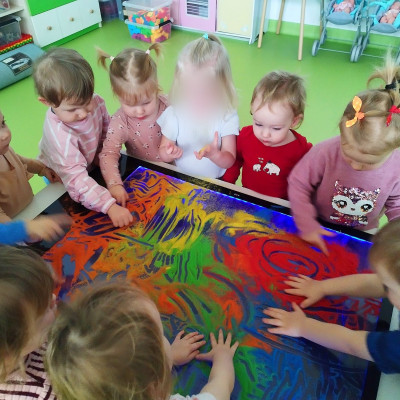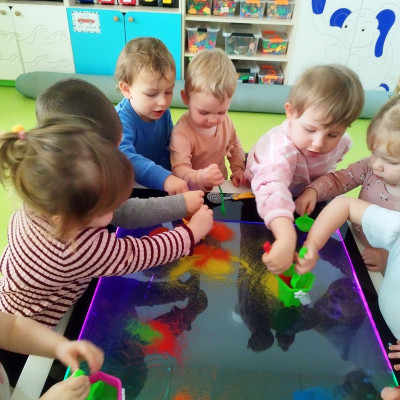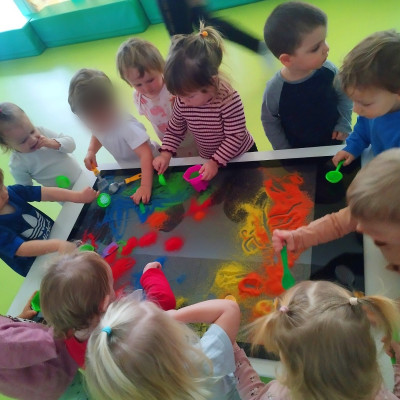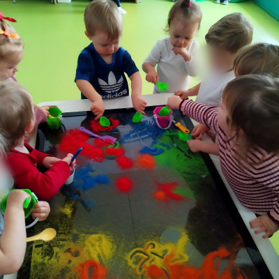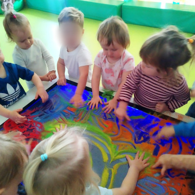 Tym razem dzieci z grupy Tygryski wzięły udział w zajęciach z piaskiem kinetycznym i podświetlanym panelem. Mogły swobodnie sypywać, przesiewać i wysypywać kolorowy piasek oraz za pomocą rączek i paluszków tworzyć różne wzory i szlaczki.