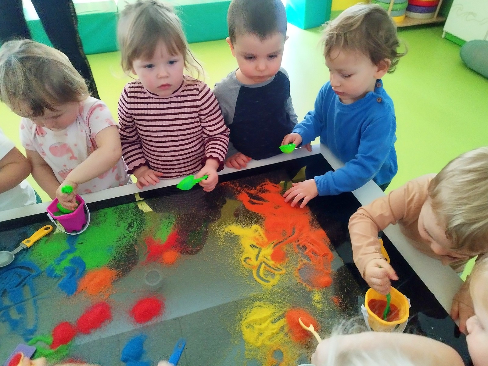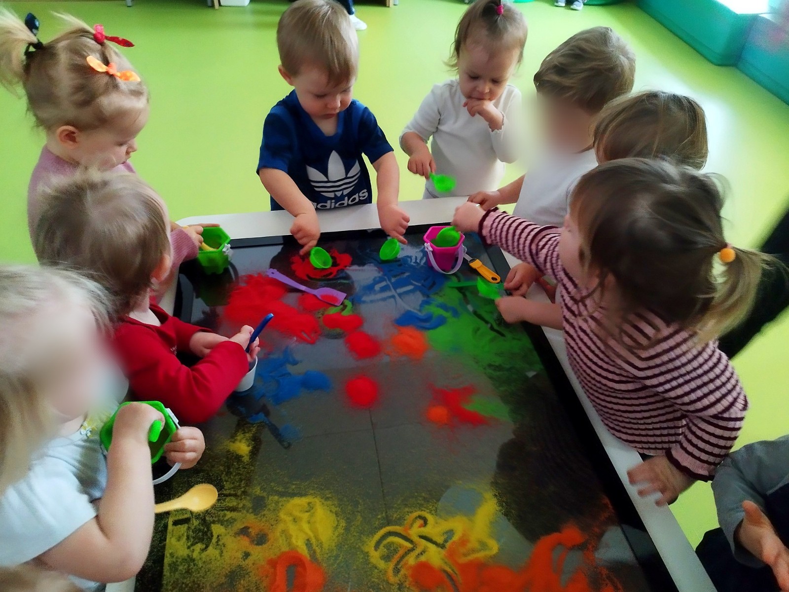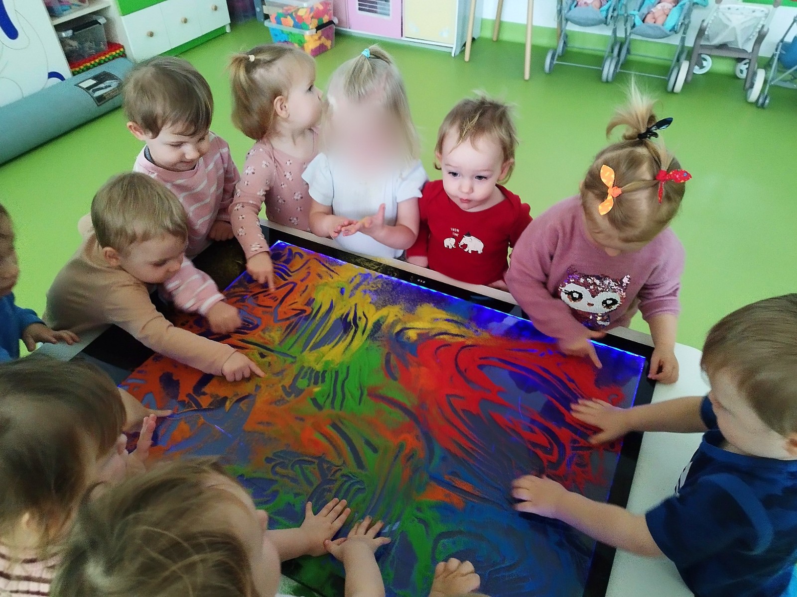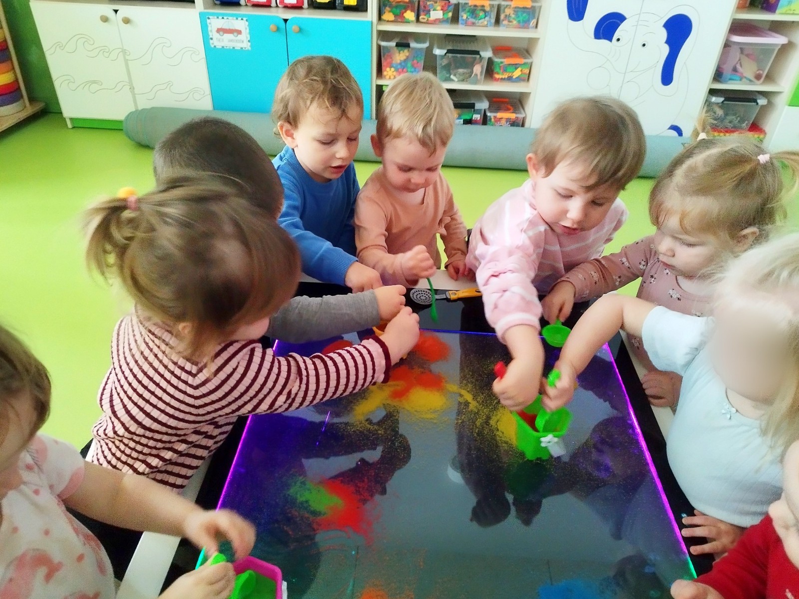 Tym razem dzieci z grupy Tygryski wzięły udział w zajęciach z piaskiem kinetycznym i podświetlanym panelem. Mogły swobodnie sypywać, przesiewać i wysypywać kolorowy piasek oraz za pomocą rączek i paluszków tworzyć różne wzory i szlaczki.