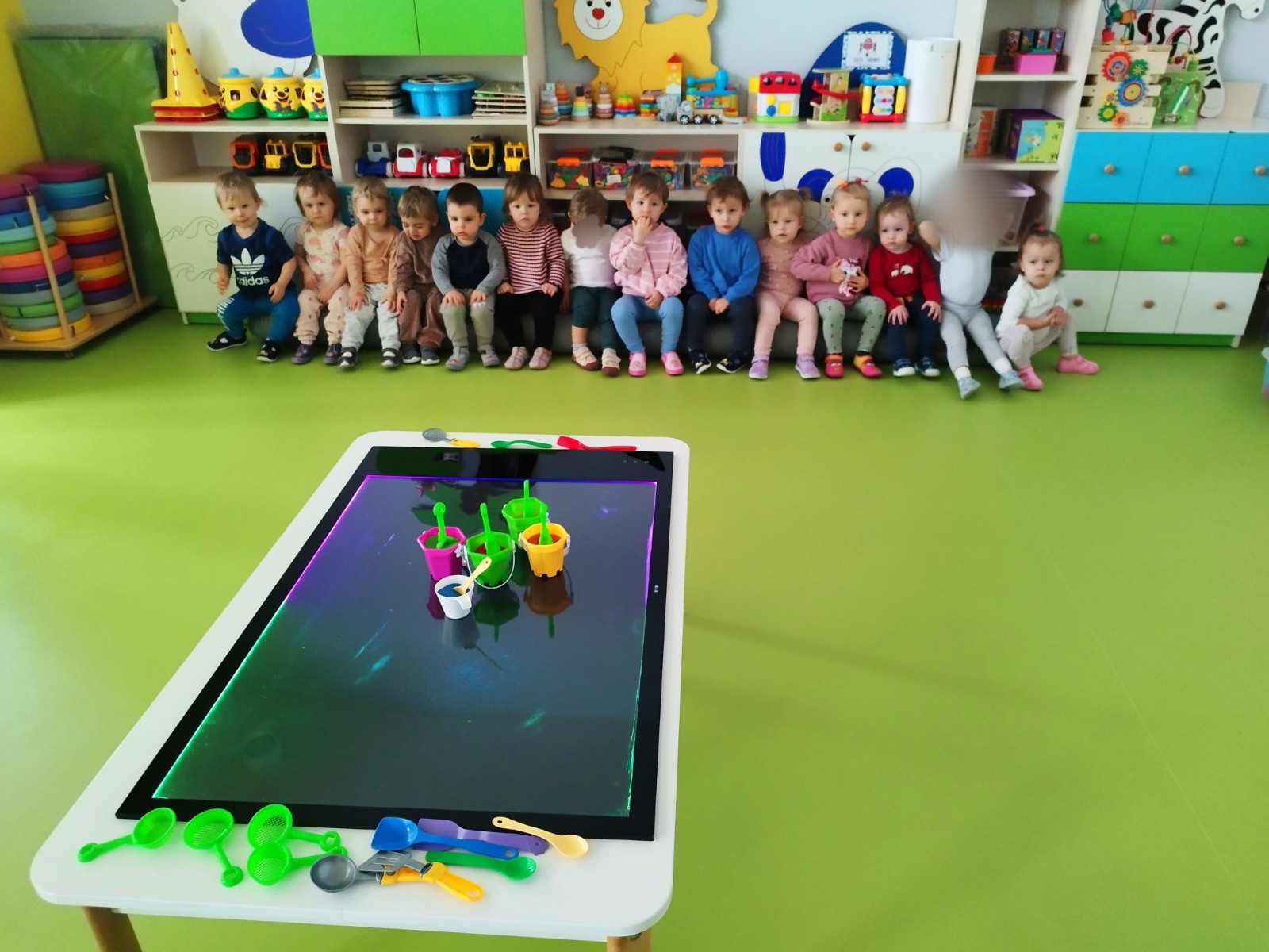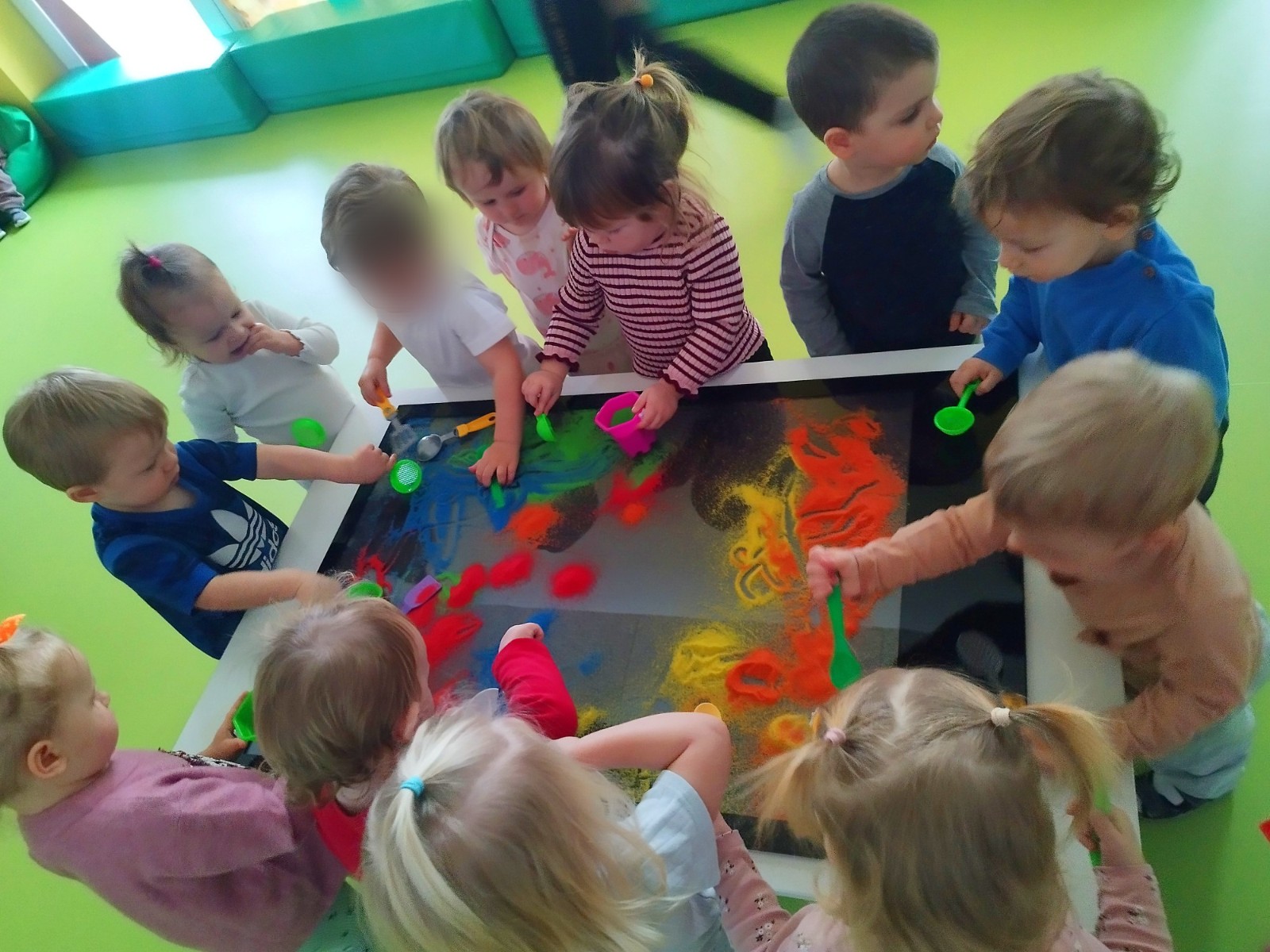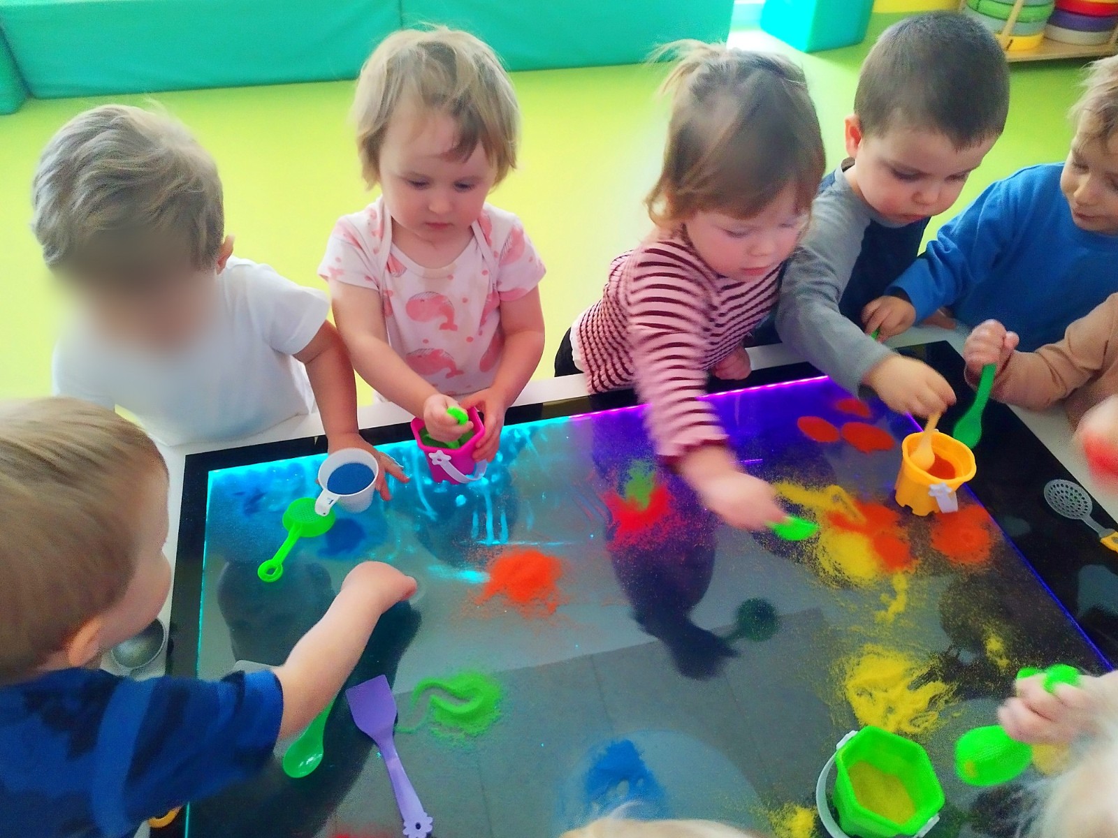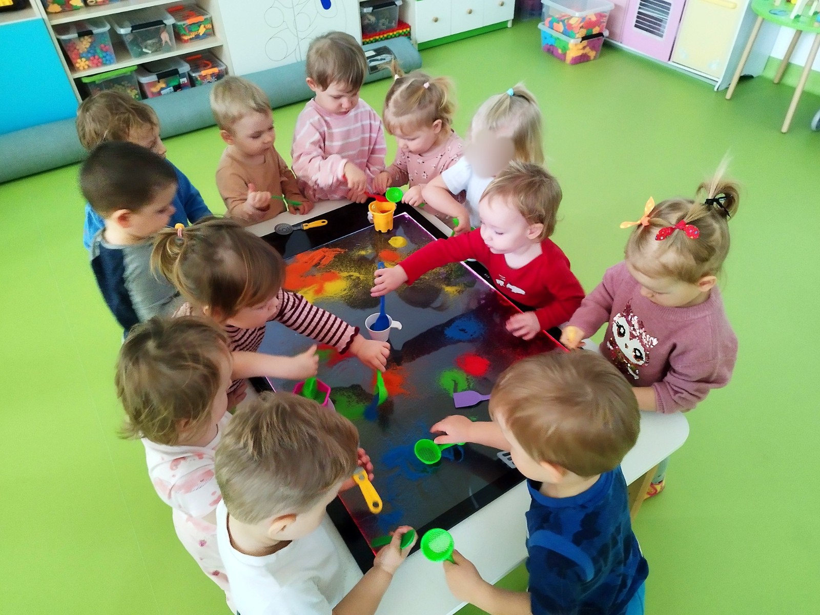 Tym razem dzieci z grupy Tygryski wzięły udział w zajęciach z piaskiem kinetycznym i podświetlanym panelem. Mogły swobodnie sypywać, przesiewać i wysypywać kolorowy piasek oraz za pomocą rączek i paluszków tworzyć różne wzory i szlaczki.