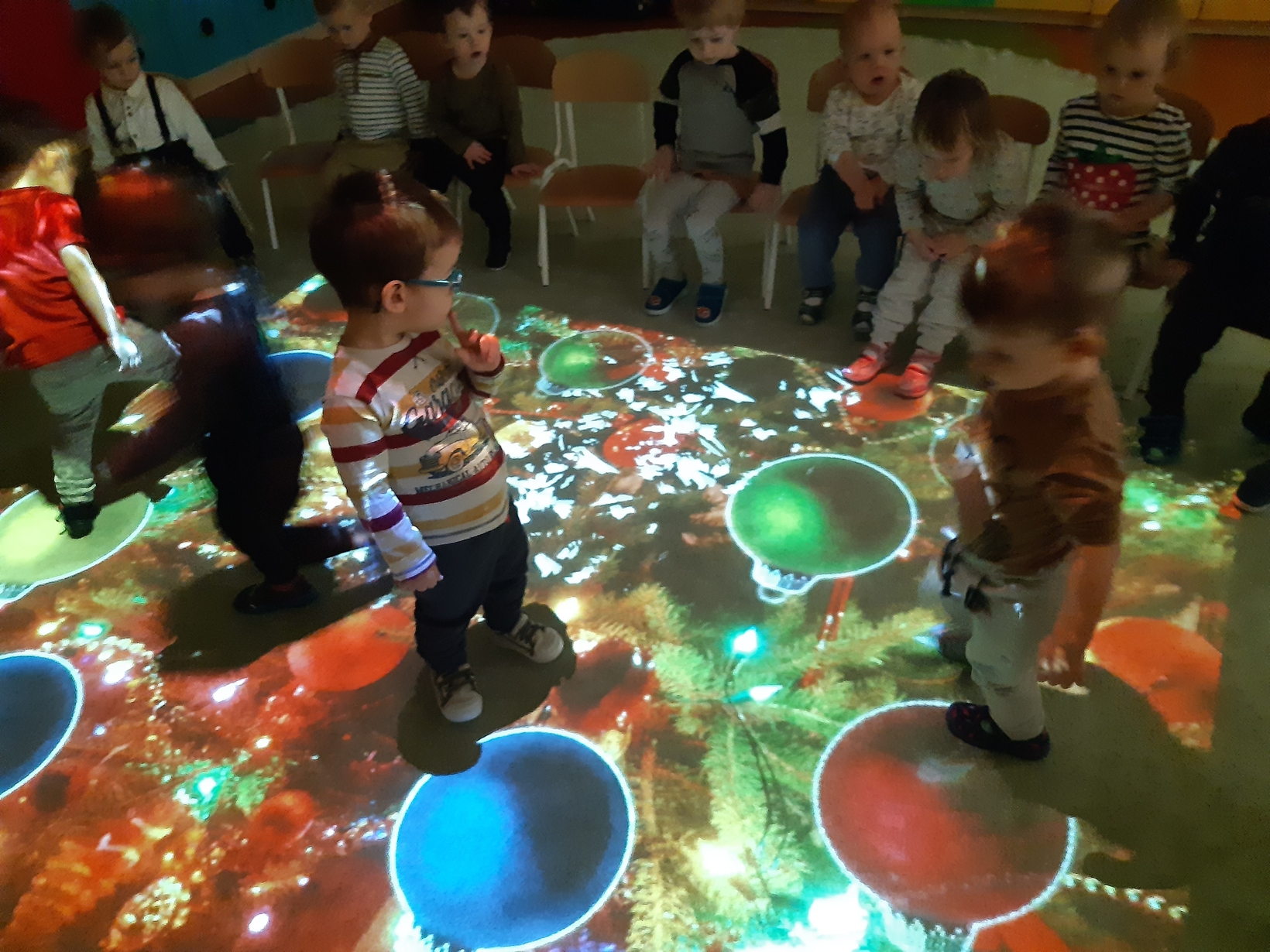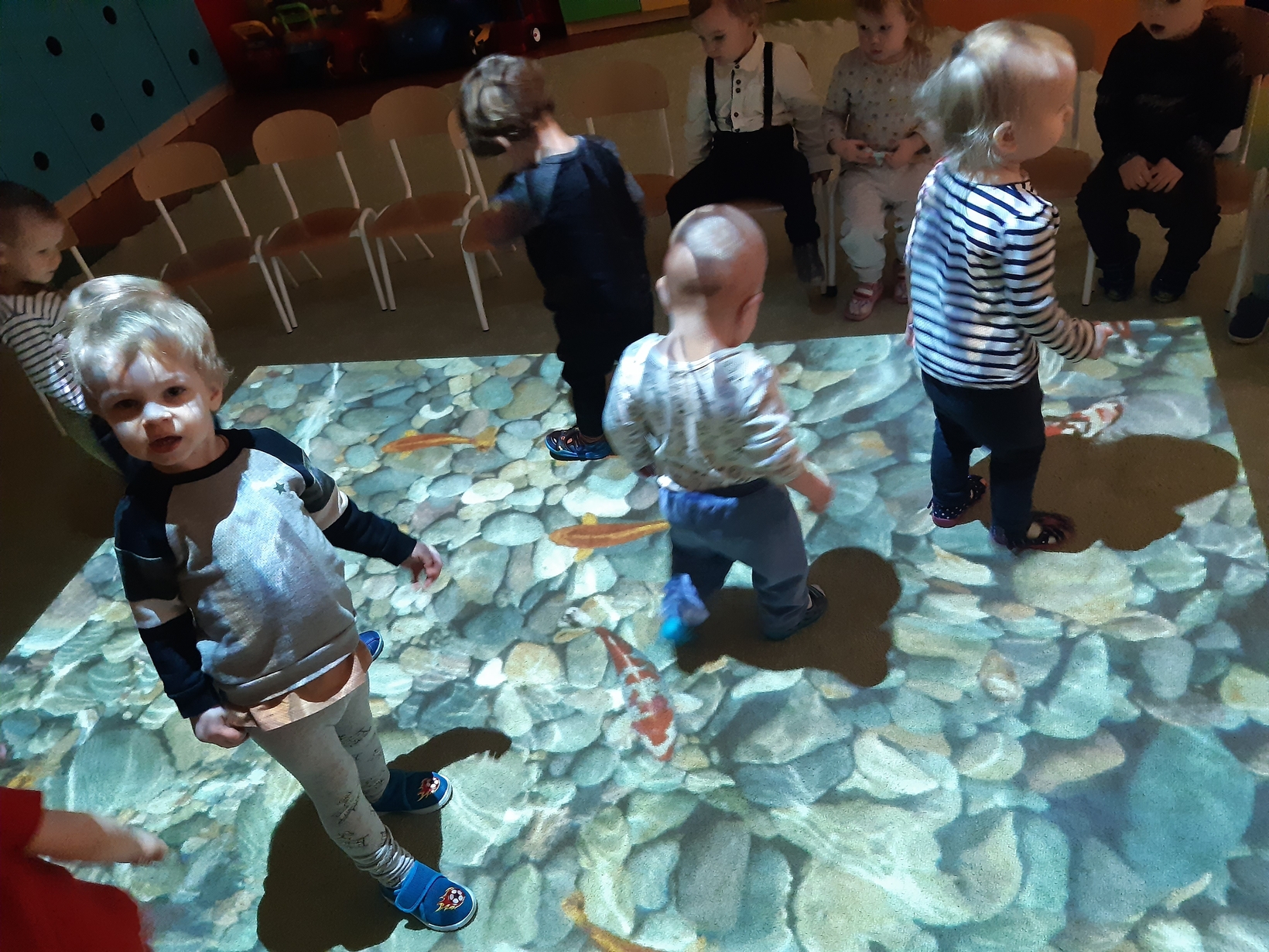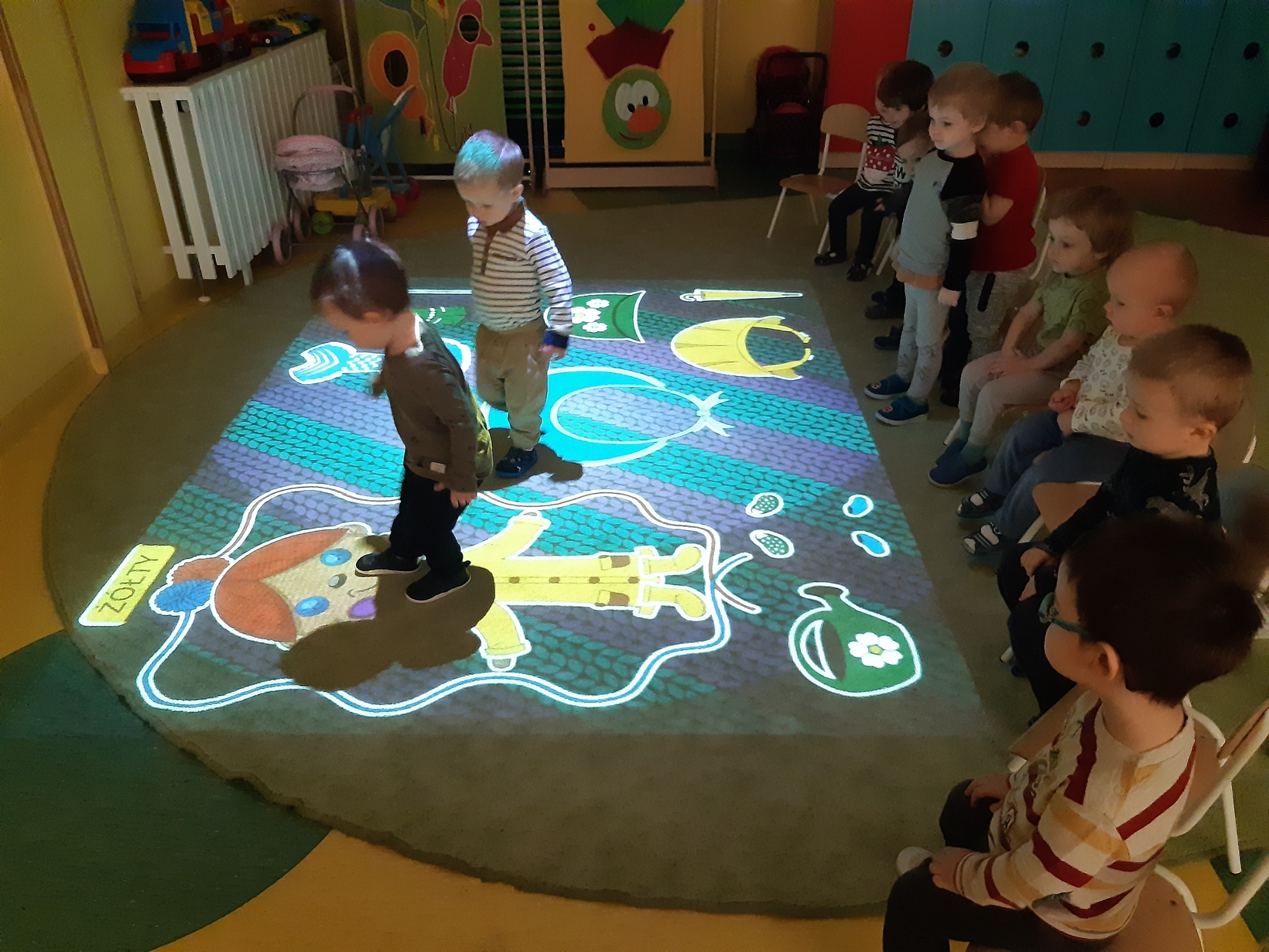 W czwartek 12 stycznia dzieci z grupy Żabki brały udział w zajęciach z wykorzystaniem podłogi interaktywnej. W tym celu udały się z paniami opiekunkami na grupę Rybek, na której zamontowane jest to urządzenie. Na dywanie interaktywnym skakały po kamieniach, rozbijały kolorowe balony , łapały rybki w wirtualnej rzece , uczyły się przechodzić na drugą stronę ulicy. Poprzez te zajęcia dzieci w doskonały sposób usprawniały koordynację wzokowo-ruchową, spostrzegawczość, motorykę małą i dużą, uczyły się cierpliwości.
