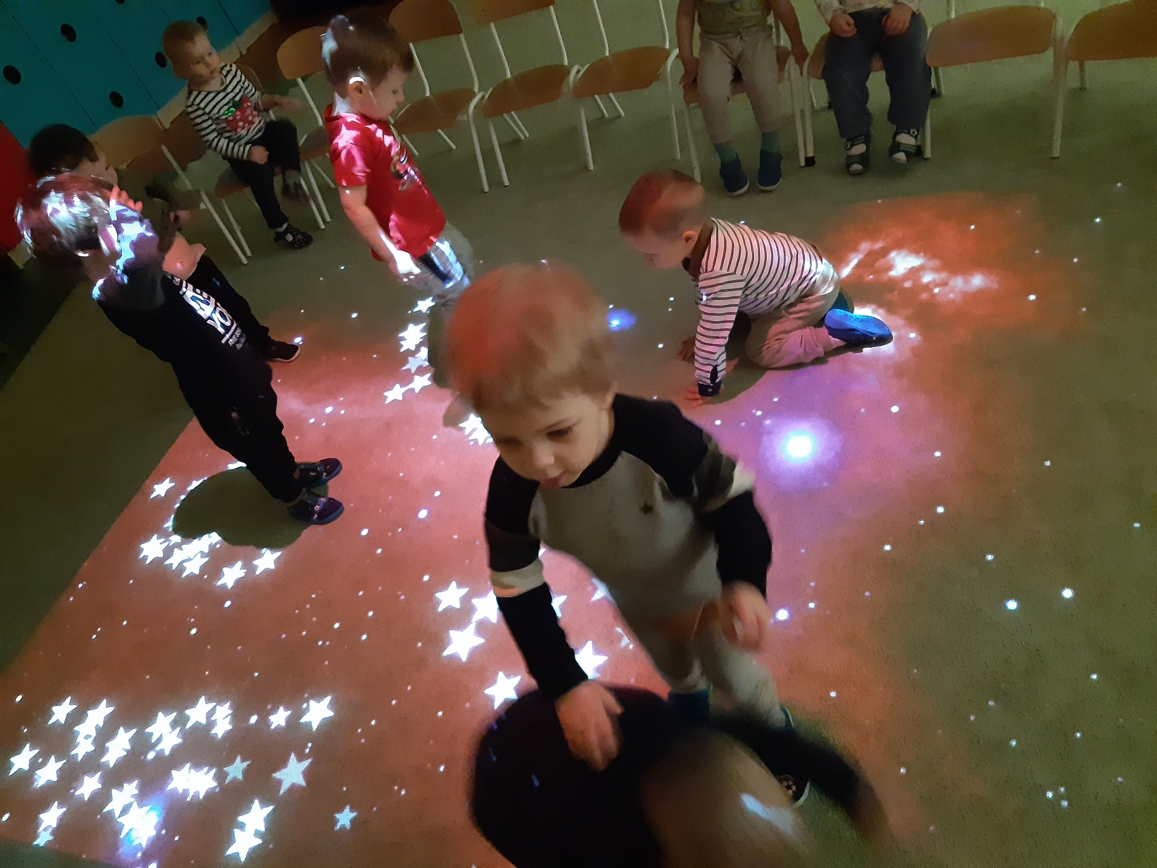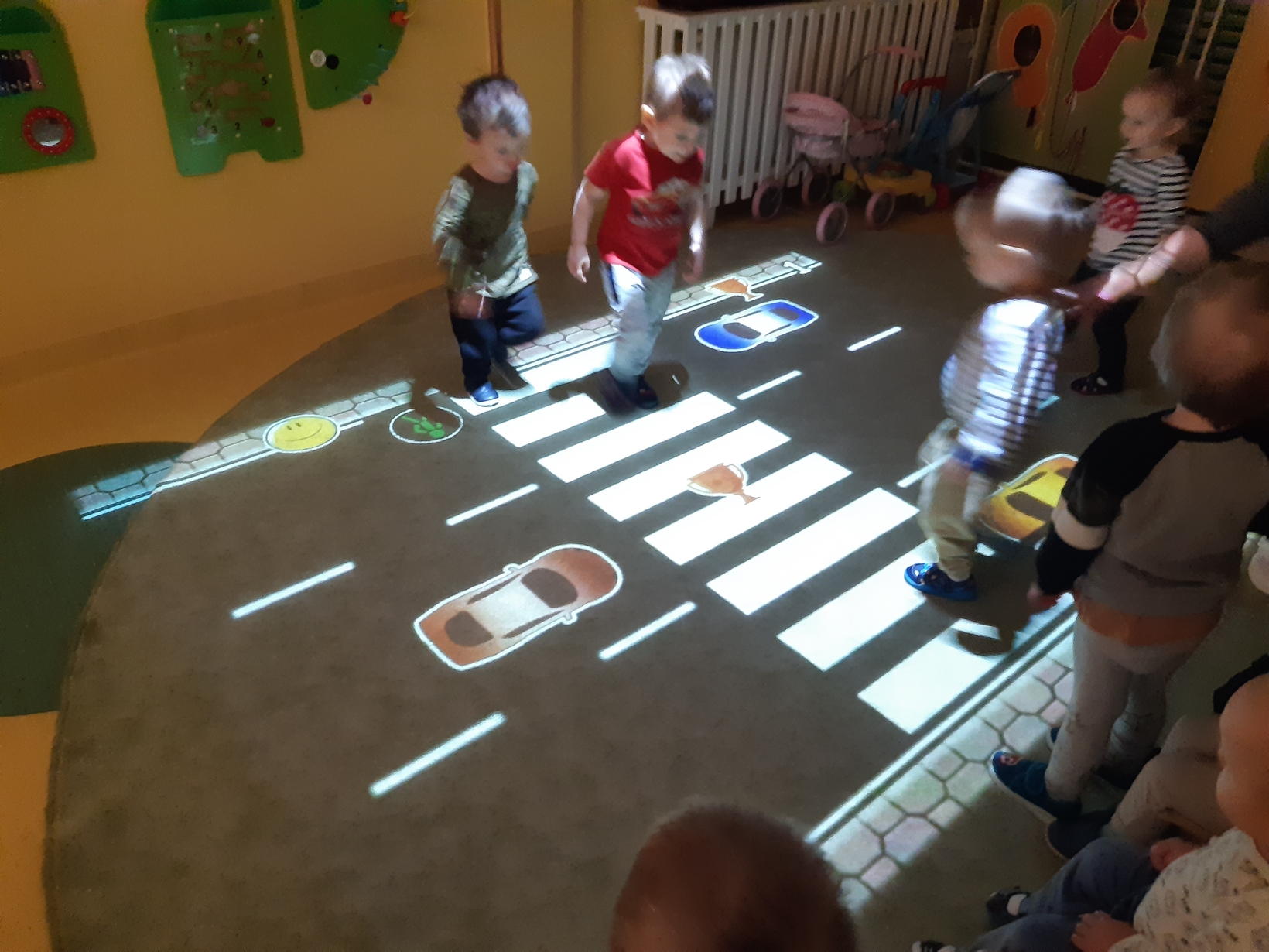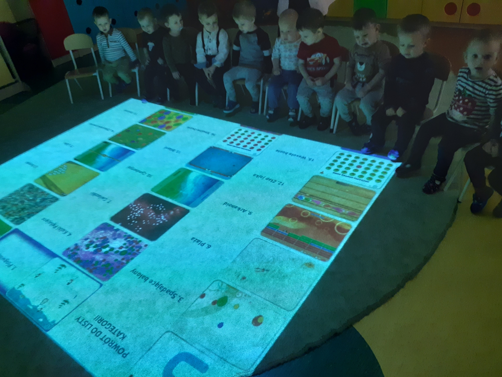 W czwartek 12 stycznia dzieci z grupy Żabki brały udział w zajęciach z wykorzystaniem podłogi interaktywnej. W tym celu udały się z paniami opiekunkami na grupę Rybek, na której zamontowane jest to urządzenie. Na dywanie interaktywnym skakały po kamieniach, rozbijały kolorowe balony , łapały rybki w wirtualnej rzece , uczyły się przechodzić na drugą stronę ulicy. Poprzez te zajęcia dzieci w doskonały sposób usprawniały koordynację wzokowo-ruchową, spostrzegawczość, motorykę małą i dużą, uczyły się cierpliwości.