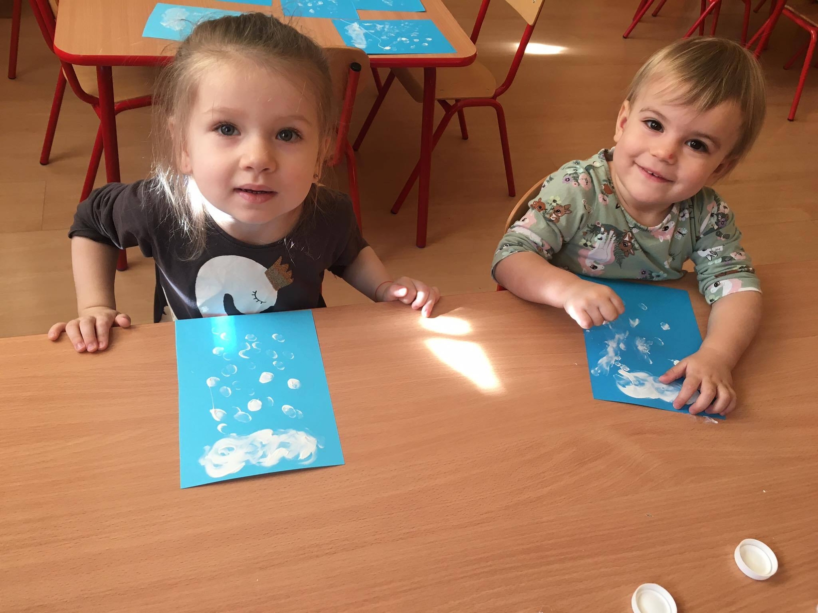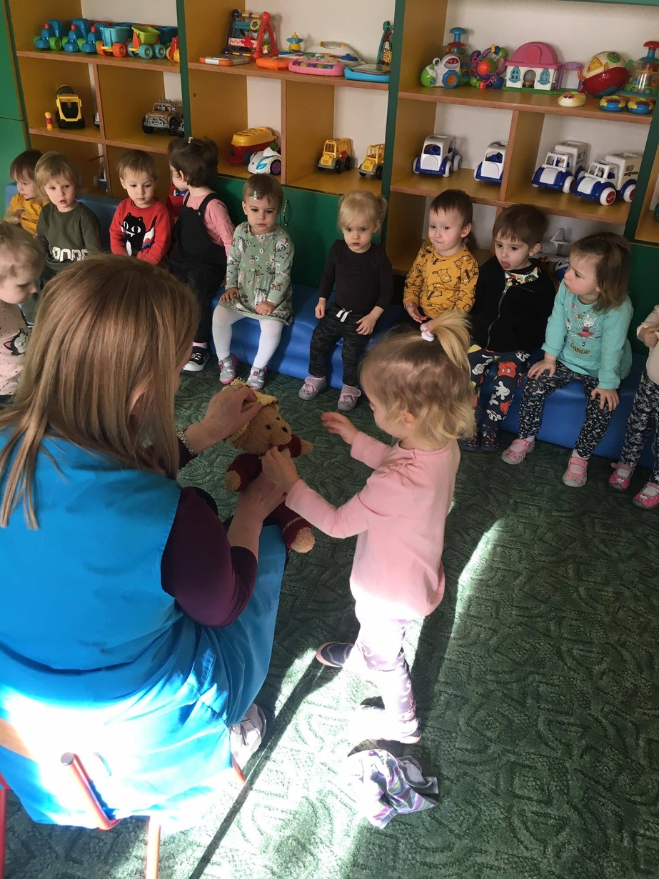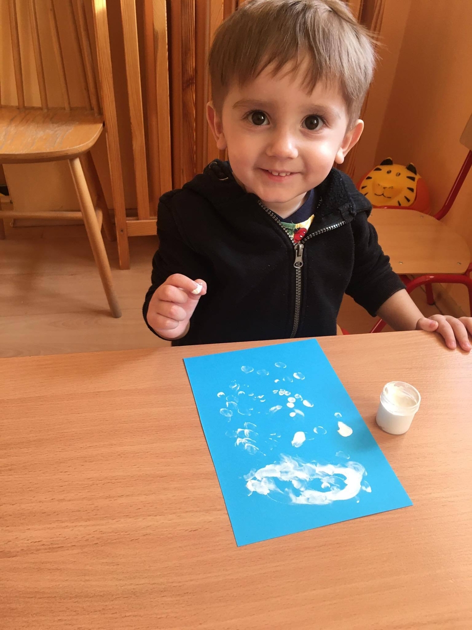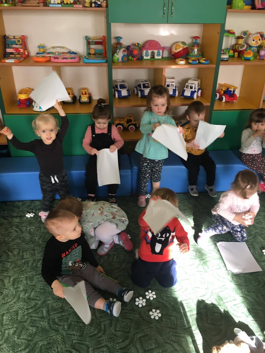 Dzieci z grupy 3 „ Misie ” dowiedziały się podczas wspólnych zabaw, że w zimową pogodę łatwo o przeziębienie. Pomogły misiowi ubrać się właściwie przed wyjściem na dwór. Naśladowały własnym ruchem wiejący wiatr. Na koniec wykonały pracę plastyczną - chmurkę oraz spadający śnieg. Dzieci przy pomocy palców malowały farbami, ćwicząc przy okazji sprawność manualną. Nie tylko wiele się nauczyły, ale była to dla nich także okazja do świetnej zabawy.