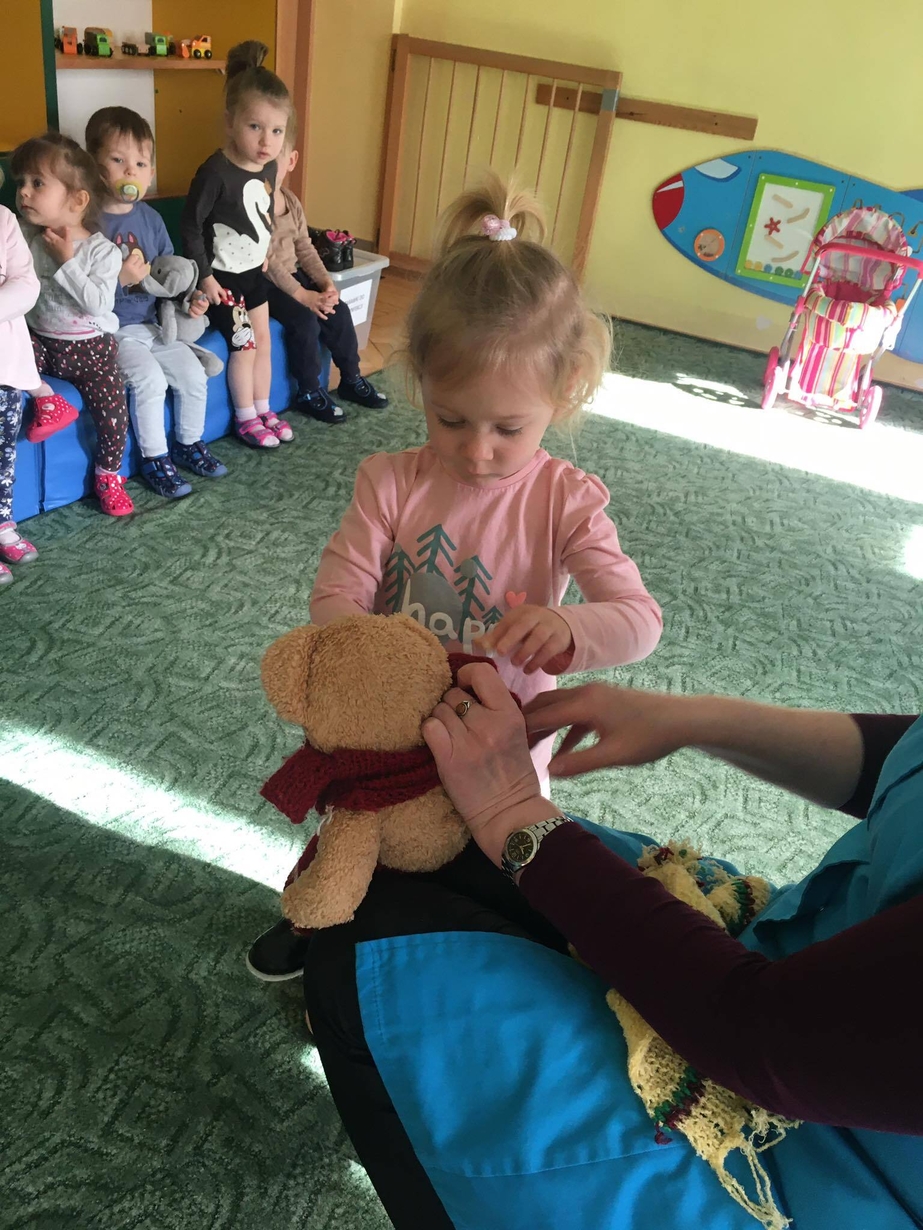 Rozmowa z dziećmi o konieczności dostosowania ubrania do zimowej pogody - zakładania czapki, rękawic oraz szalików.