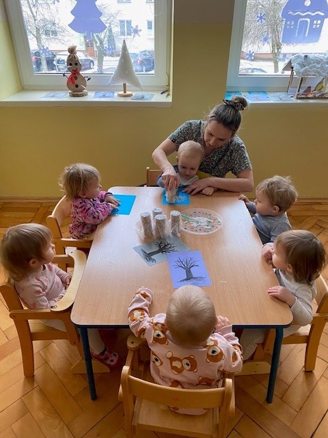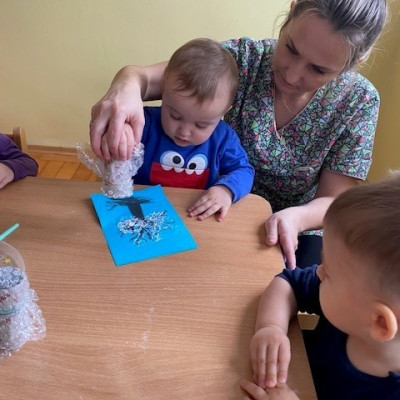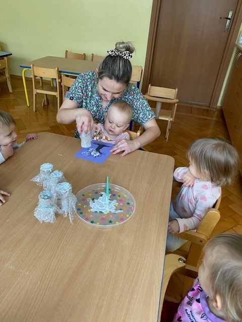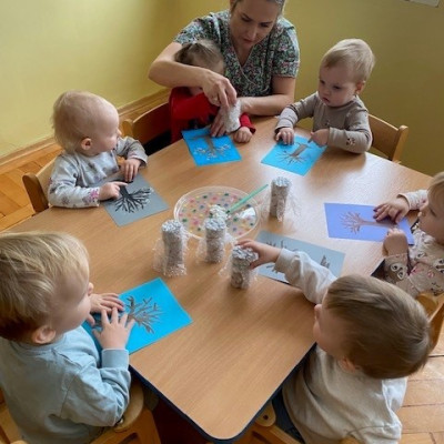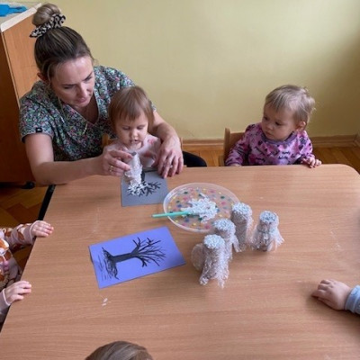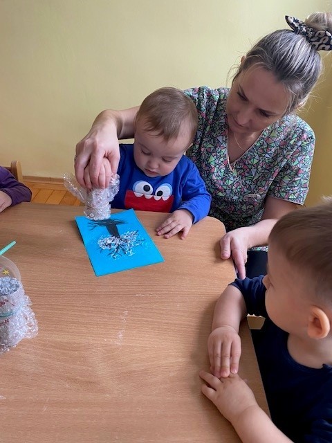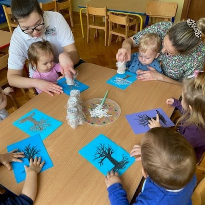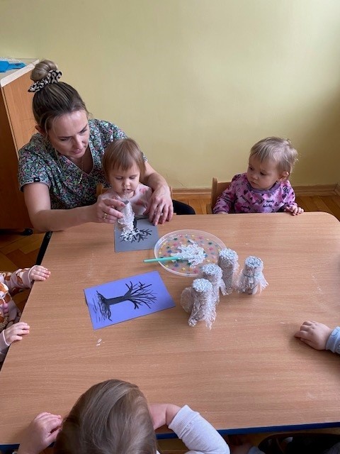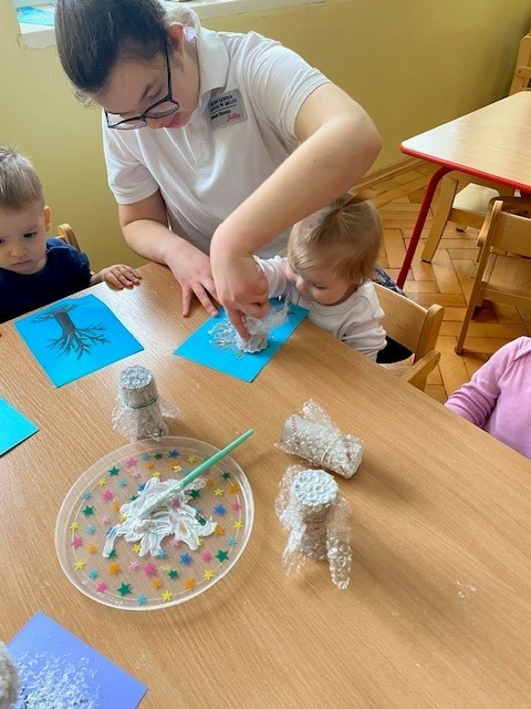 Dzieci malowały z pomocą opiekunek przepiękne drzewa obsypane śniegiem ☺️