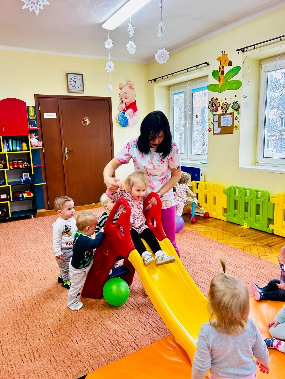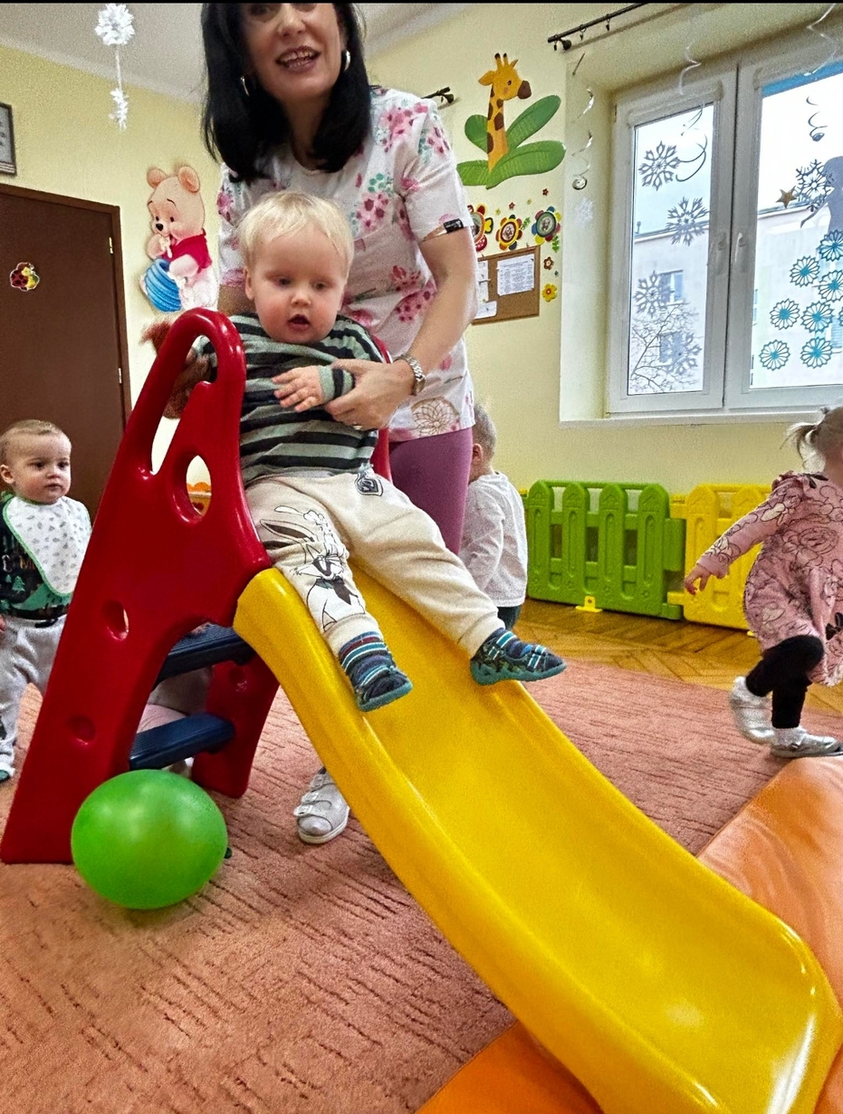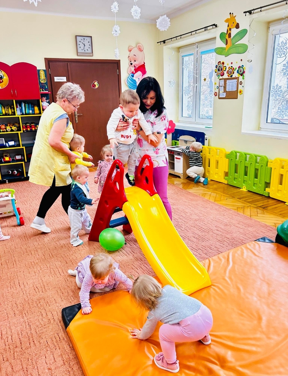 Dziś u ,, Biedroneczek '' ciocie przygotowały na sali plac zabaw ze zjeżdżalnią.