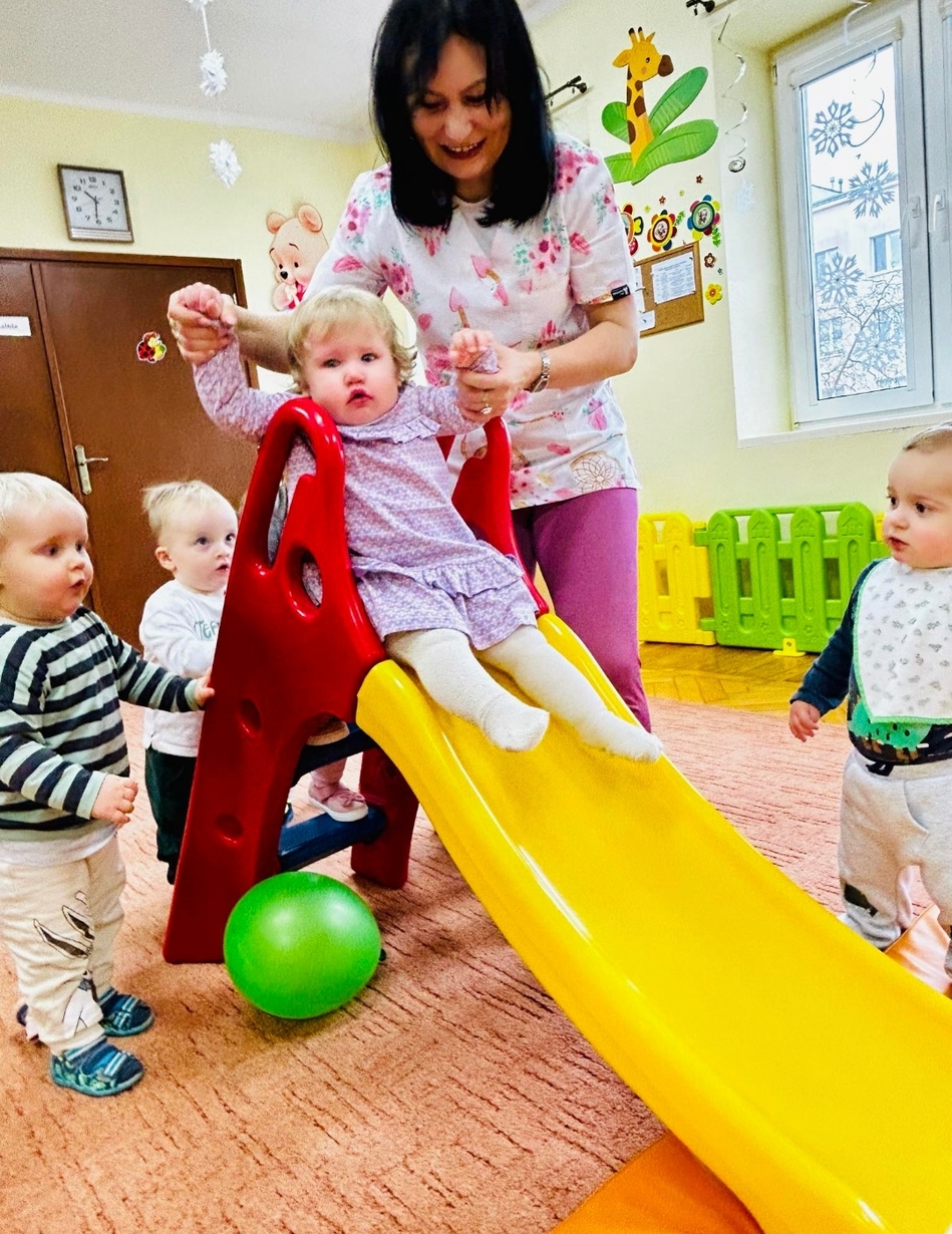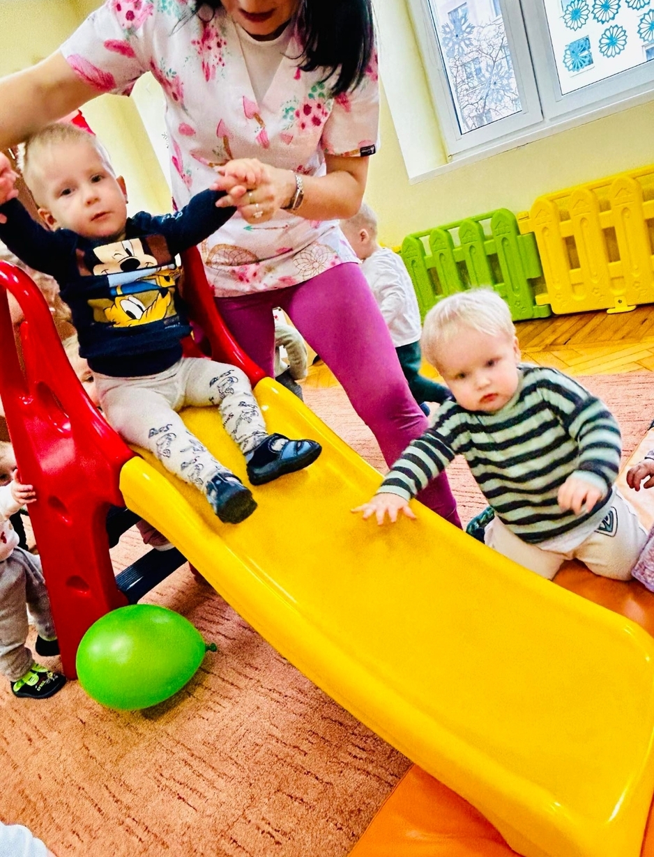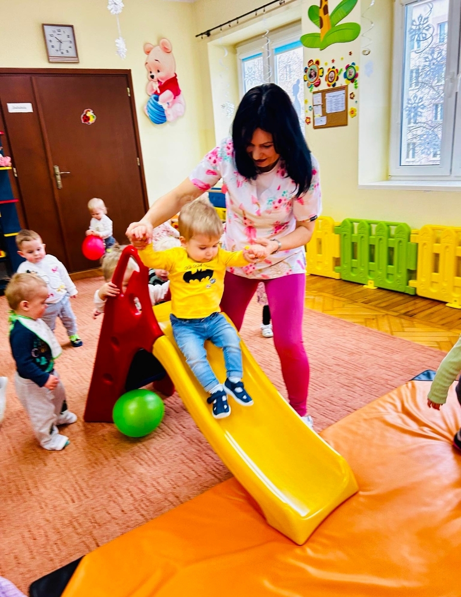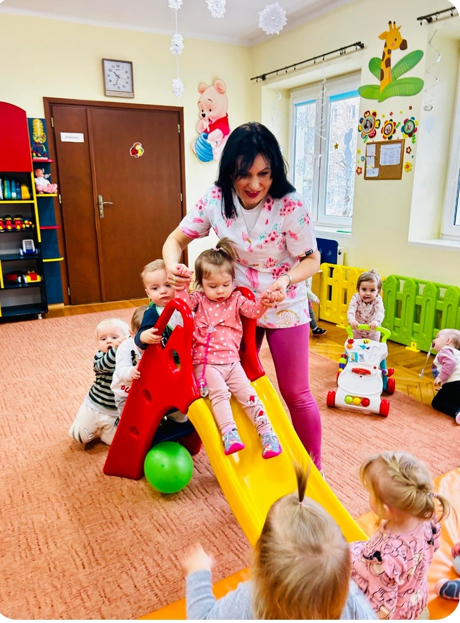 Zabawa na zjeżdżalni rozwija poczucie równowagi i koordynację ruchową.