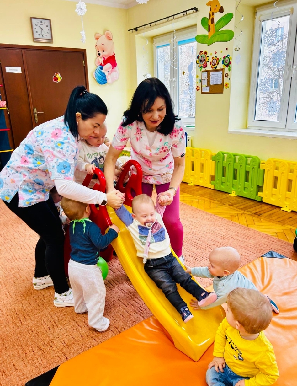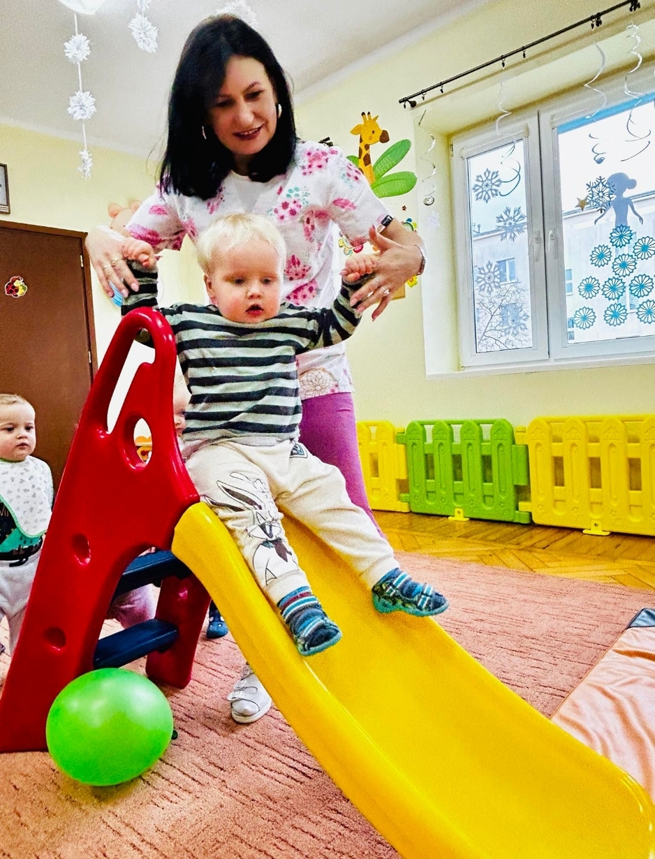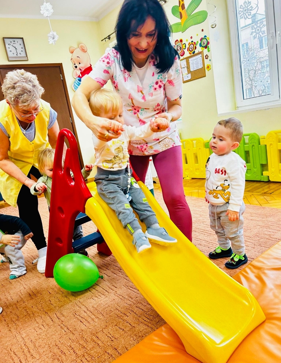 Zabawa na zjeżdżalni rozwija poczucie równowagi i koordynację ruchową.