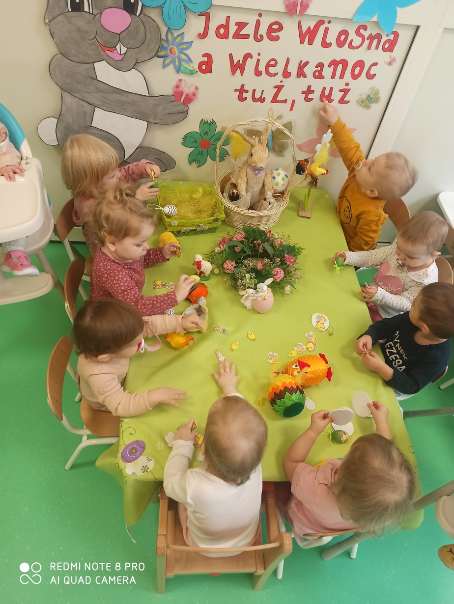 21 marca obchodzimy Pierwszy Dzień Wiosny , a zaraz po tym Święta Wielkanocne . Z tej okazji dzieci z Grupy 1 Misie poznały zjawiska atmosferyczne charakterystyczne dla marcowej pogody ( deszcz , wiatr , śnieg , słońce ) . Obejrzeliśmy również zdjęcia przylatujących do Polski ptaków oraz kwitnące kwiaty wiosenne. Podczas zajęć dzieci wraz z pomocą swoich opiekunek chętnie wzięły udział w sadzeniu wiosennych kwiatów – bratek do doniczek. Wraz z nadejściem wiosny Misie uczestniczyły w tradycji związanej z topieniem Marzanny . Na zakończenie opiekunka zaprezentowała grupie rzeczy jakie powinny znaleźć się w koszyczku wielkanocnym ( pisanki , baranki , zajączki itp. )