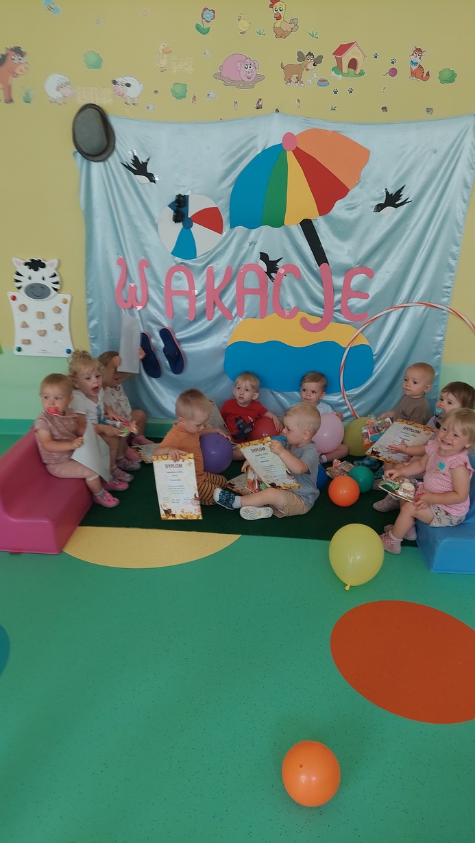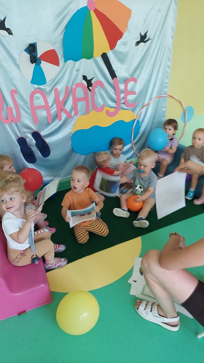 Dziś na gr Misie symbolicznie żegnamy się z dziećmi, które niebawem zaczną kolejny etap swojej zabawy na starszych grupach. Tego dnia dzieci poznały ciekawe miejsca, które można odwiedzić podczas wakacji. Bawiliśmy się również w ,,czarodziejski worek " z którego dzieci wyciągały ciekawe akcesoria potrzebne podczas wakacyjnych przygód, były też wesołe pląsy w rytm letnich przebój. Na koniec każde dziecko dostało upominek oraz podziękowania od swoich pań.