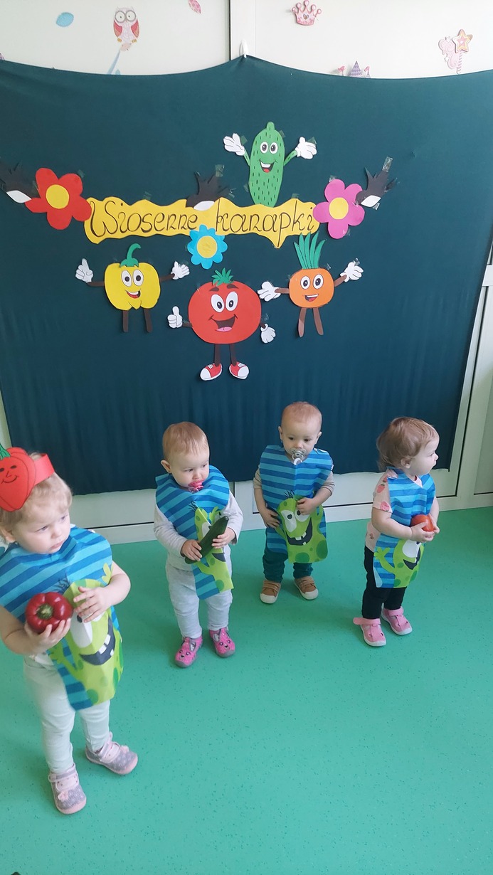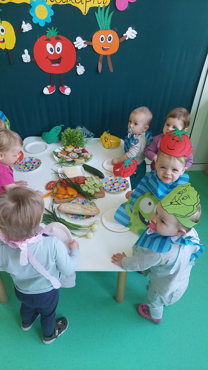 W dniu dzisiejszym dzieci z grupy Misie brały udział w zajęciach, w których wraz z ciociami przygotowały wiosenne kanapki. Na stole zagościły pierwsze wiosenne warzywa: ogórek, pomidor, pyszny i pachnący szczypior, papryka, sałata, a także rzodkiewka. Nasze Misie ubrane w piękne fartuszki z opaskami na głowie przedstawiające warzywa zabrały się do pracy. Każde dziecko samodzielnie, lub z niewielką pomocą konponowało swoją kanapkę. Powstały bardz zdrowe, pachnące, kolorowe i pełne witamin przekąski, które później bardzo szybko znikneły z talerza.