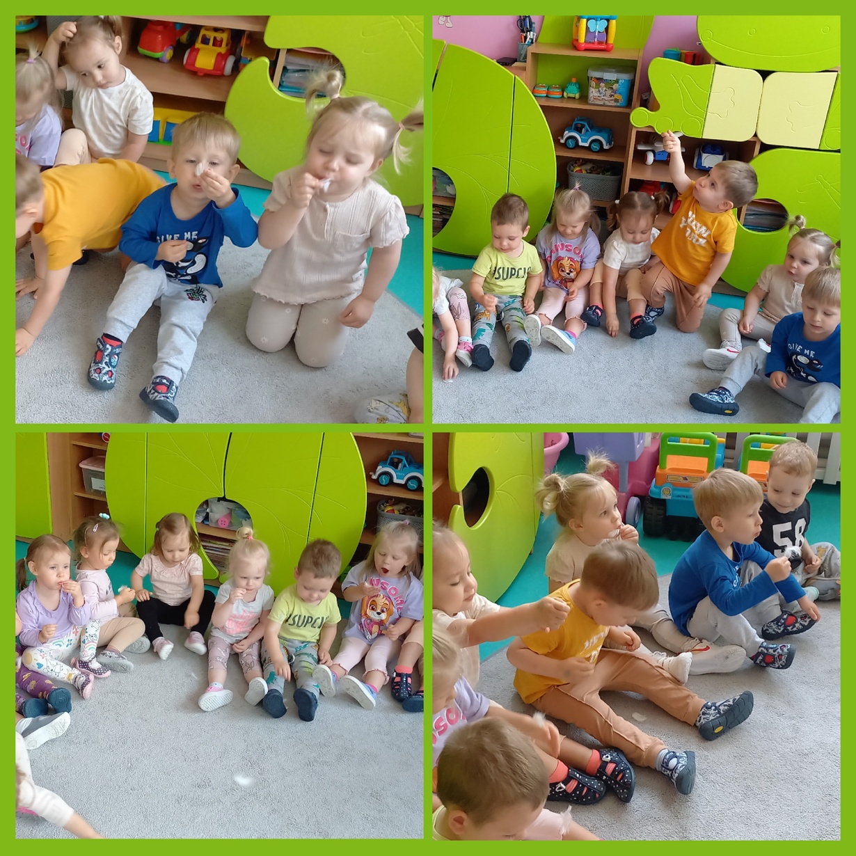 Dziś na grupie Żabki były prowadzone zajęcia logopedyczne. Dzieci z entuzjazmem robiły różne miny, pięknie ćwiczyły artykulację oraz wykonywały ćwiczenia oddechowe. Następnie stworzyły kury, które podczas dmuchania wyskakiwały z kubeczka.