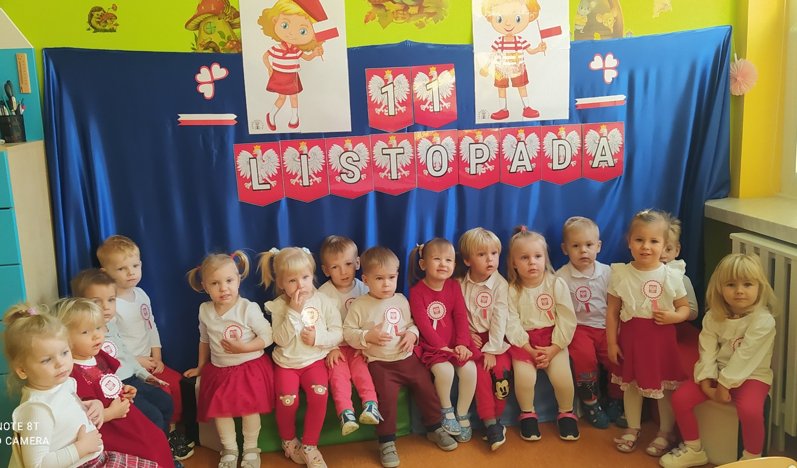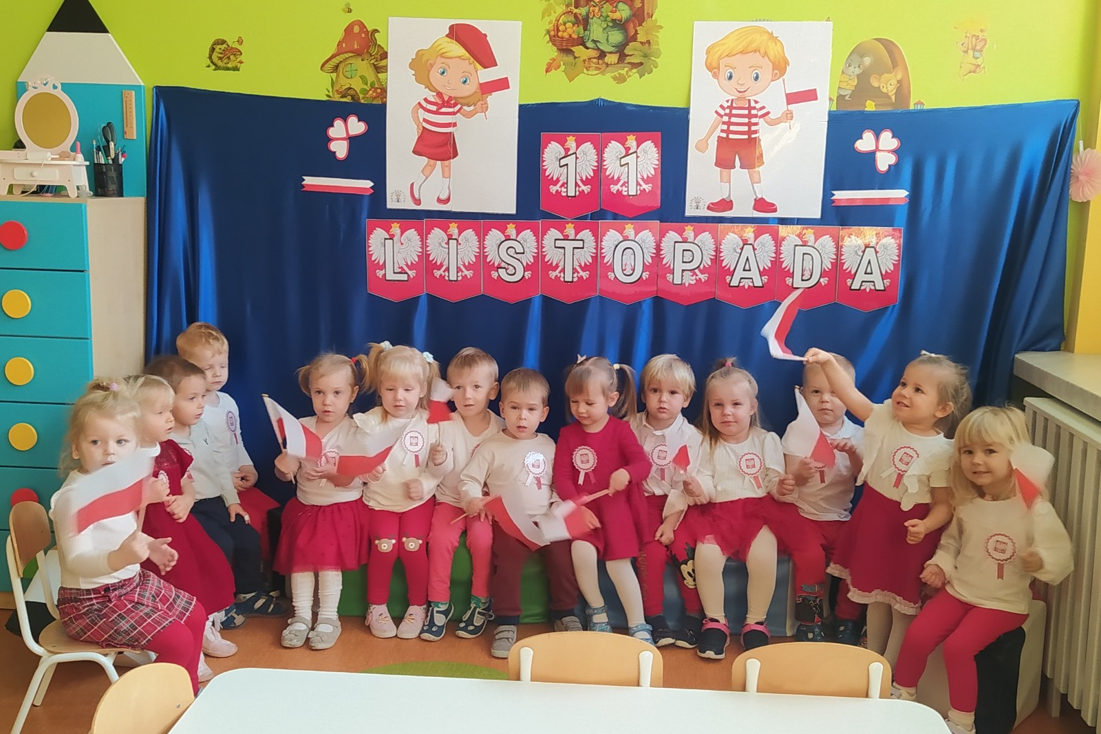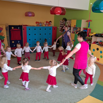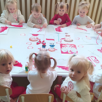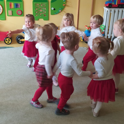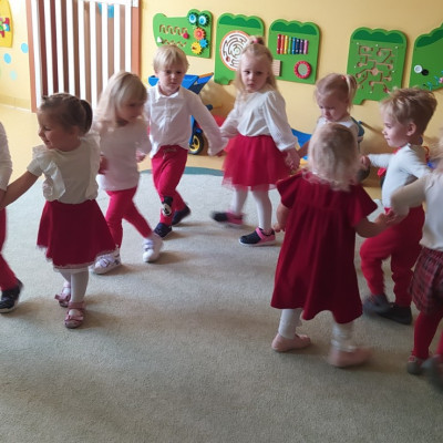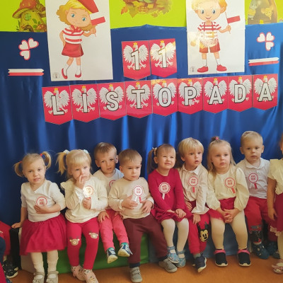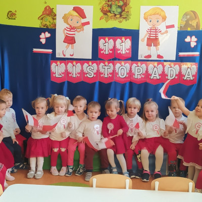W dniu 7 Listopada 2024 r. obchodziliśmy w naszym Żłobku Święto Niepodległości. W tak ważnym dniu dzieci prezentowały się niezwykle uroczyście w galowych strojach. Podkreślając wagę naszych symboli narodowych: Godła, Flagi, Hymnu oraz znaczenia Ojczyzny w naszym życiu-dzieci wysłuchały Hymn Polski,, Mazurek Dąbrowskiego".Grupa ,, Rybki" wykonała własnoręcznie czerwoną włóczką Flagę Polski imitującą obszar naszego kraju. Było przepięknie, wzruszająco i uroczyście. Wszyscy przeżyli lekcję patriotyzmu i miłości do kraju ojczystego, która na długo pozostanie w pamięci naszych,, Małych Polaków"