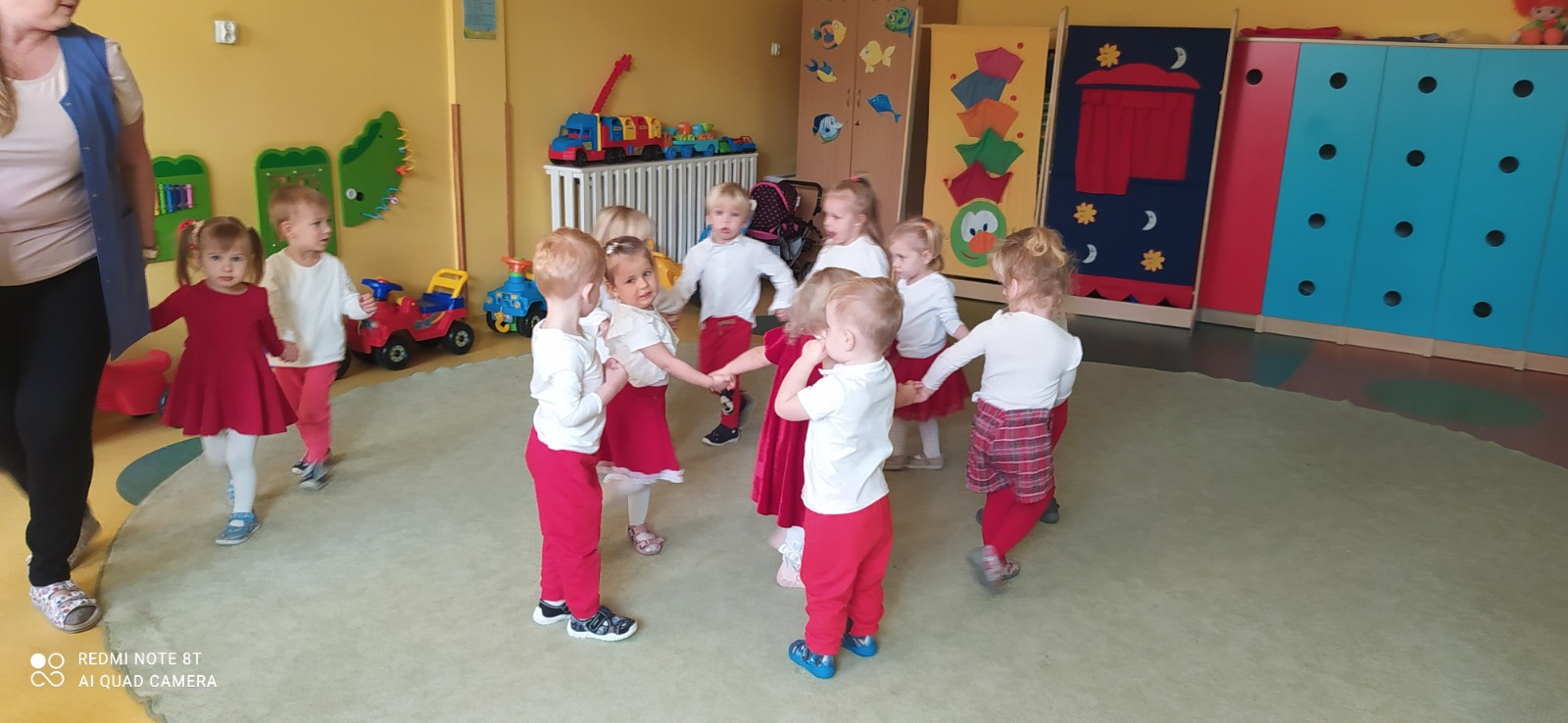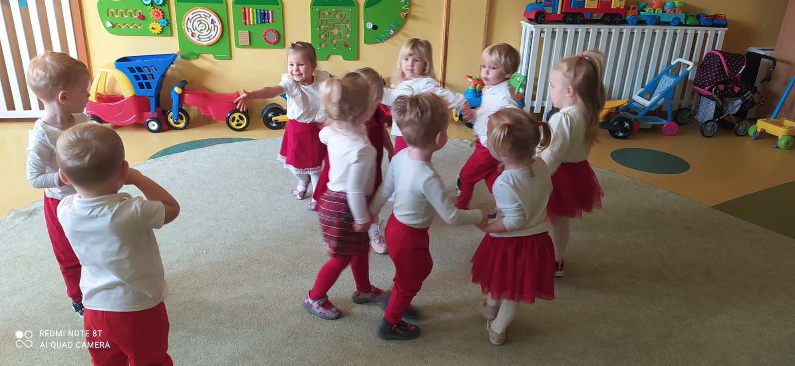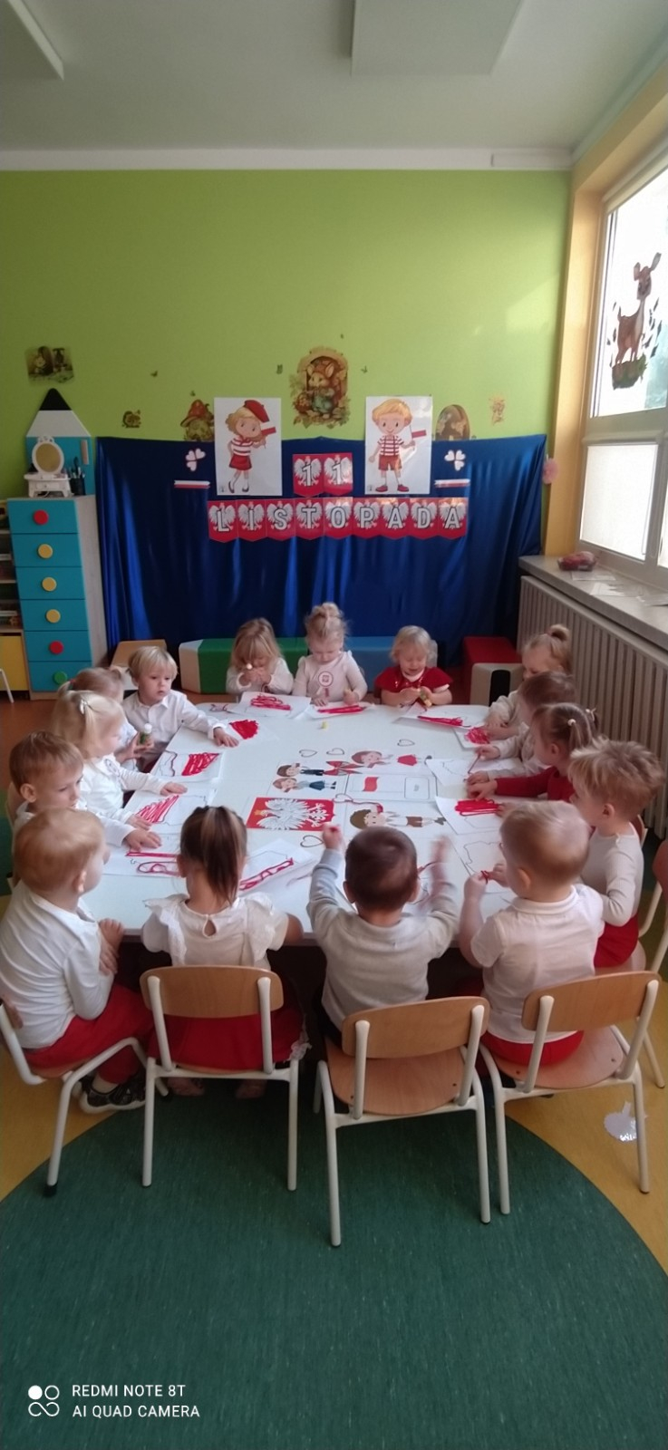 W dniu 7 Listopada 2024 r. obchodziliśmy w naszym Żłobku Święto Niepodległości. W tak ważnym dniu dzieci prezentowały się niezwykle uroczyście w galowych strojach. Podkreślając wagę naszych symboli narodowych: Godła, Flagi, Hymnu oraz znaczenia Ojczyzny w naszym życiu-dzieci wysłuchały Hymn Polski,, Mazurek Dąbrowskiego".Grupa ,, Rybki" wykonała własnoręcznie czerwoną włóczką Flagę Polski imitującą obszar naszego kraju. Było przepięknie, wzruszająco i uroczyście. Wszyscy przeżyli lekcję patriotyzmu i miłości do kraju ojczystego, która na długo pozostanie w pamięci naszych,, Małych Polaków"