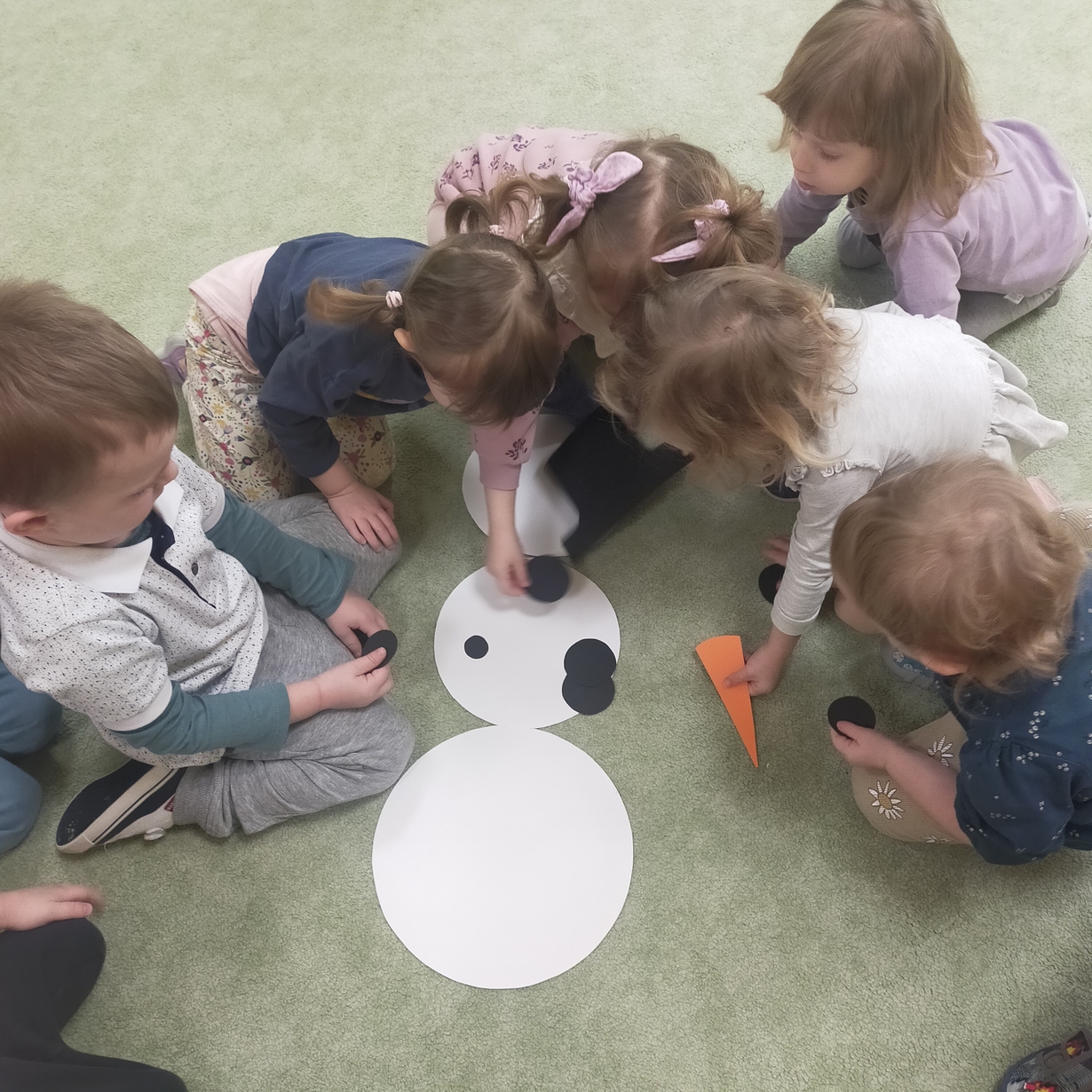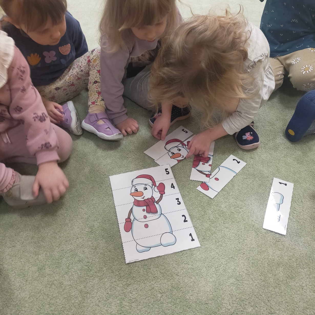 Następnie układały puzzle z sylwetą bałwana oraz samodzielnie składały bałwana z gotowych elementów papieru.