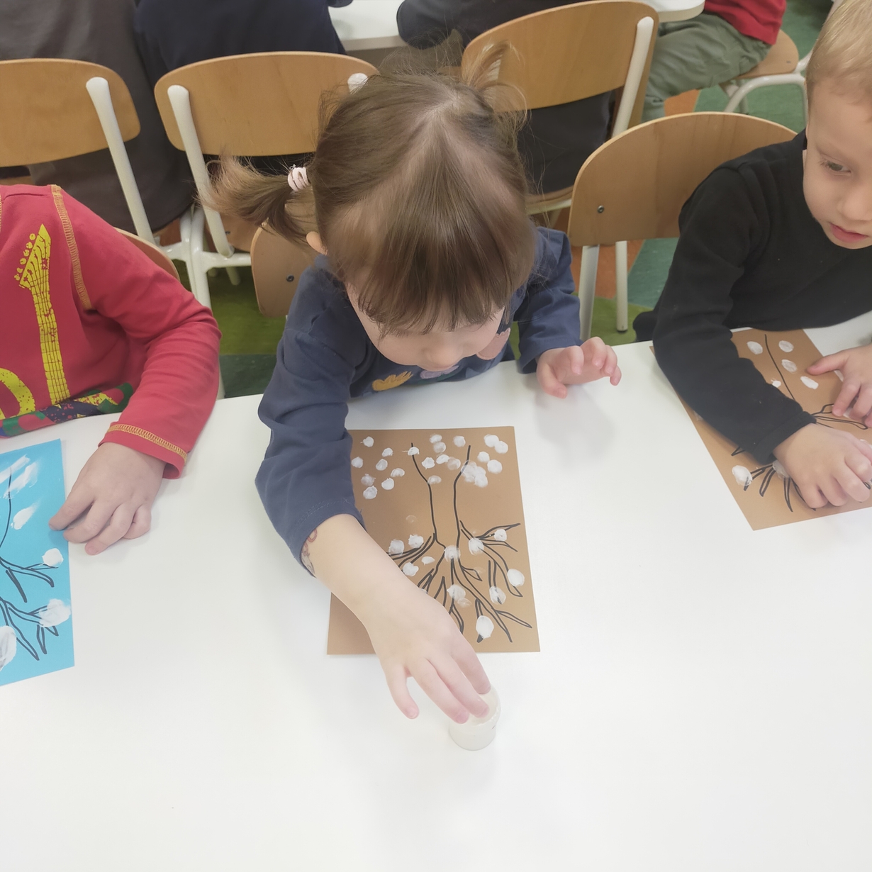 Na koniec zajęć wykonały pracę plastyczną-zima, świetnie się przy tym bawiąc.