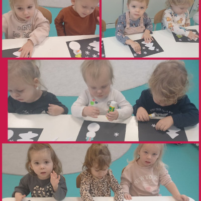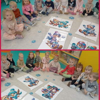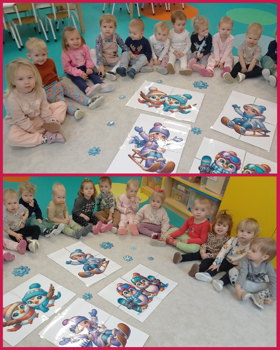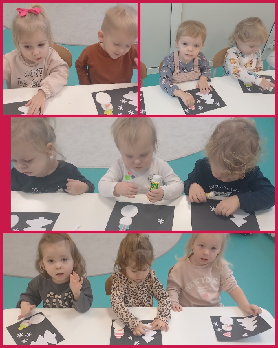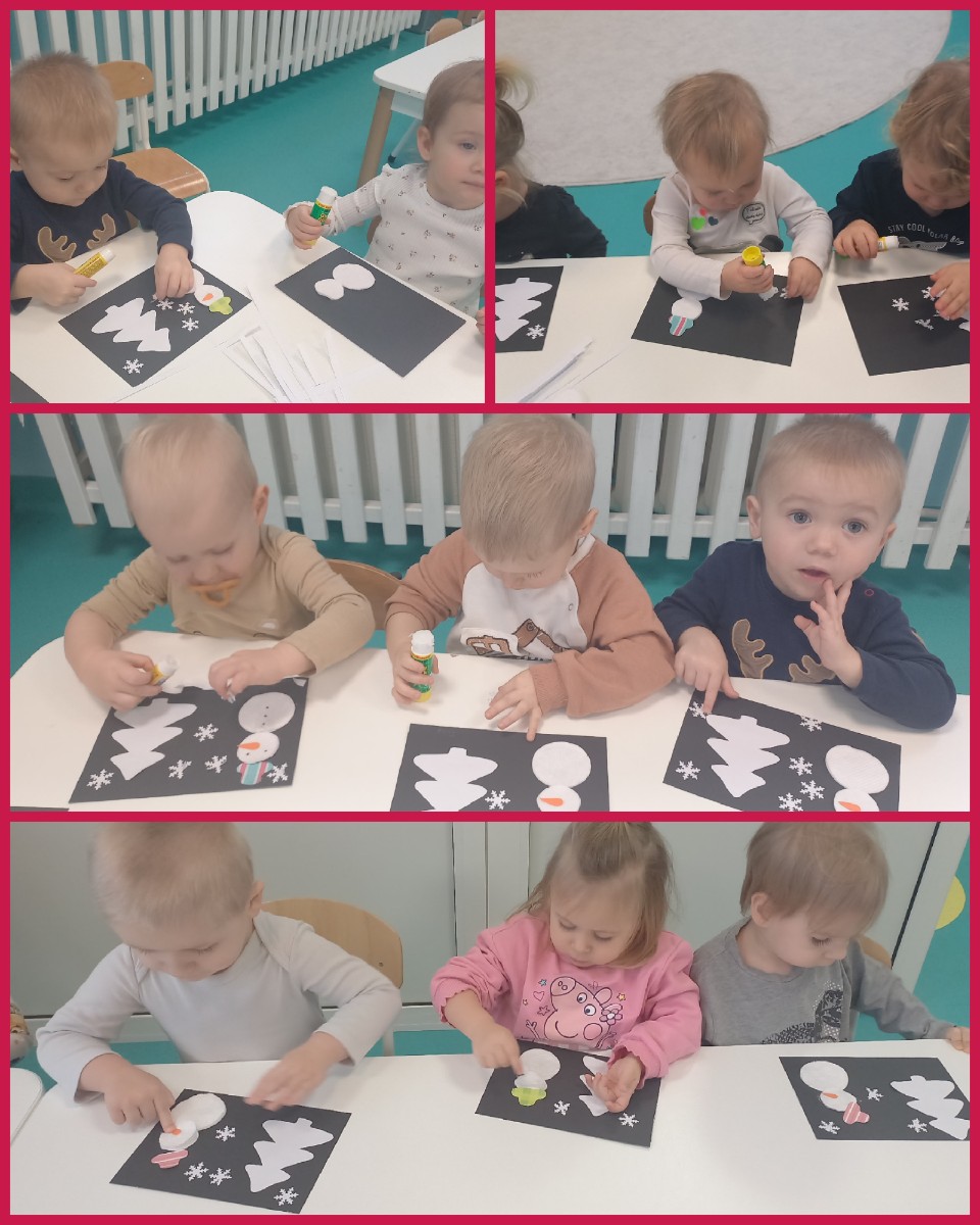 Zdjęcia przedstawiają dzieci biorące udział w zajęciach o tematyce zimowej.