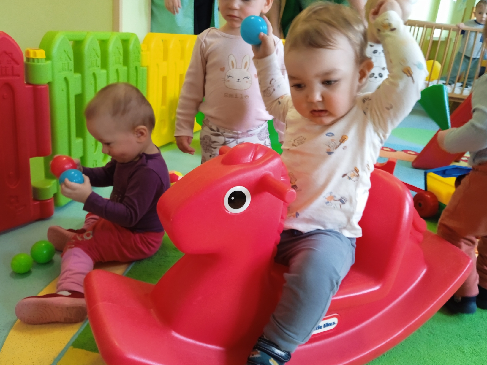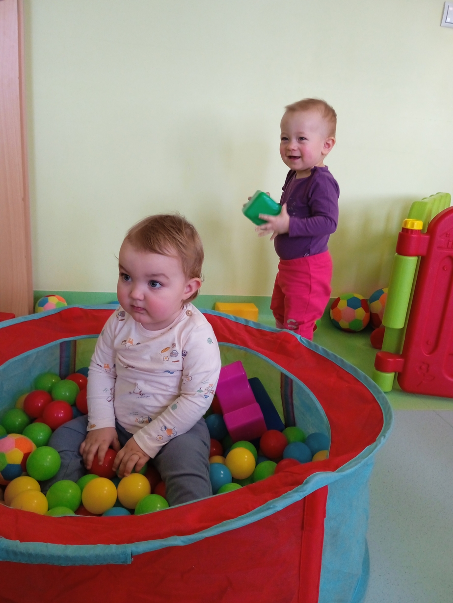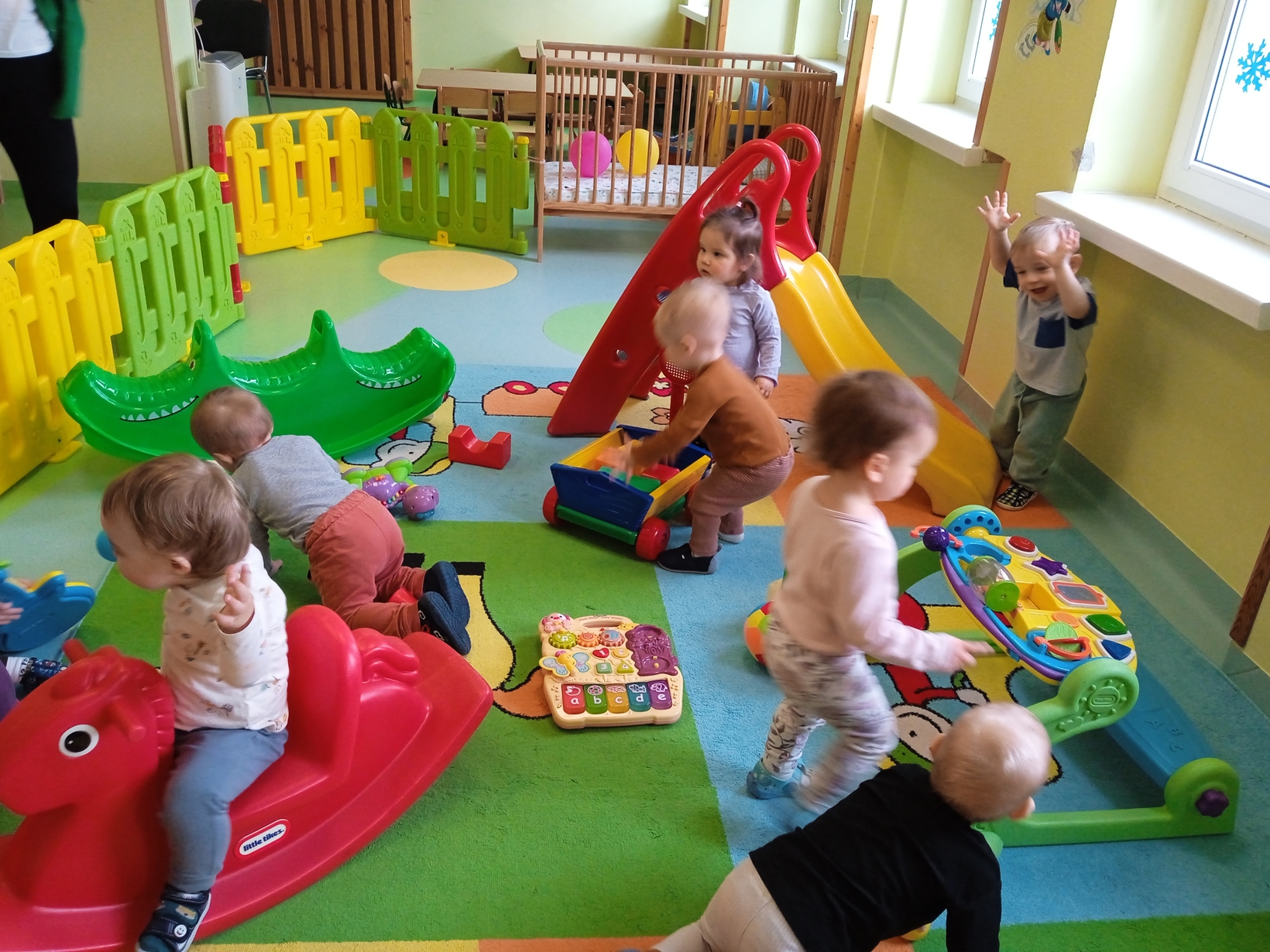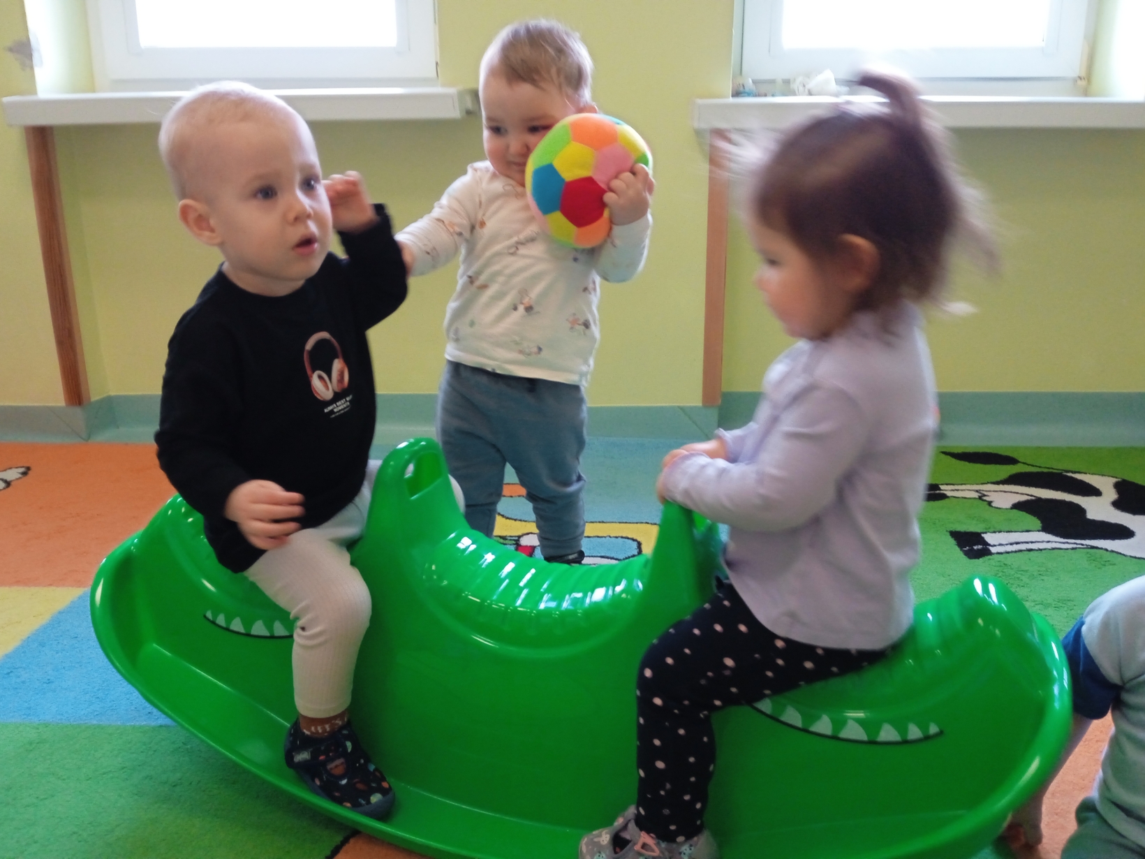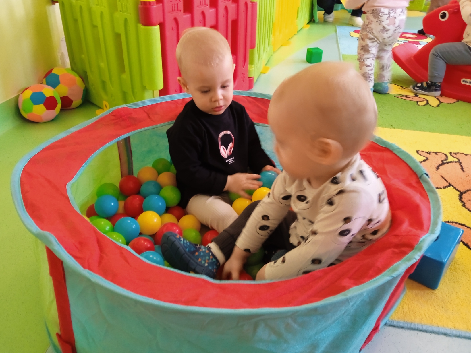 Na zewnątrz deszczowa pogoda. Ciocie urozmaiciły czas dzieciom z grupy ,, Żabki" organizując salę zabaw pełną atrakcji i wesołej zabawy.