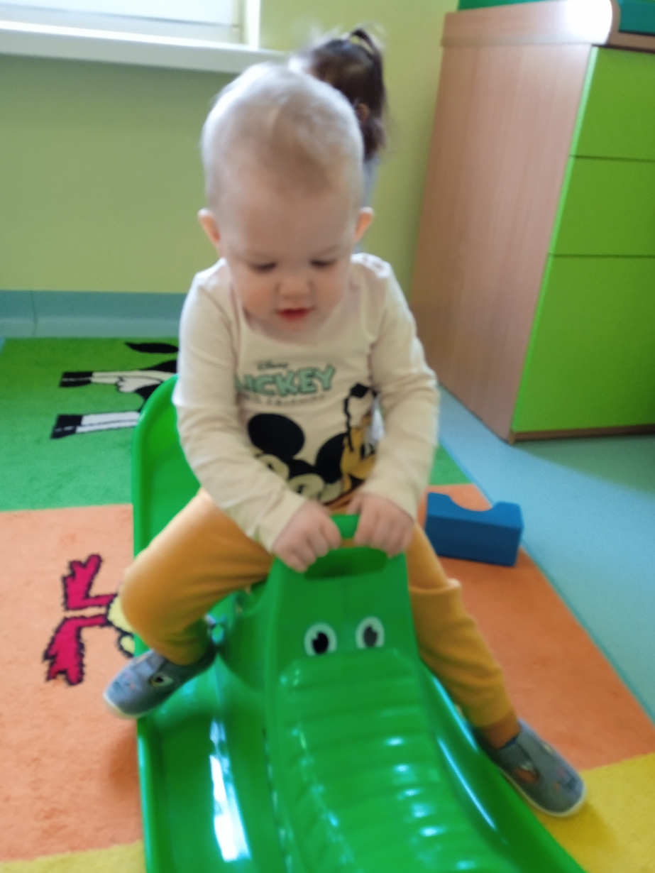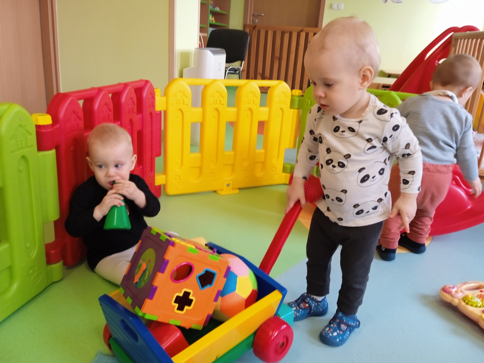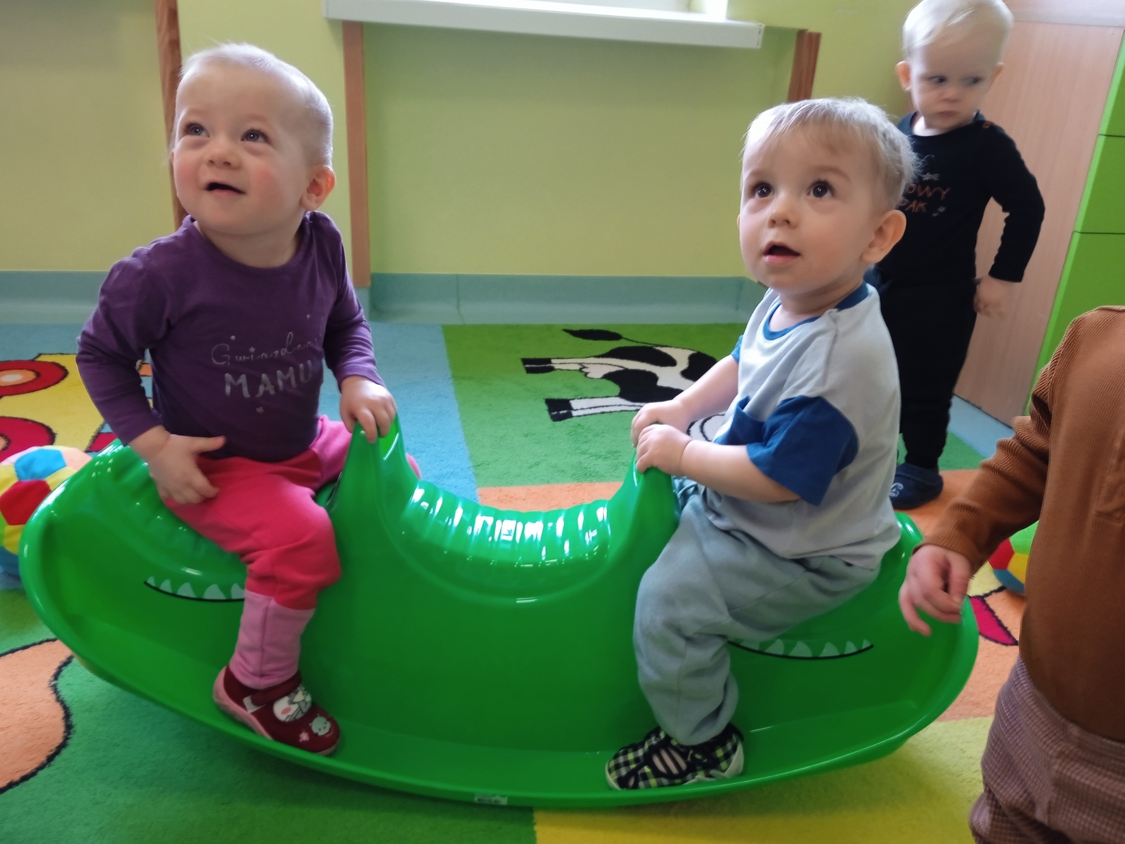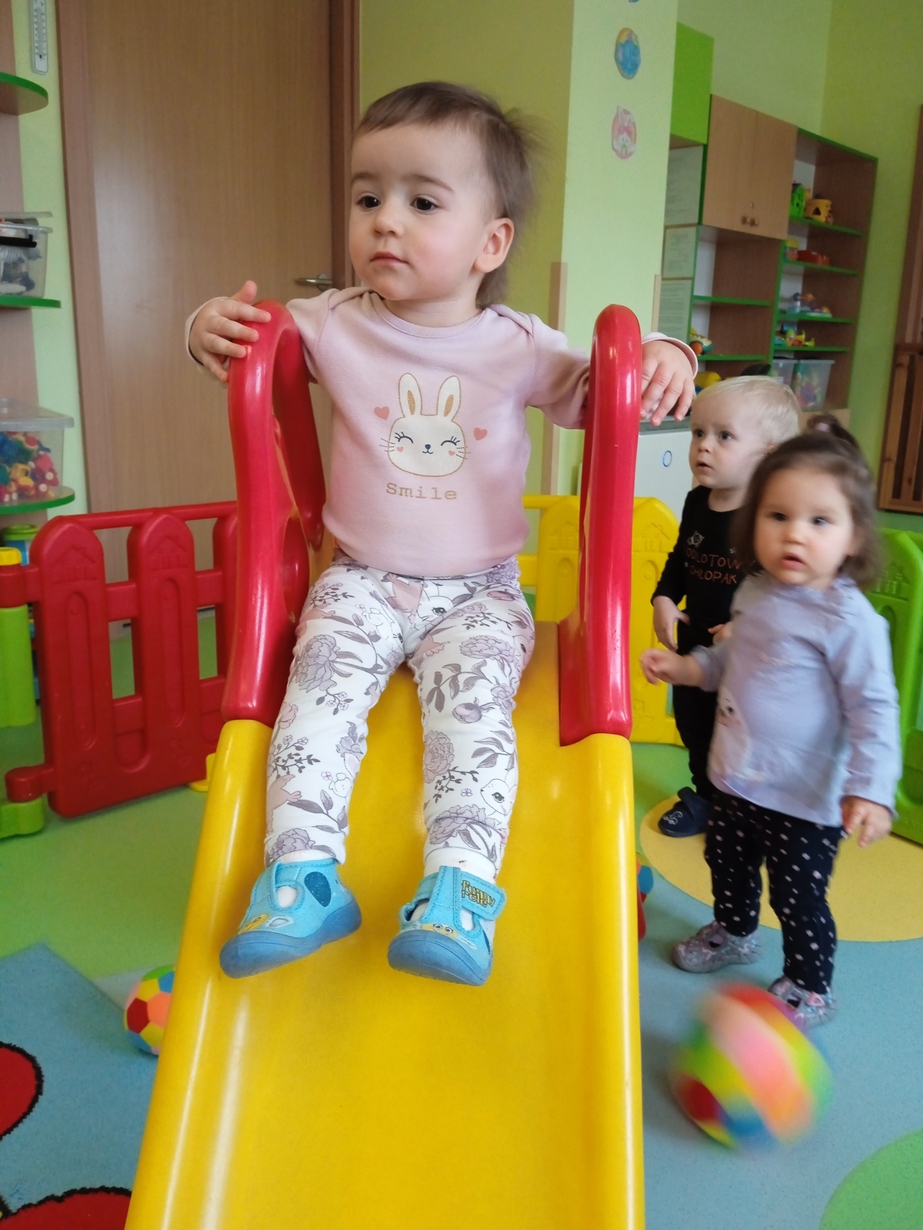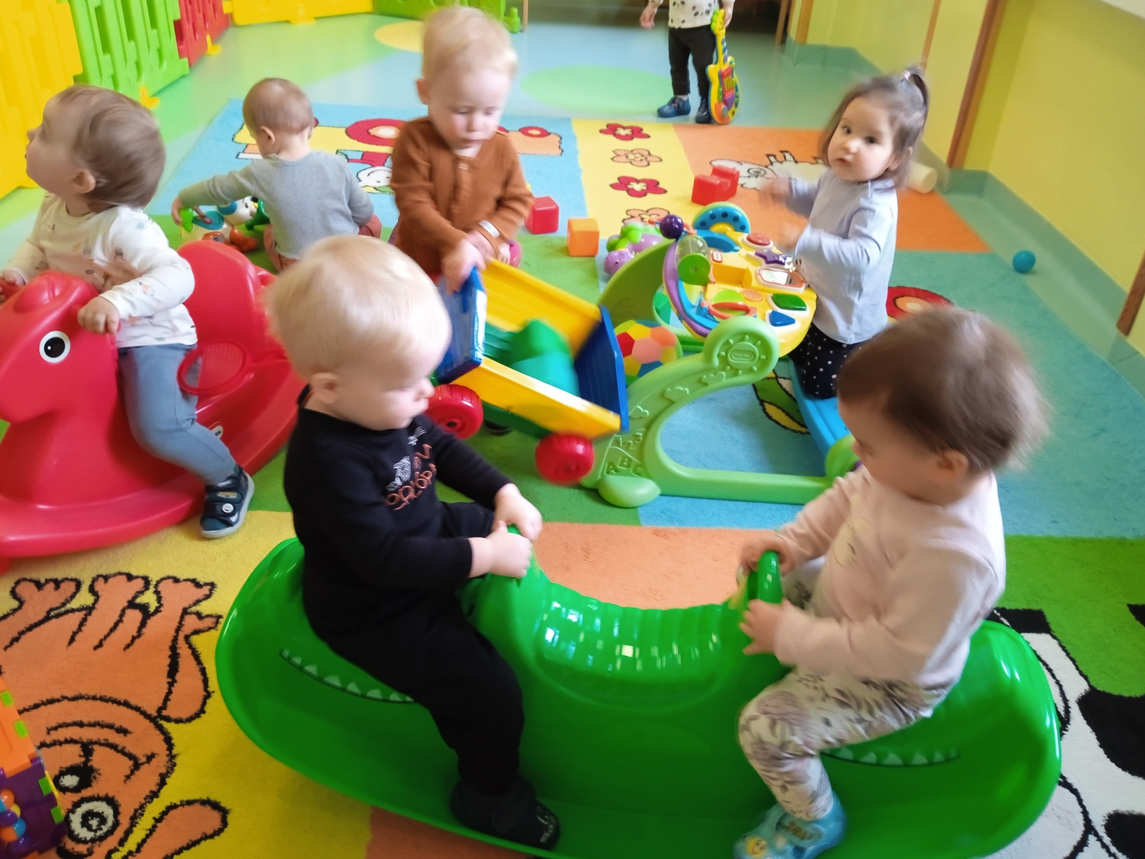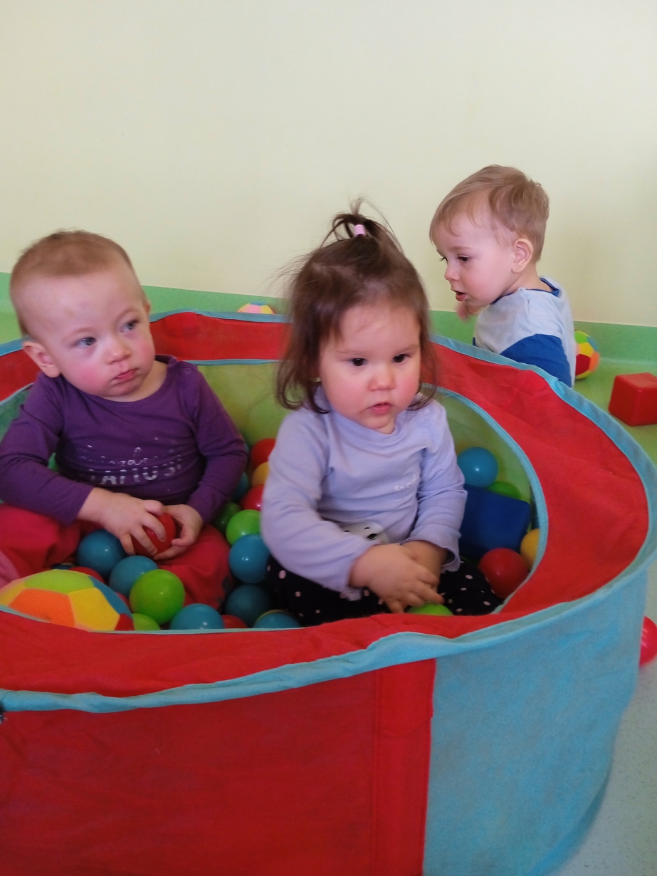 Na zewnątrz deszczowa pogoda. Ciocie urozmaiciły czas dzieciom z grupy ,, Żabki" organizując salę zabaw pełną atrakcji i wesołej zabawy.
