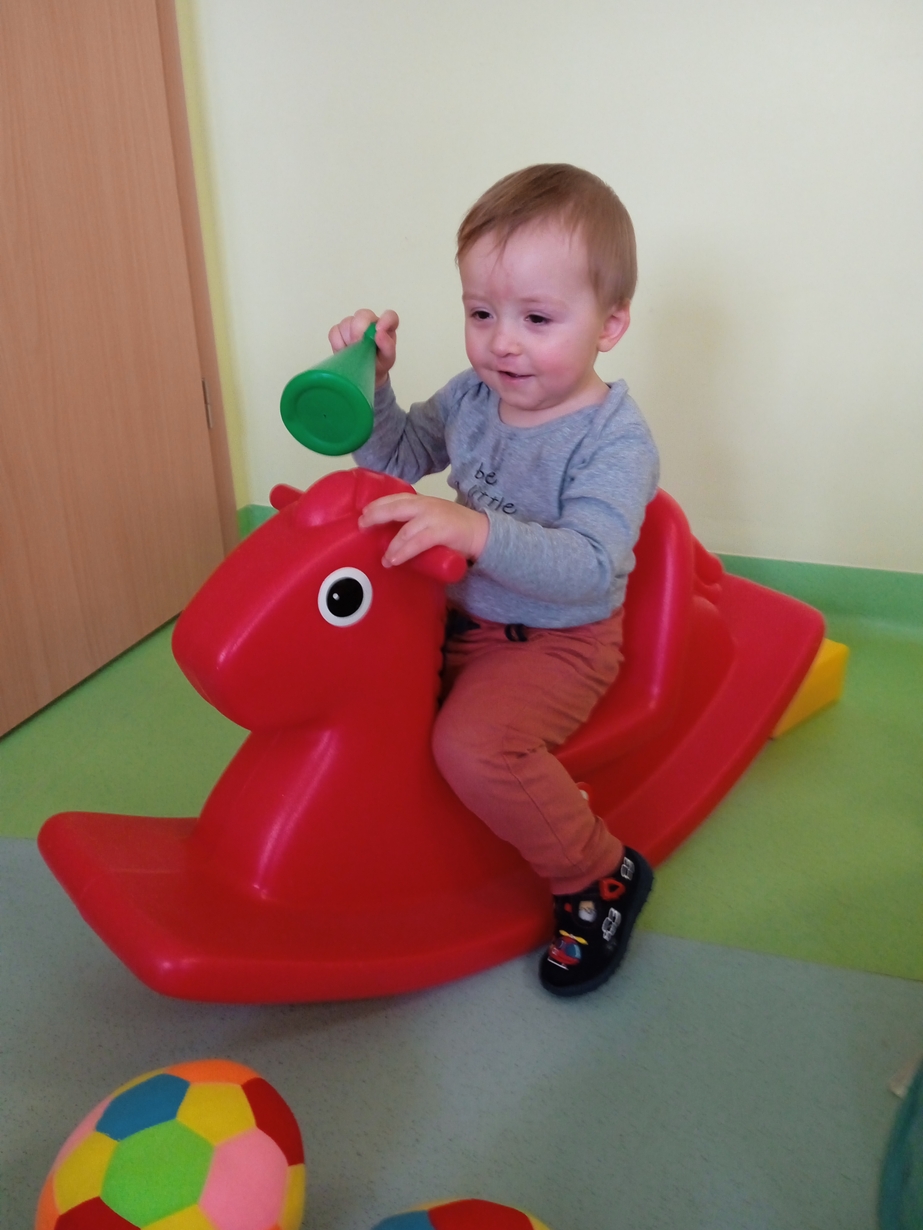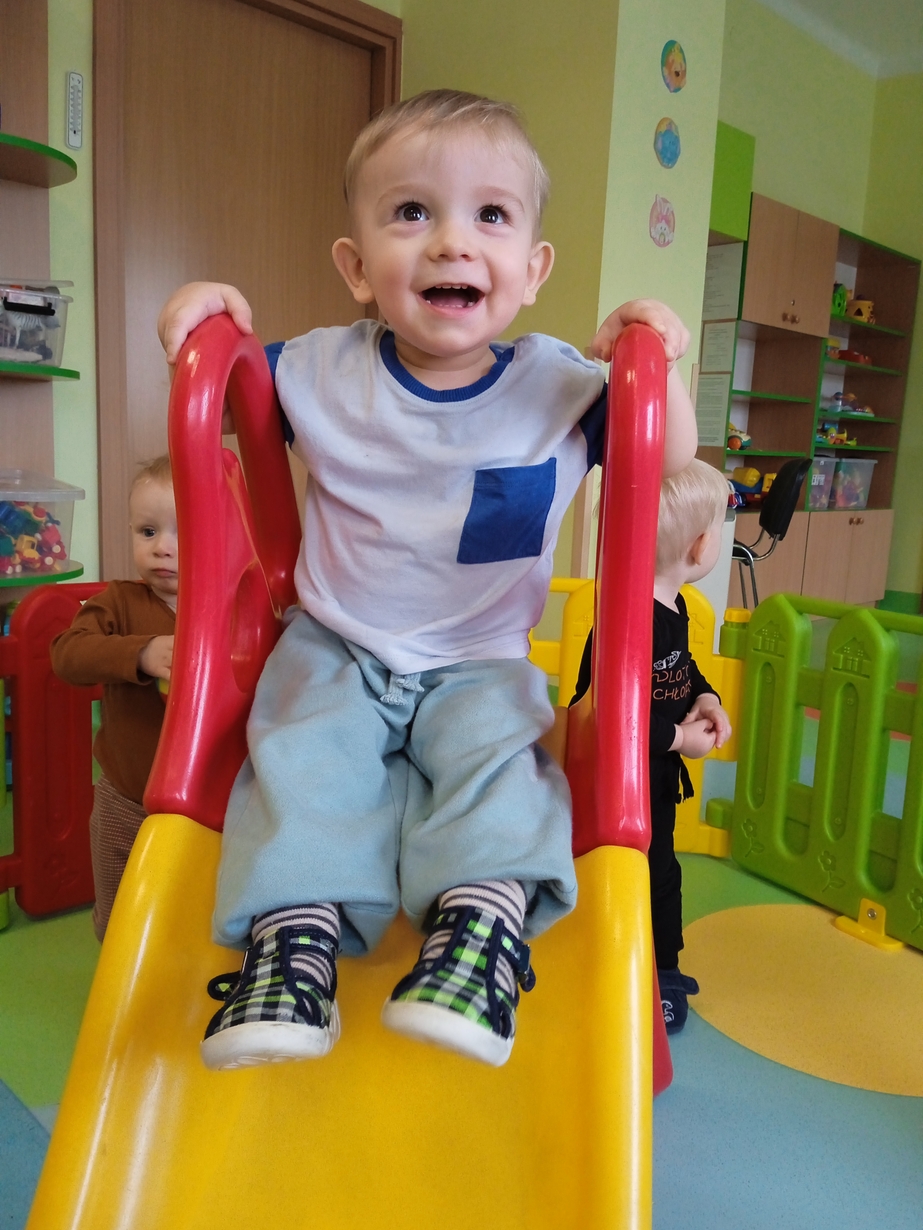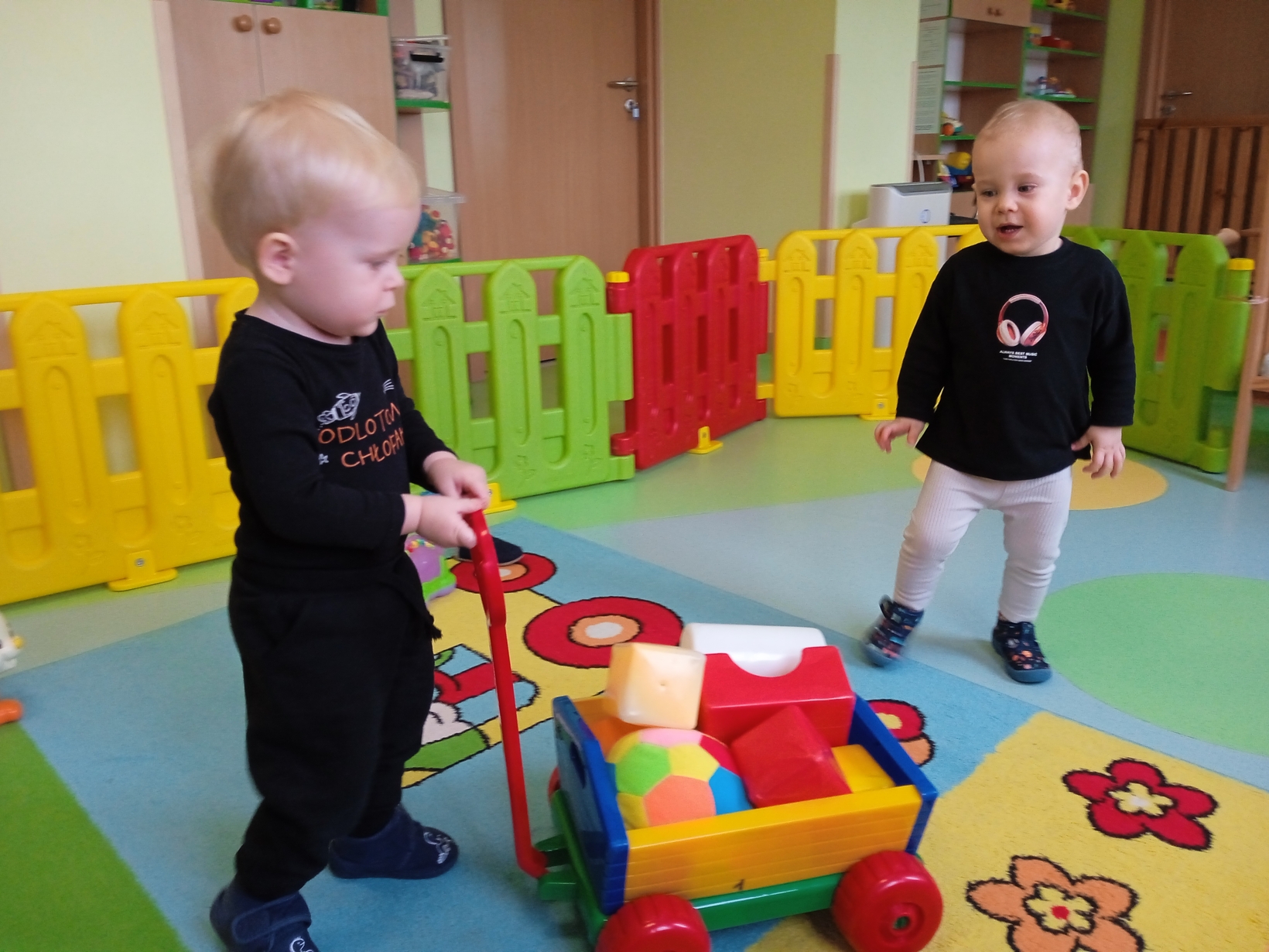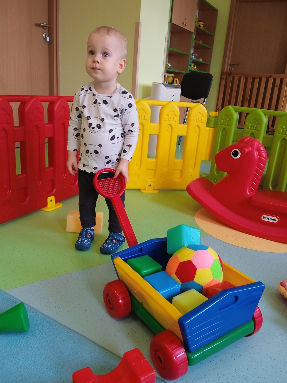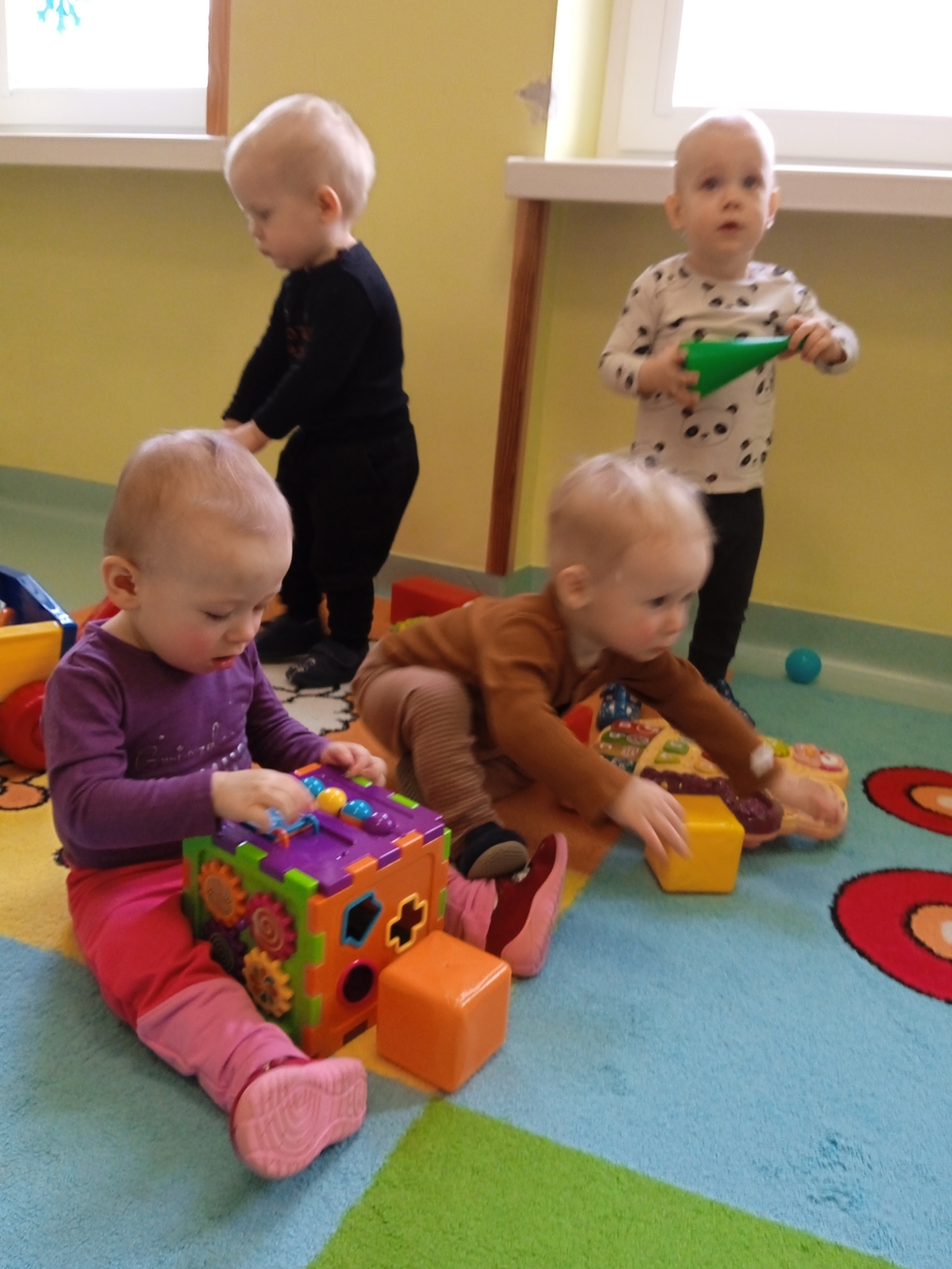 Na zewnątrz deszczowa pogoda. Ciocie urozmaiciły czas dzieciom z grupy ,, Żabki" organizując salę zabaw pełną atrakcji i wesołej zabawy.