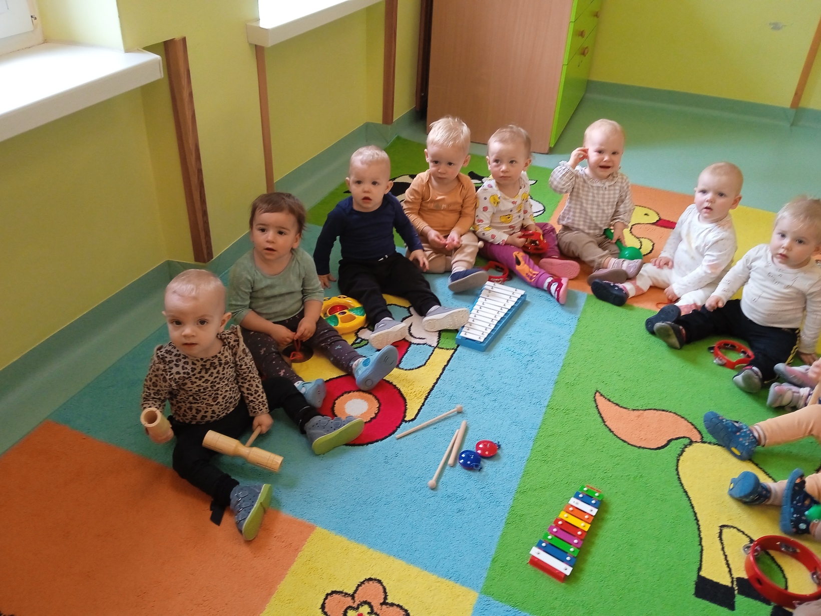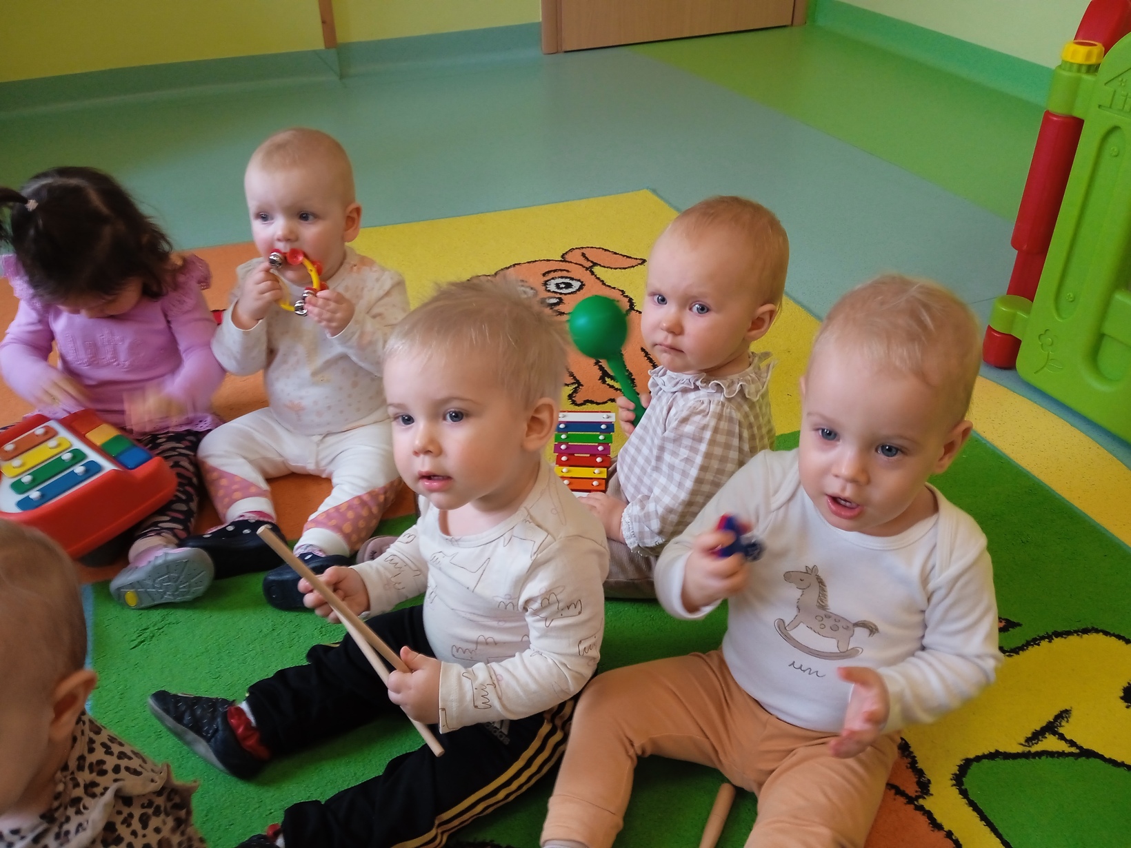 Dzieci z grupy ,,Żabki" miały zajęcia muzyczne.Maluszki zapoznały się z instrumentami muzycznymi, grały na nich ,poznawały jakie wydają dźwięki.