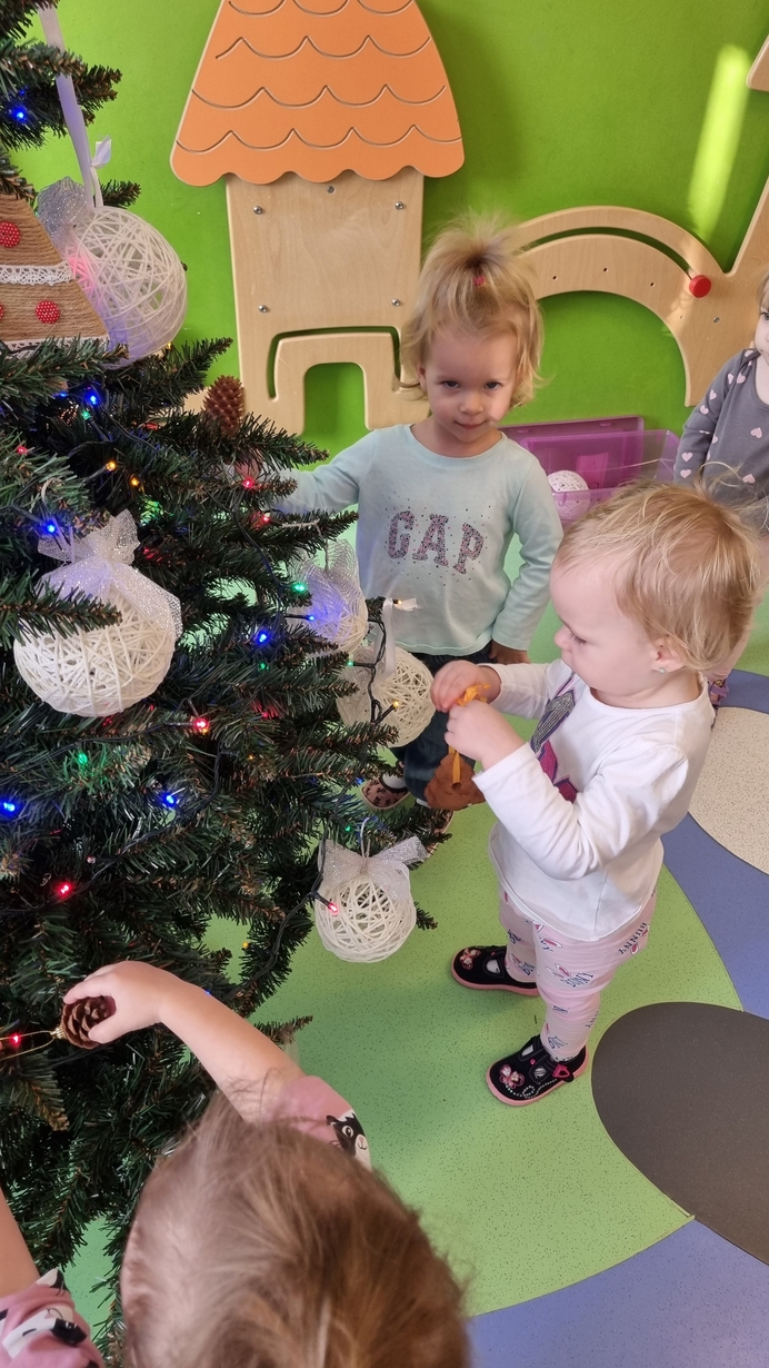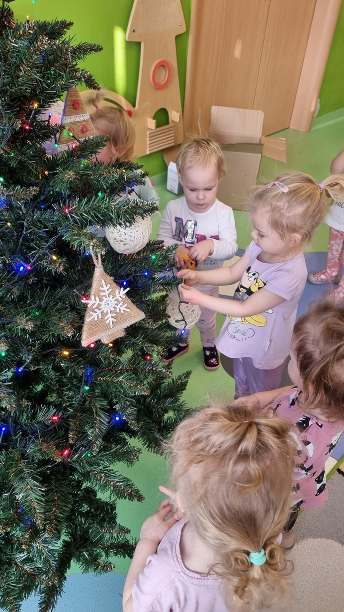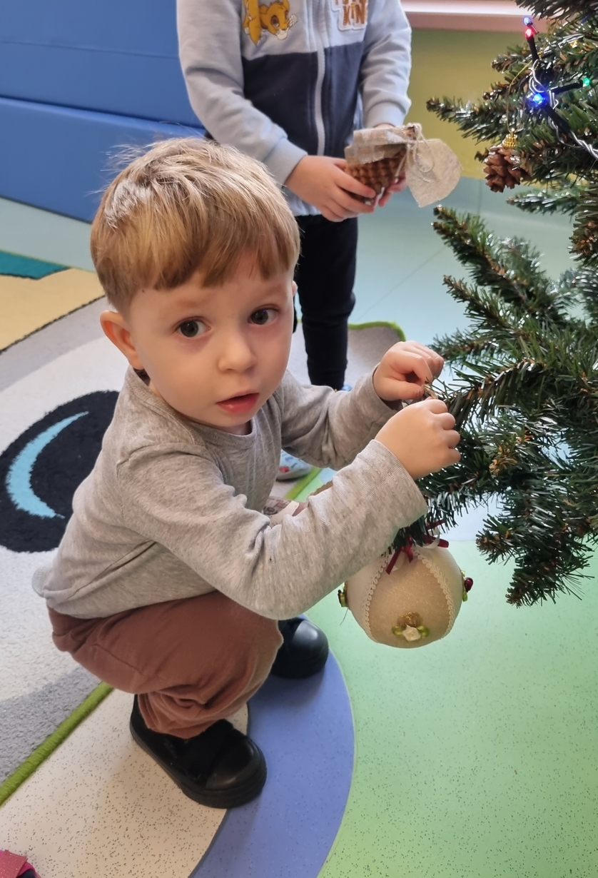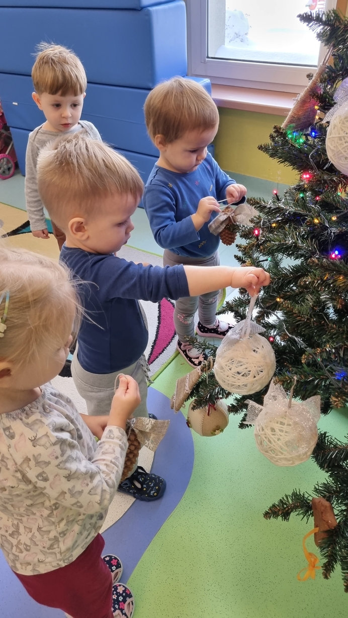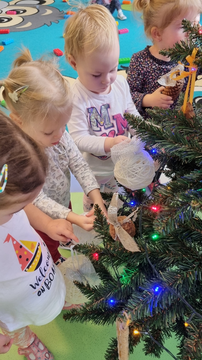 Dzieci z grupy Muchomorów na początku grudnia zaangażowały się w strojenie naszej wspólnej choinki,