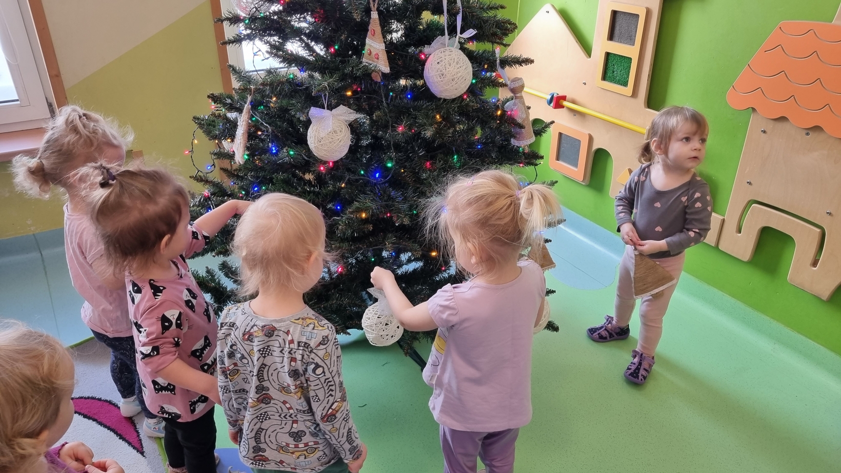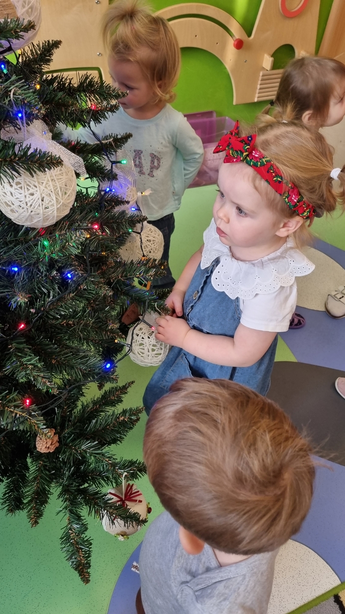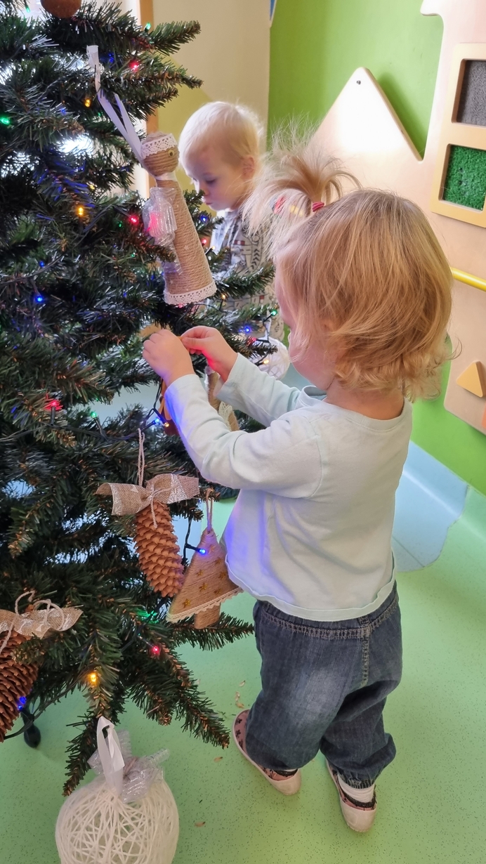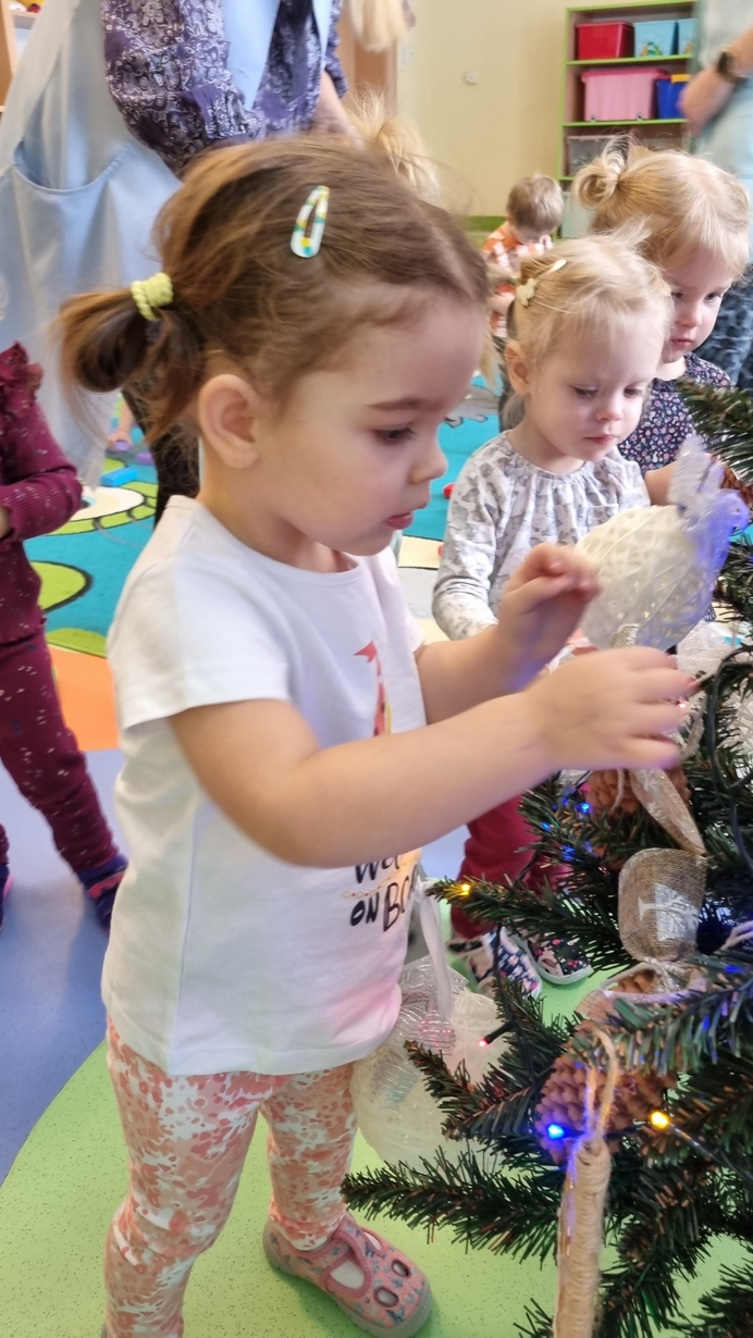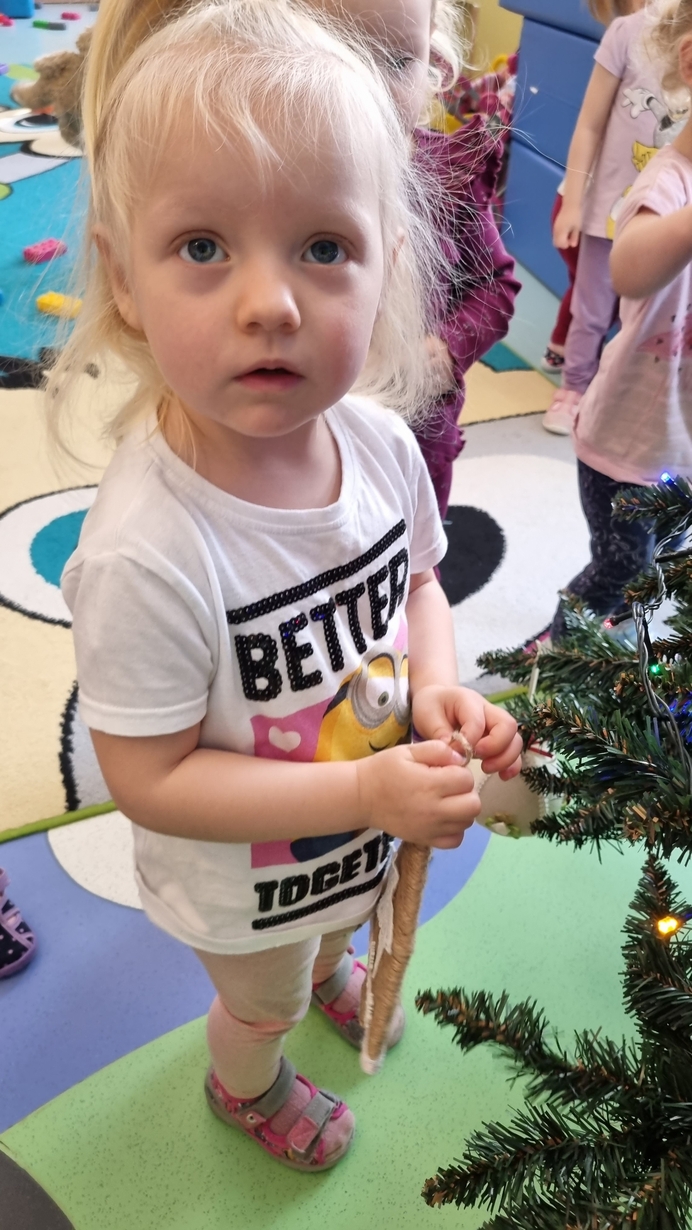 Dzieci z grupy Muchomorów na początku grudnia zaangażowały się w strojenie naszej wspólnej choinki,