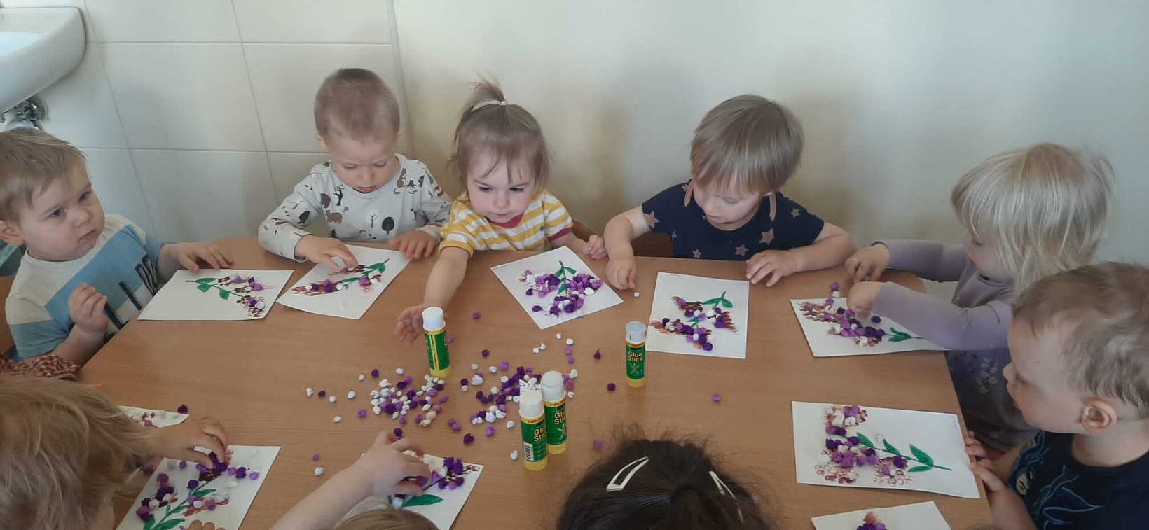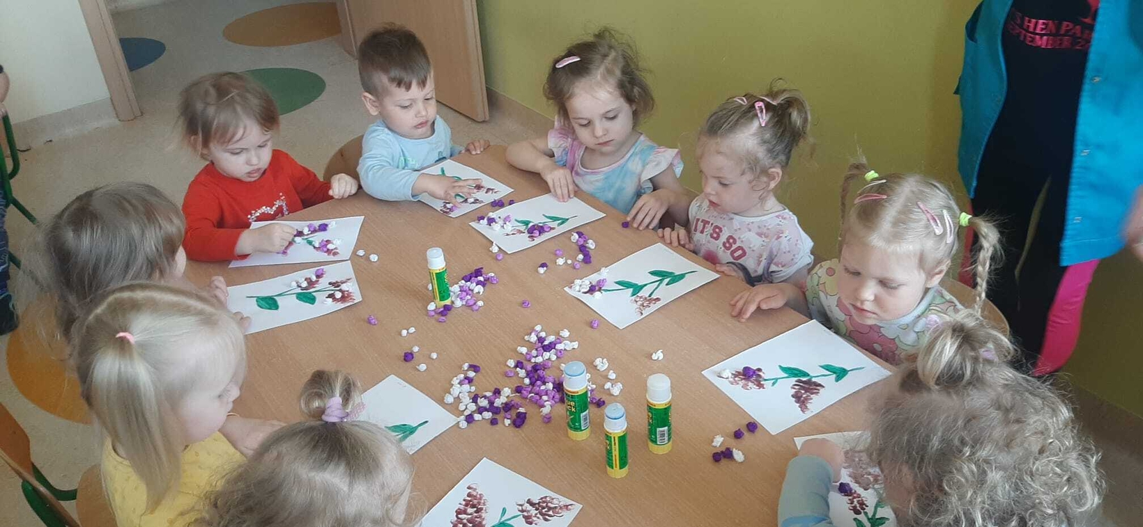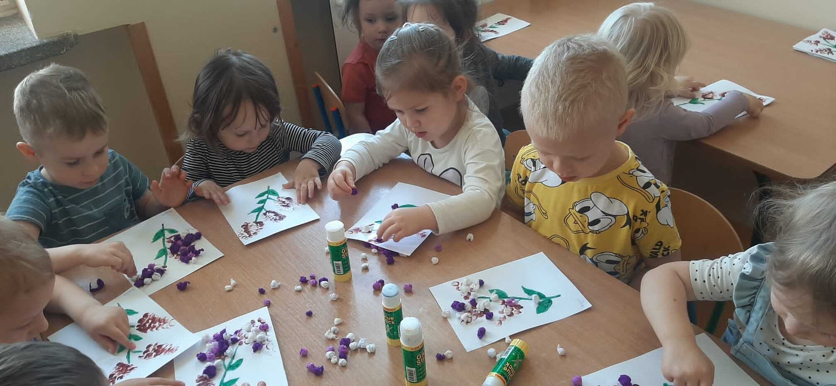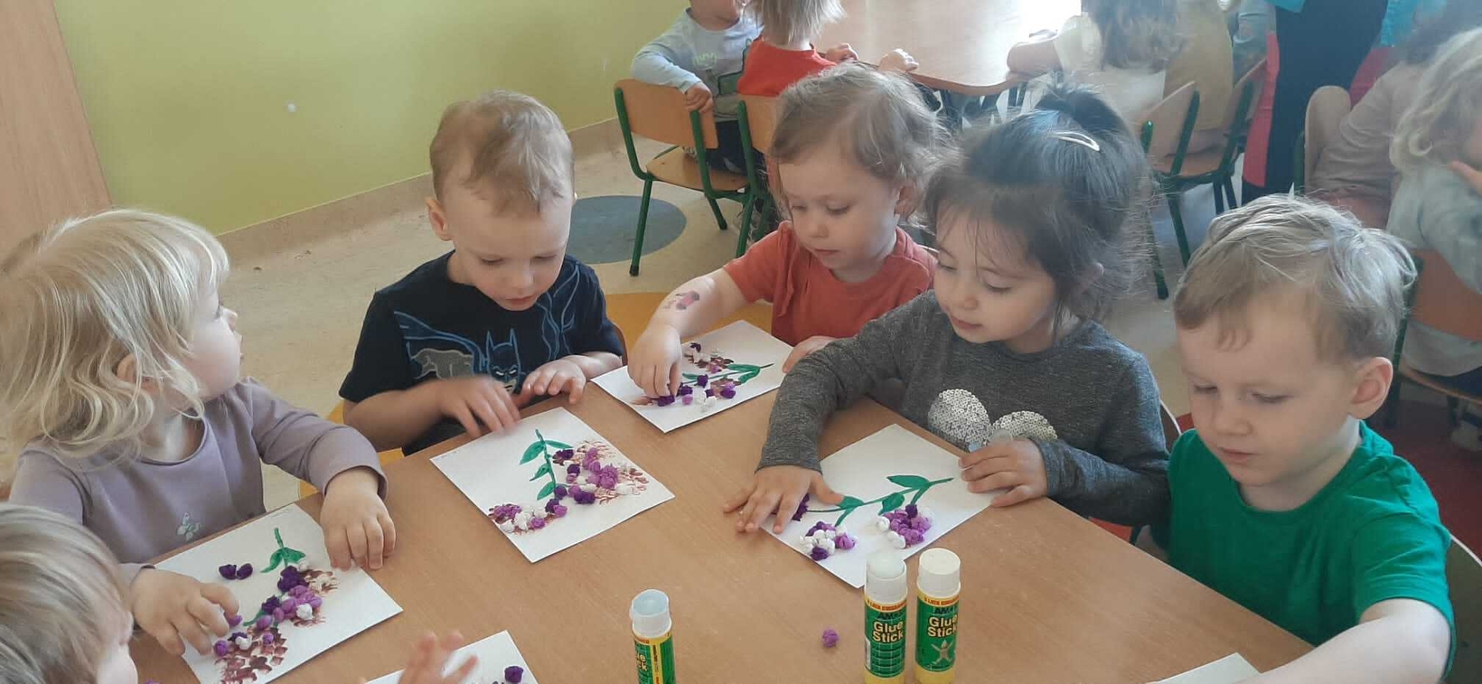 W tym tygodniu dzieci z grupy muchomorki wykonywały piękne bzy. Paluszkami zamoczonymi w farbie odbijały na kartce kształt kwiatka, a także naklejaly kolorowe kuleczki z bibuły.