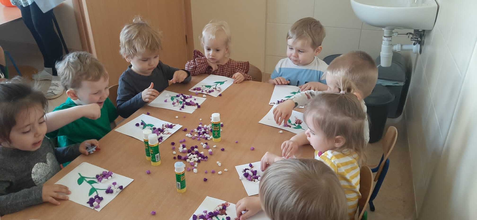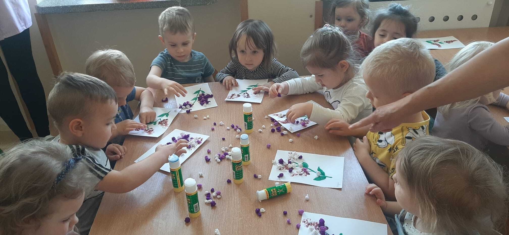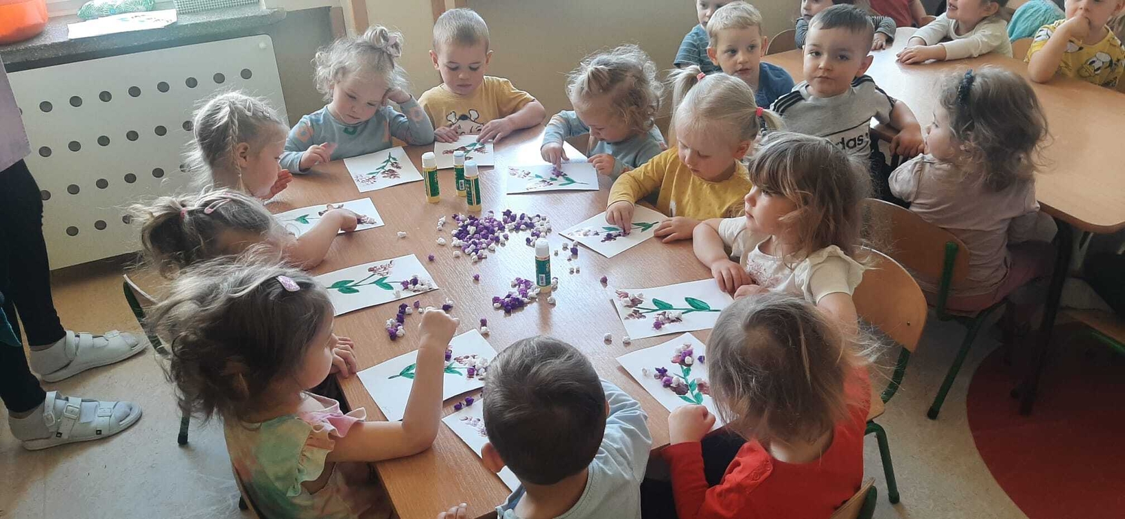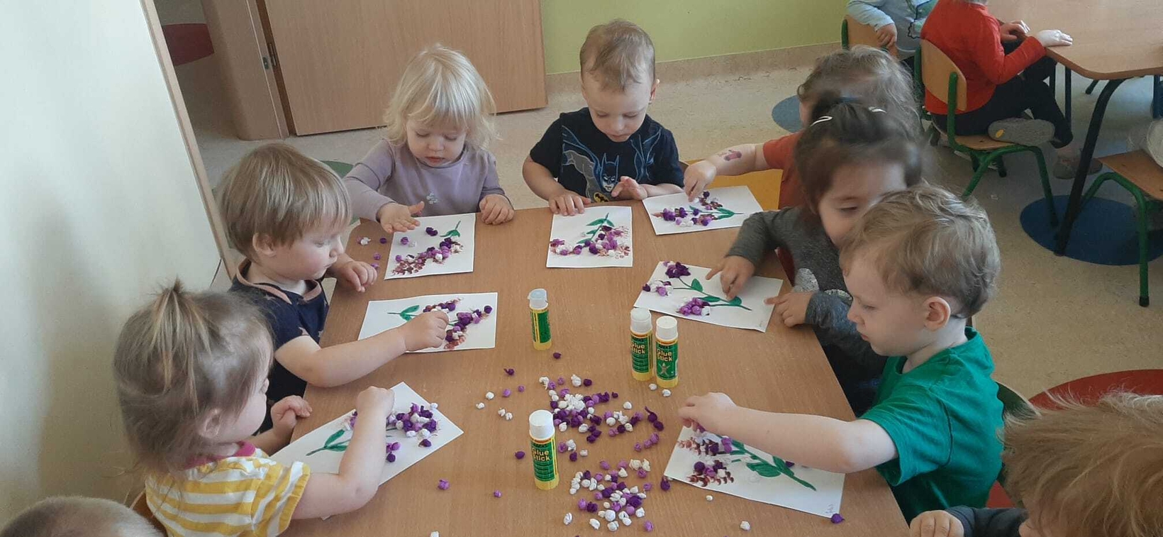 W tym tygodniu dzieci z grupy muchomorki wykonywały piękne bzy. Paluszkami zamoczonymi w farbie odbijały na kartce kształt kwiatka, a także naklejaly kolorowe kuleczki z bibuły.