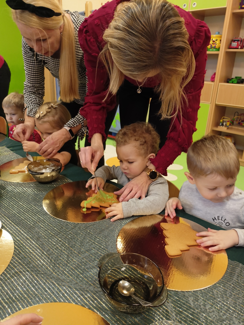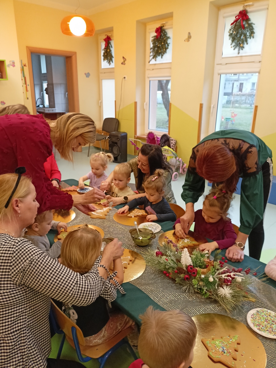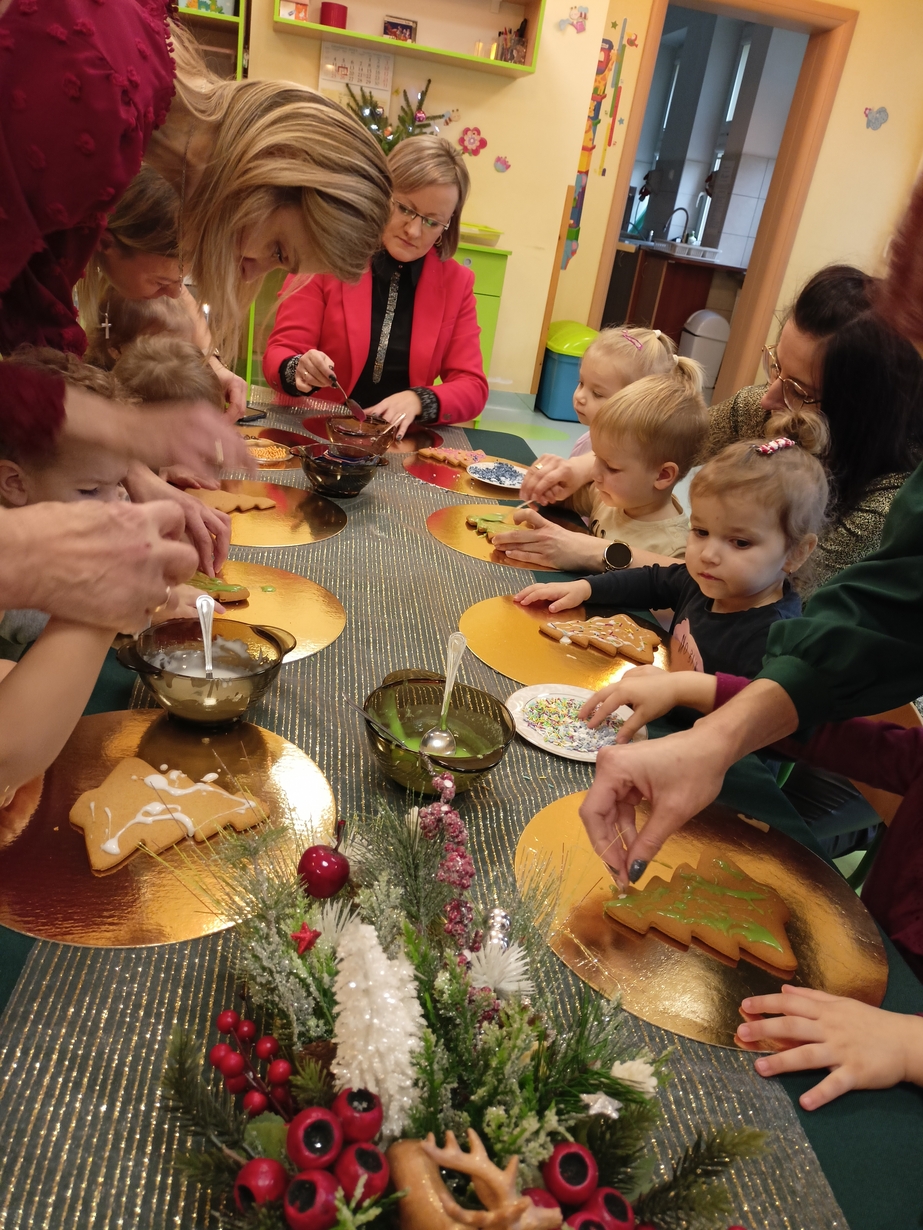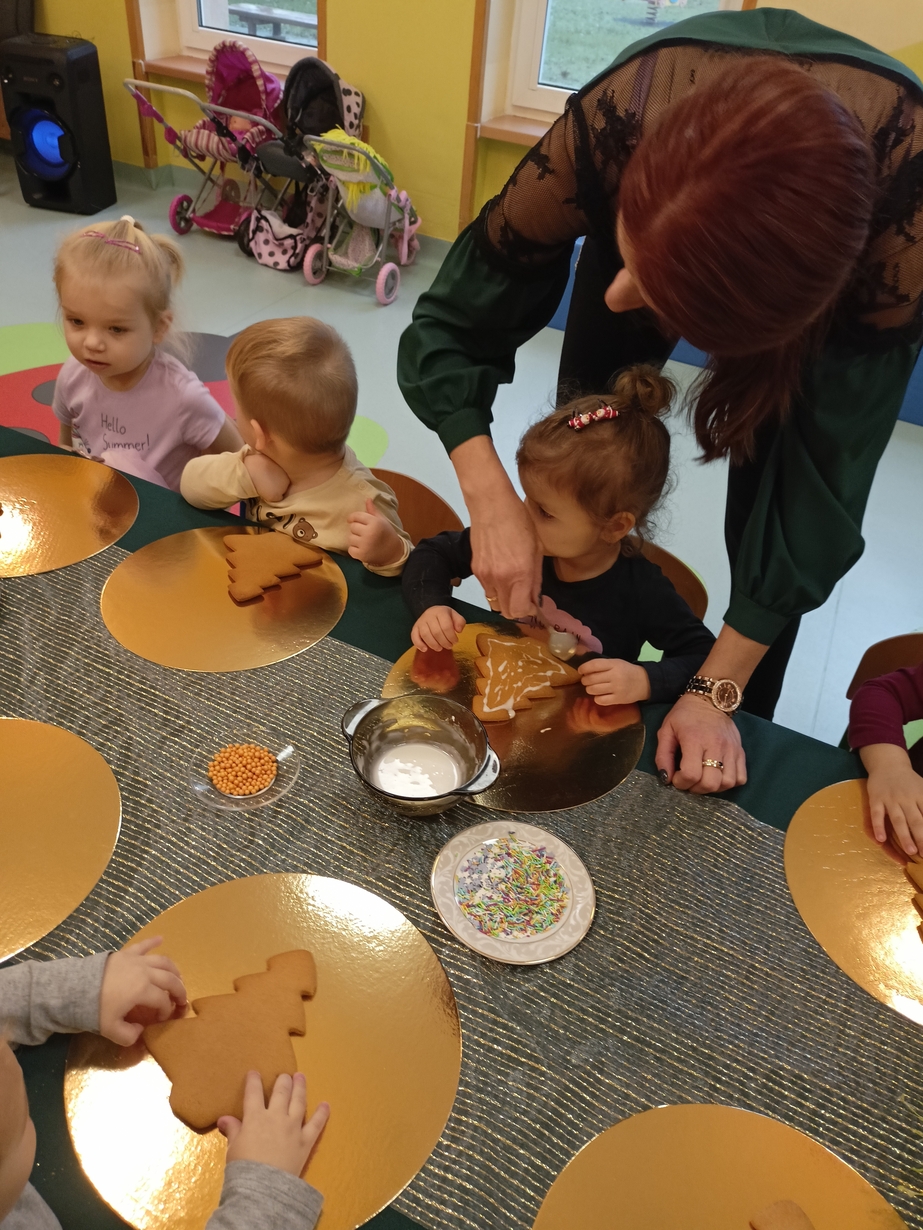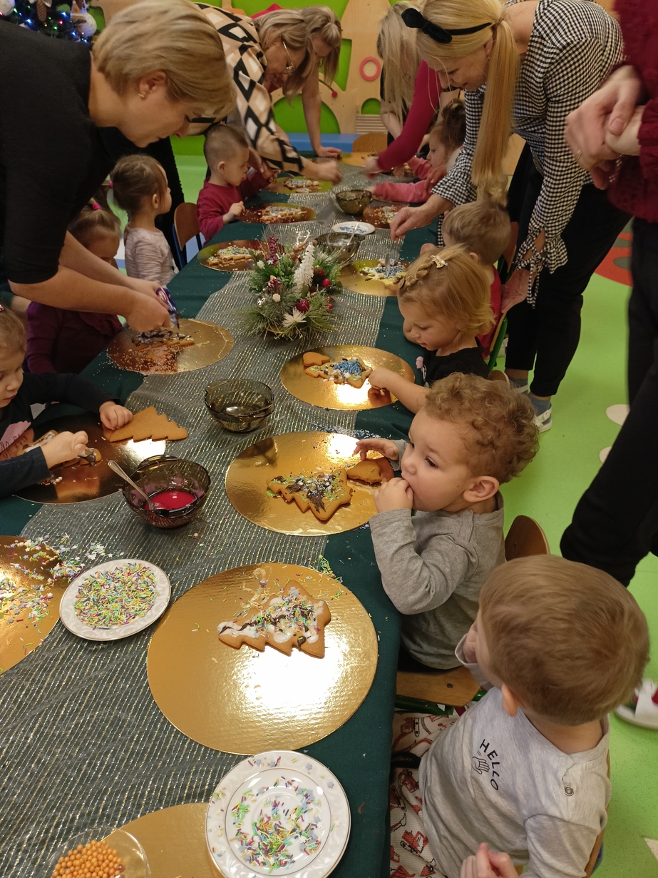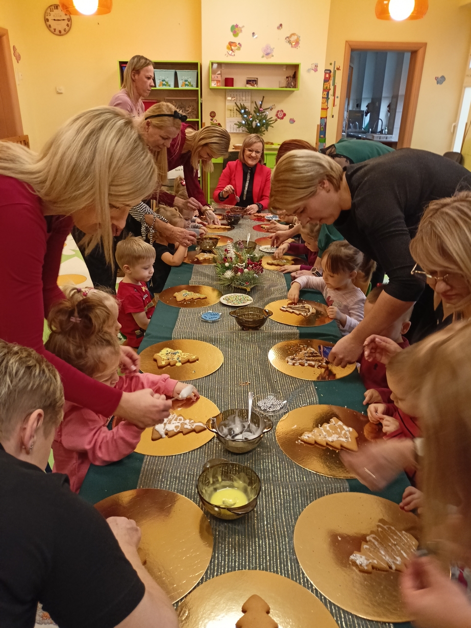 Dzieci z grupy Muchomorów i grupy Pszczółek wraz z Panią Dyrektor oraz ciociami ozdabiały świąteczne pierniczki.