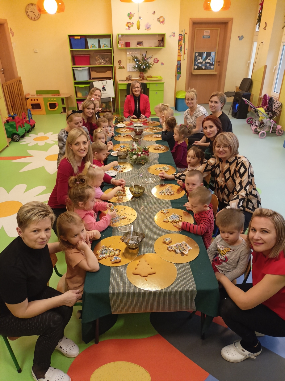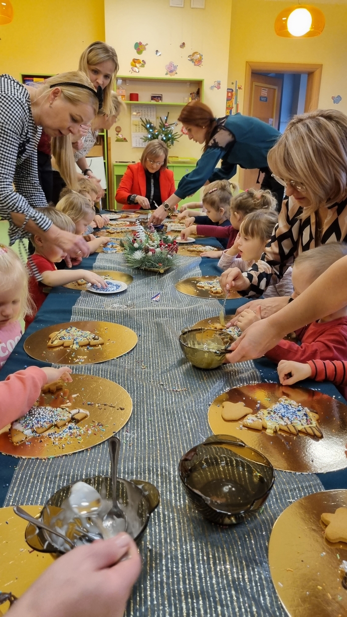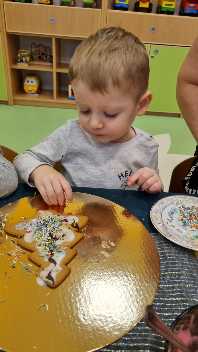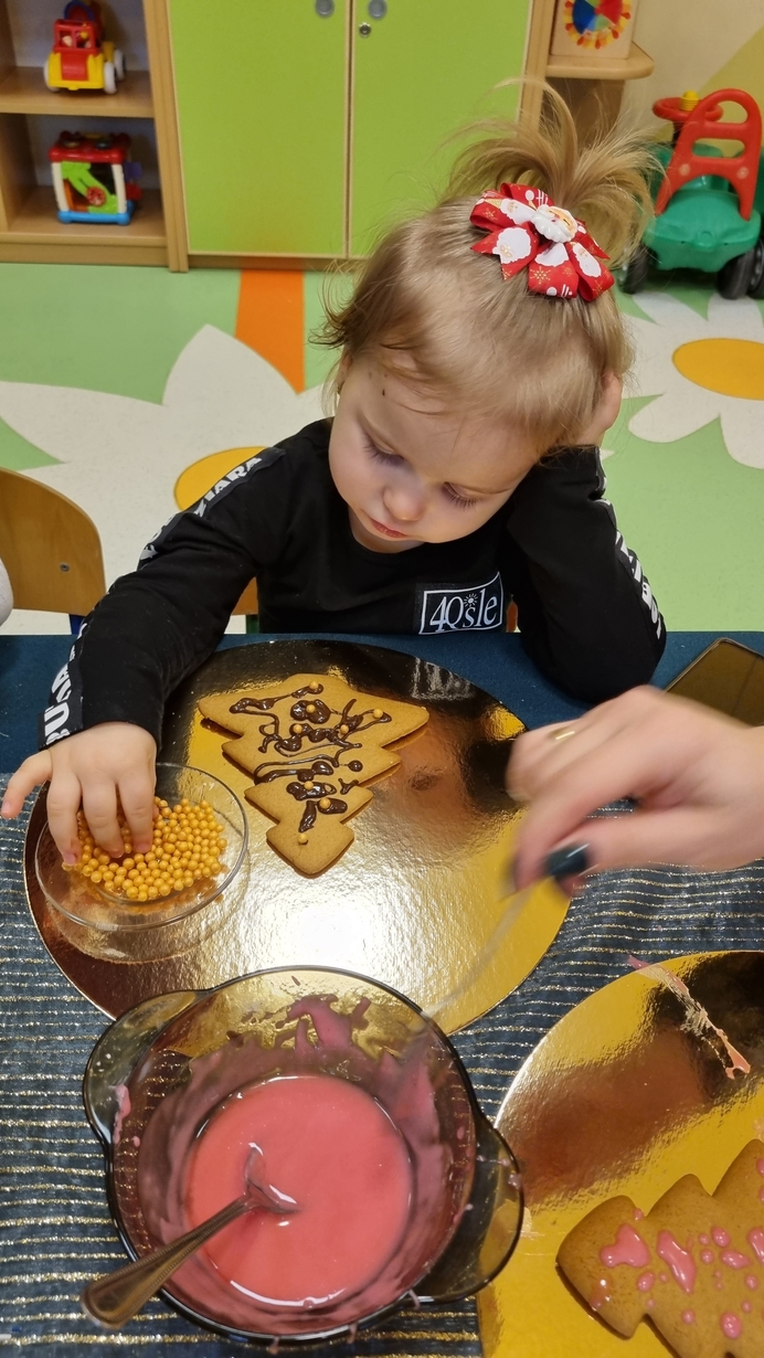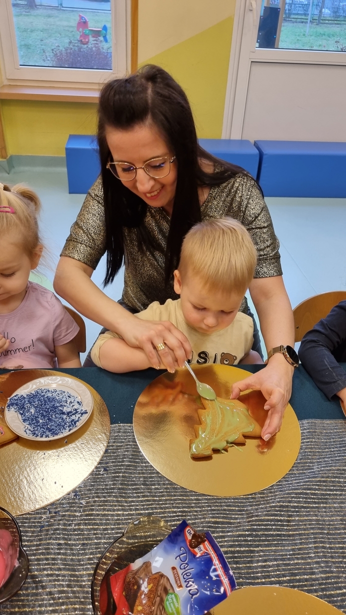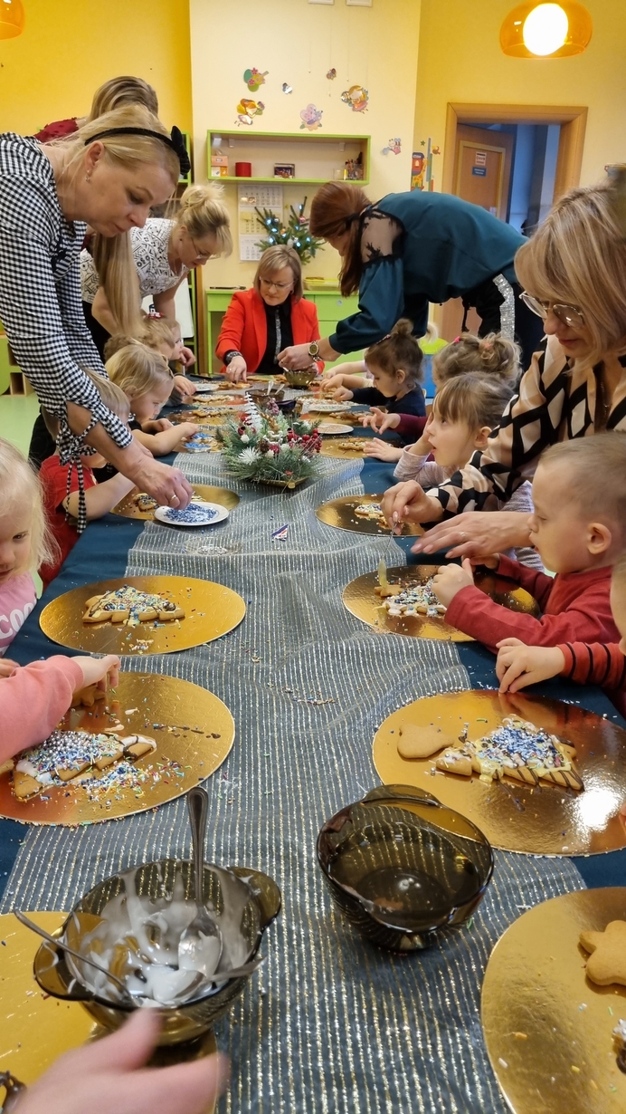 Dzieci z grupy Muchomorów i grupy Pszczółek wraz z Panią Dyrektor oraz ciociami ozdabiały świąteczne pierniczki.